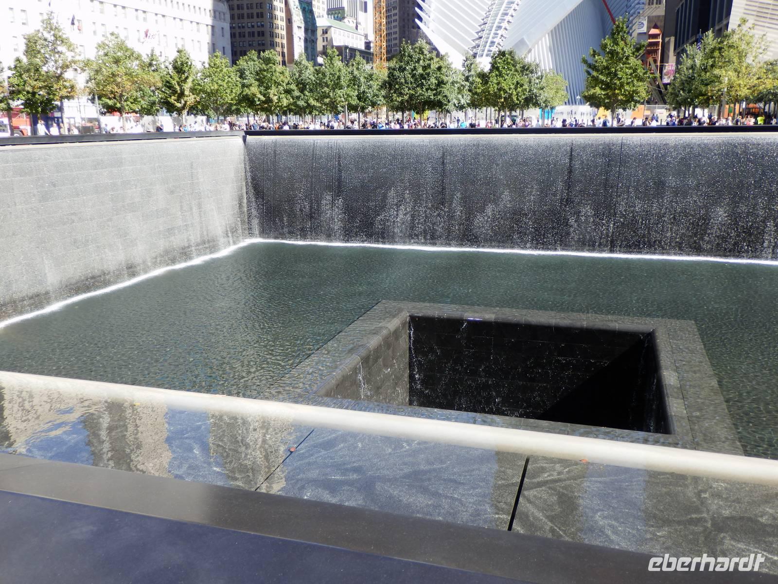 Unsere letzte Station des Tages war der interessante Financial District. Wir besuchten als erstes die St. Pauls Chapel. Hier gab es eine kleine Ausstellung zum 11. September 2001. Hans erzählte uns einige Geschichten zu den dort ausgestellten Bildern und Ausstellungsstücken. Uns allen lief es kalt den Rücken herunter. Es ist unbegreiflich was dieser Tag der Welt genommen hat. Wir verließen die Kirche und erreichten das 9/11 memorial. Die beiden Denkmäler, welche durch 2 Becken dargestellt sind, umfassen genau die Größe, welche auch die beiden Türme des World Trade Centers hatten. Leider hatten wir nur noch wenig Zeit und mussten somit zurück zum Bus.