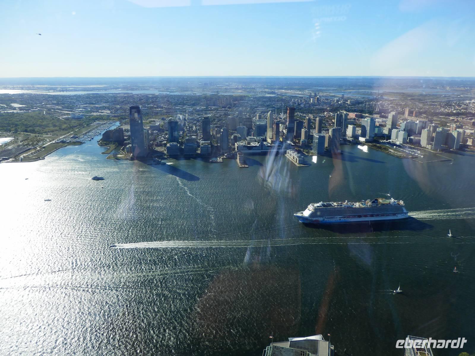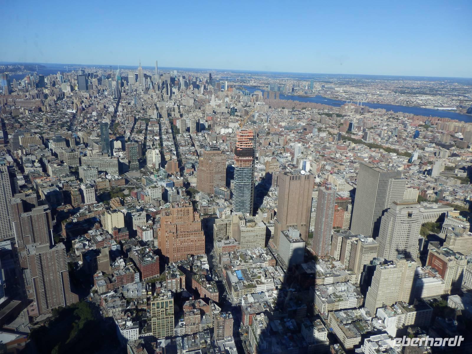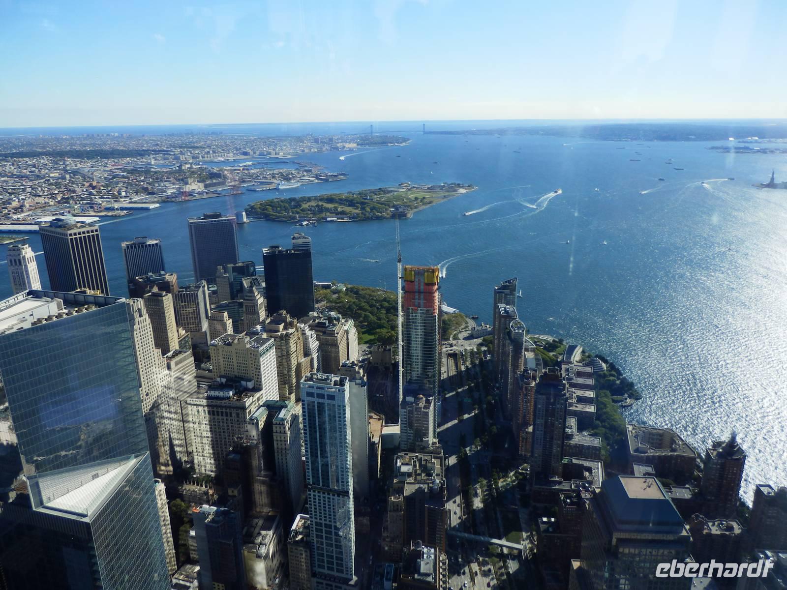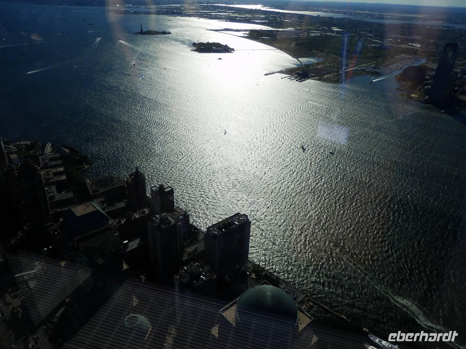 Nun hatte jeder eine Mittagspause und konnte sich stärken - denn es erwartete uns am Nachmittag etwas ganz Großes. Wir besuchten das, erst im Mai eröffnete, One World Trade Center und fuhren auf die Aussichtsblattform dieses beeindruckenden Bauwerkes. Mit seinen 541 Meter Höhe ist es das größte Gebäude New Yorks und das Vierthöchste der Welt. Es wurde nicht ohne Grund so hoch gebaut. Umgerechnet hat es eine Höhe von genau 1776 Fuß, welche sich auf die Unabhängigkeitserklärung der Vereinigten Staaten von Amerika im Jahre 1776 bezieht. Es eröffnete sich uns ein gigantischer Ausblick. Das Wetter meinte es gut mit uns und der blaue Himmel und die Sonne ließen es zu einem unvergesslichen Augenblick werden.