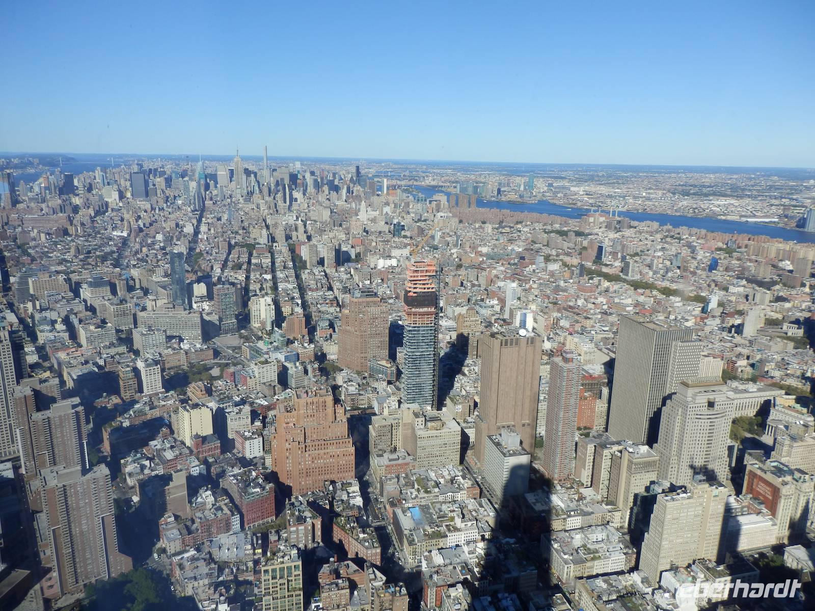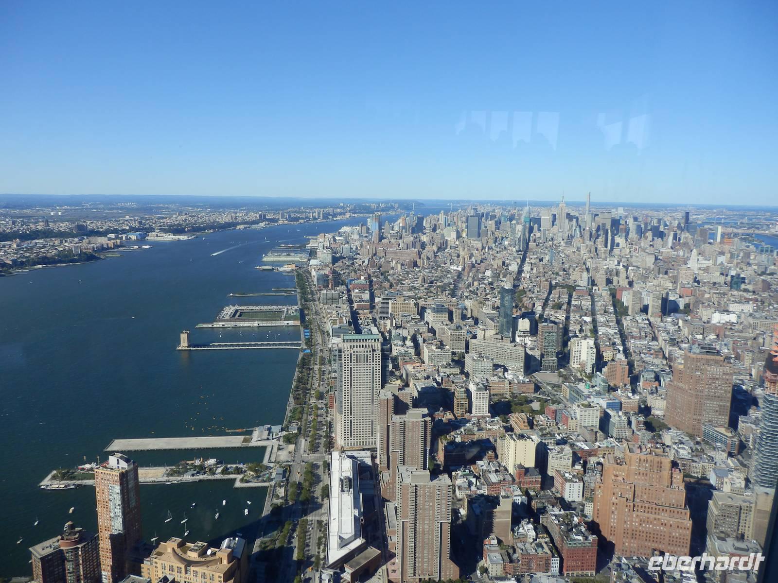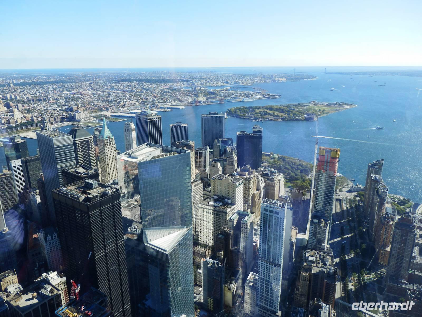 Nun hatte jeder eine Mittagspause und konnte sich stärken - denn es erwartete uns am Nachmittag etwas ganz Großes. Wir besuchten das, erst im Mai eröffnete, One World Trade Center und fuhren auf die Aussichtsblattform dieses beeindruckenden Bauwerkes. Mit seinen 541 Meter Höhe ist es das größte Gebäude New Yorks und das Vierthöchste der Welt. Es wurde nicht ohne Grund so hoch gebaut. Umgerechnet hat es eine Höhe von genau 1776 Fuß, welche sich auf die Unabhängigkeitserklärung der Vereinigten Staaten von Amerika im Jahre 1776 bezieht. Es eröffnete sich uns ein gigantischer Ausblick. Das Wetter meinte es gut mit uns und der blaue Himmel und die Sonne ließen es zu einem unvergesslichen Augenblick werden.