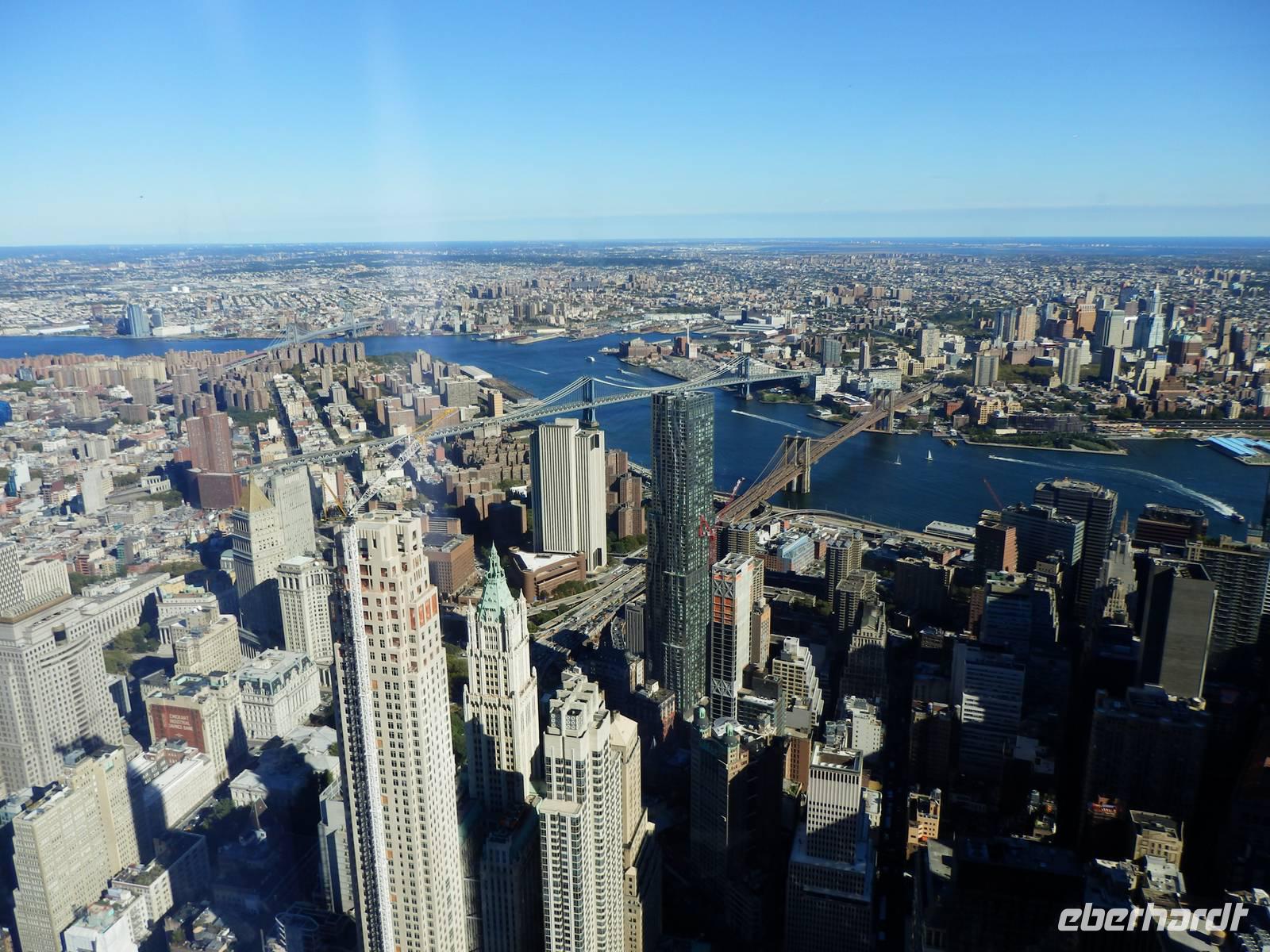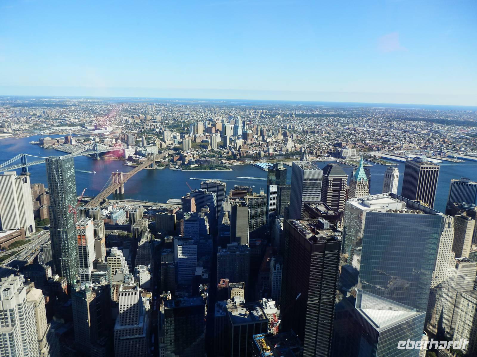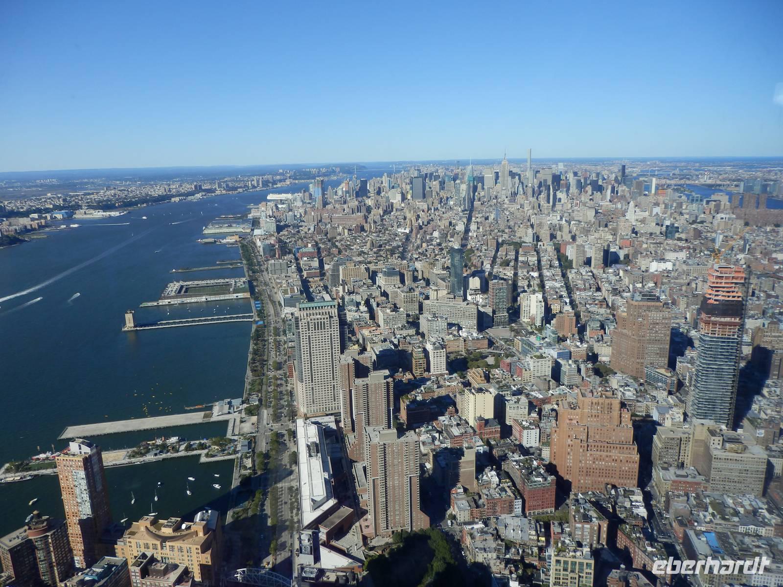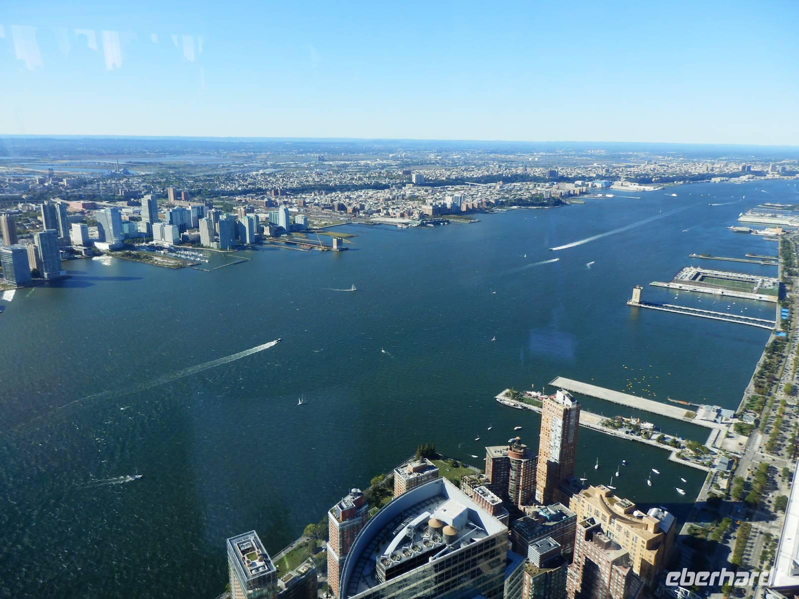 Nun hatte jeder eine Mittagspause und konnte sich stärken - denn es erwartete uns am Nachmittag etwas ganz Großes. Wir besuchten das, erst im Mai eröffnete, One World Trade Center und fuhren auf die Aussichtsblattform dieses beeindruckenden Bauwerkes. Mit seinen 541 Meter Höhe ist es das größte Gebäude New Yorks und das Vierthöchste der Welt. Es wurde nicht ohne Grund so hoch gebaut. Umgerechnet hat es eine Höhe von genau 1776 Fuß, welche sich auf die Unabhängigkeitserklärung der Vereinigten Staaten von Amerika im Jahre 1776 bezieht. Es eröffnete sich uns ein gigantischer Ausblick. Das Wetter meinte es gut mit uns und der blaue Himmel und die Sonne ließen es zu einem unvergesslichen Augenblick werden.