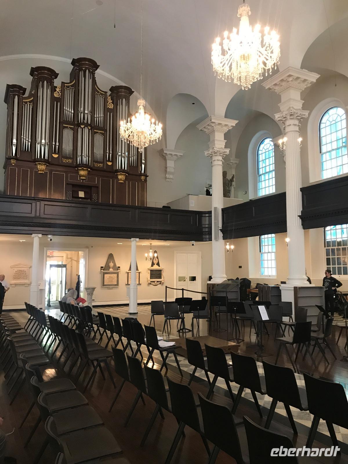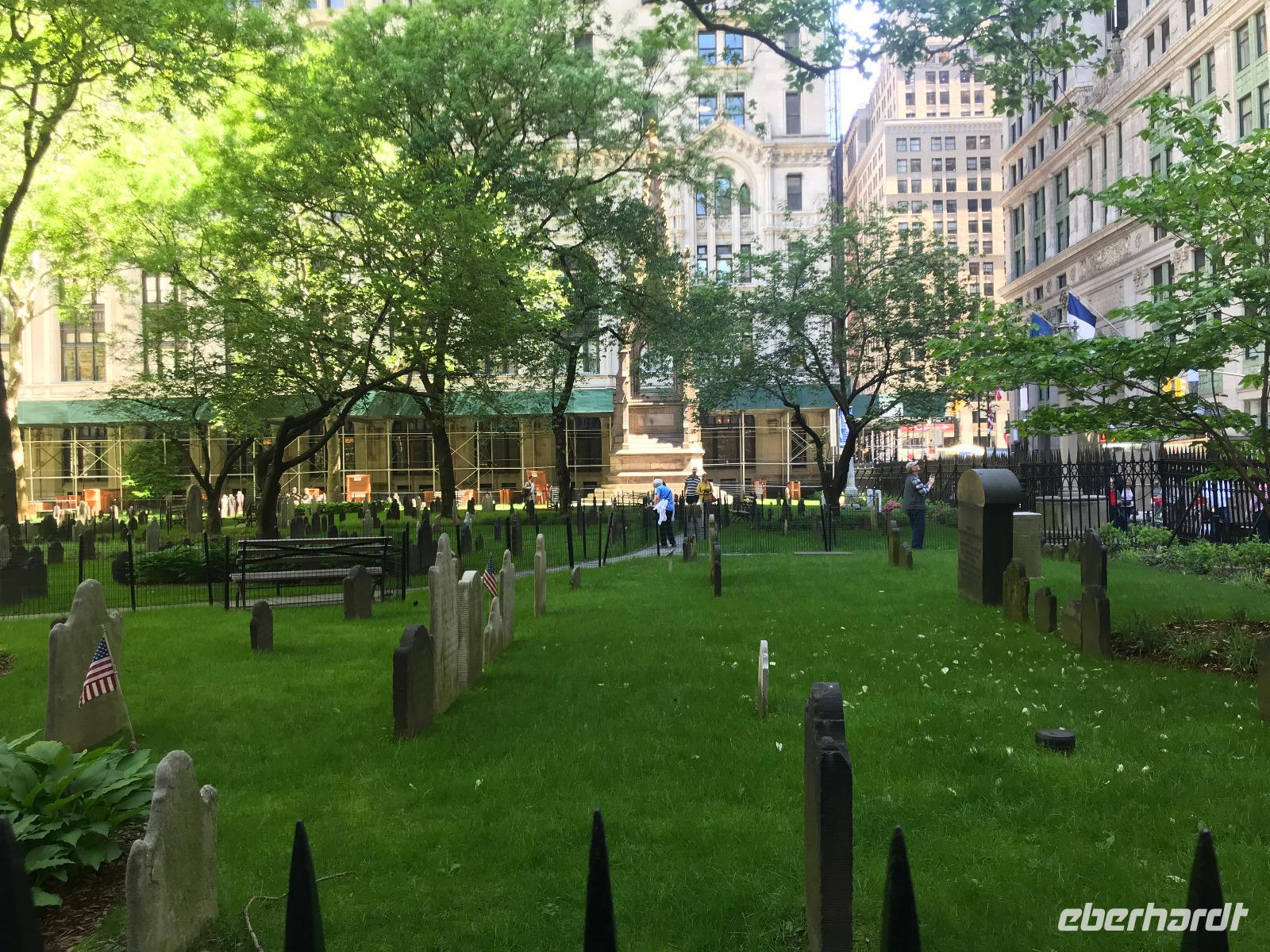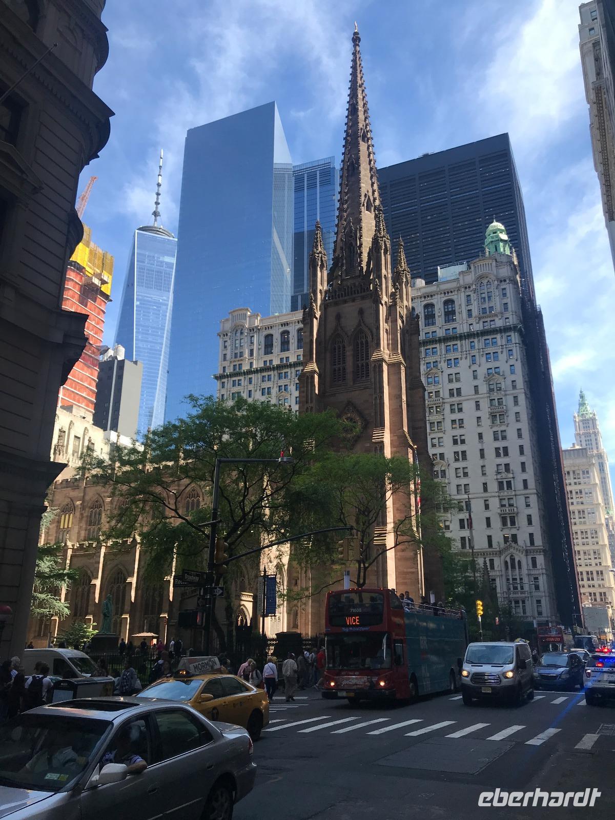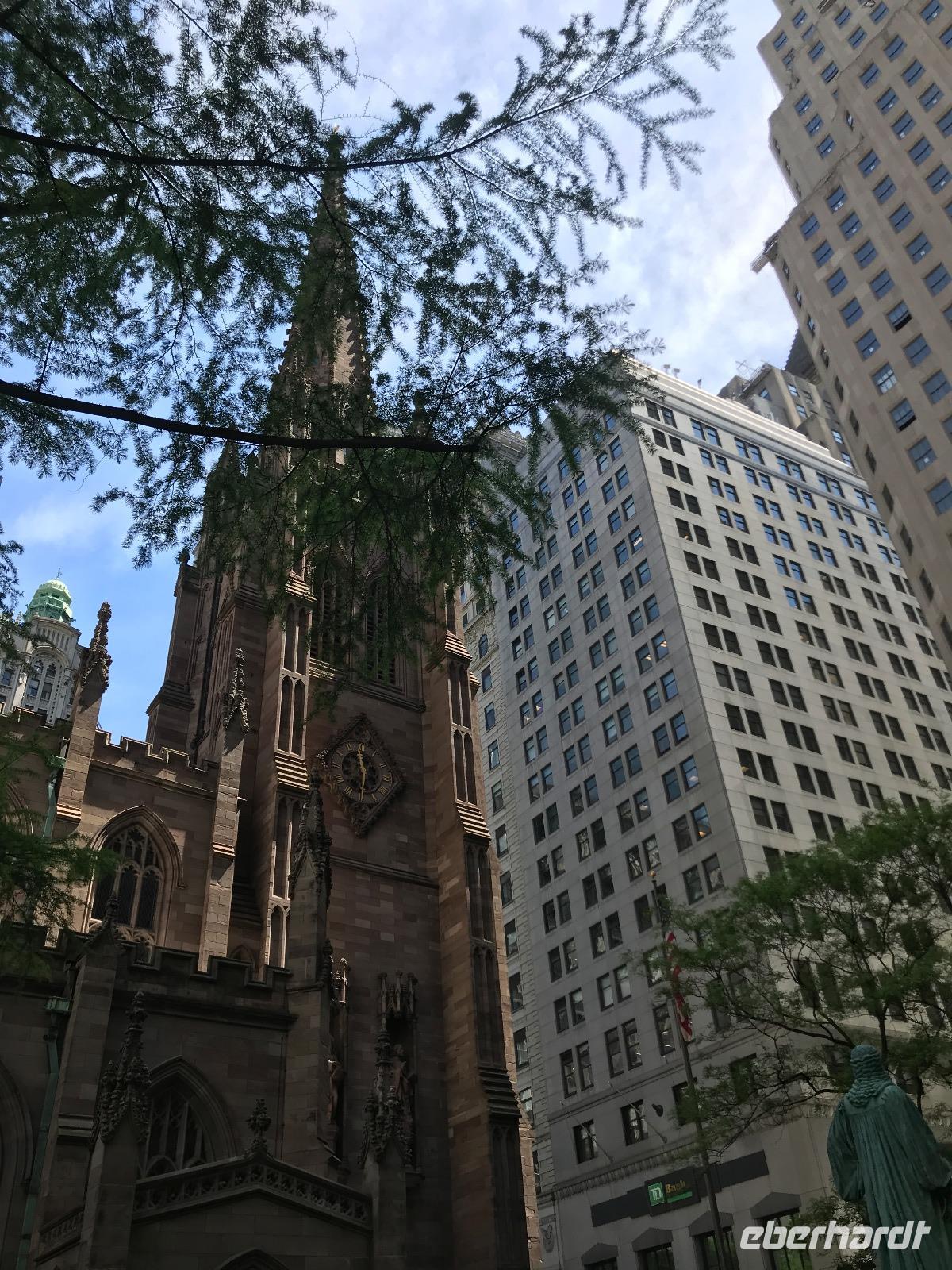 Unser Stadtrundgang führte uns weiter zur ältesten Kirche Manhattans, der St. Paul's Chapel, die wir besichtigten. Das kleine unscheinbare Gebäude aus dem 18. Jahrhundert versteckt sich am Broadway zwischen den Hochhäusern.