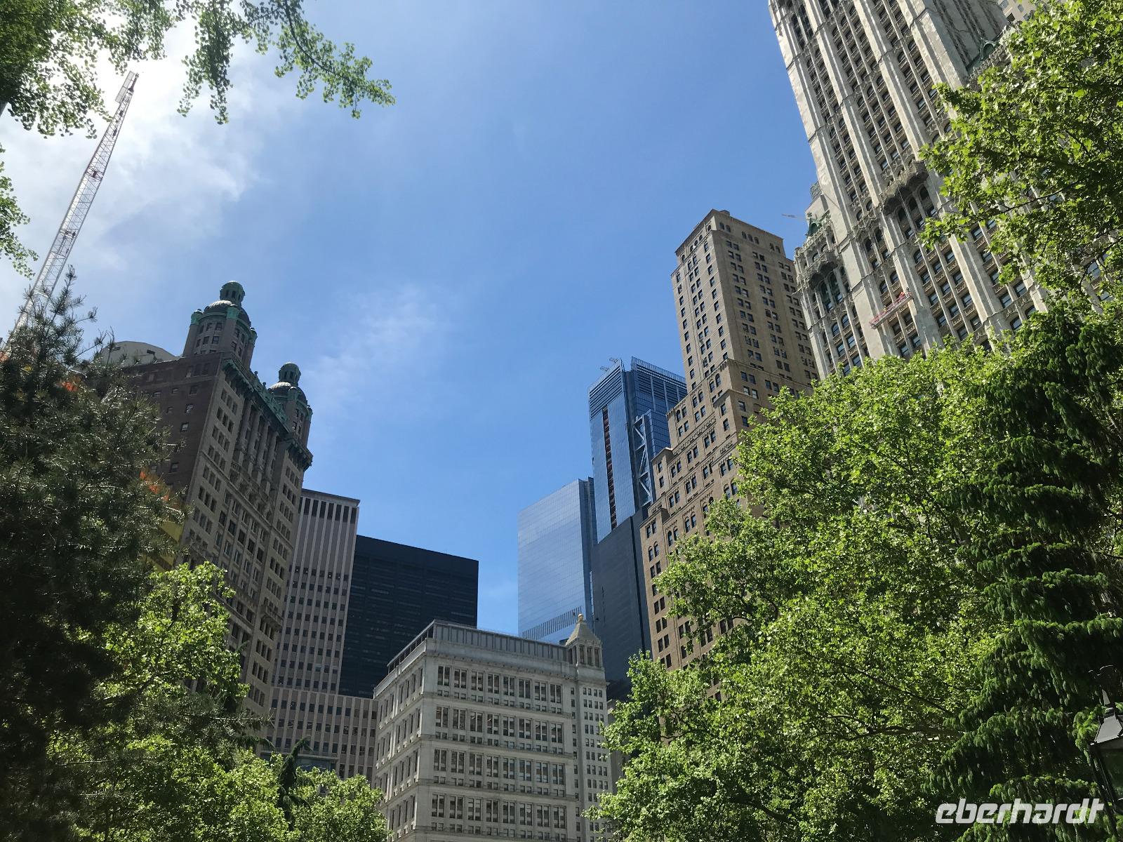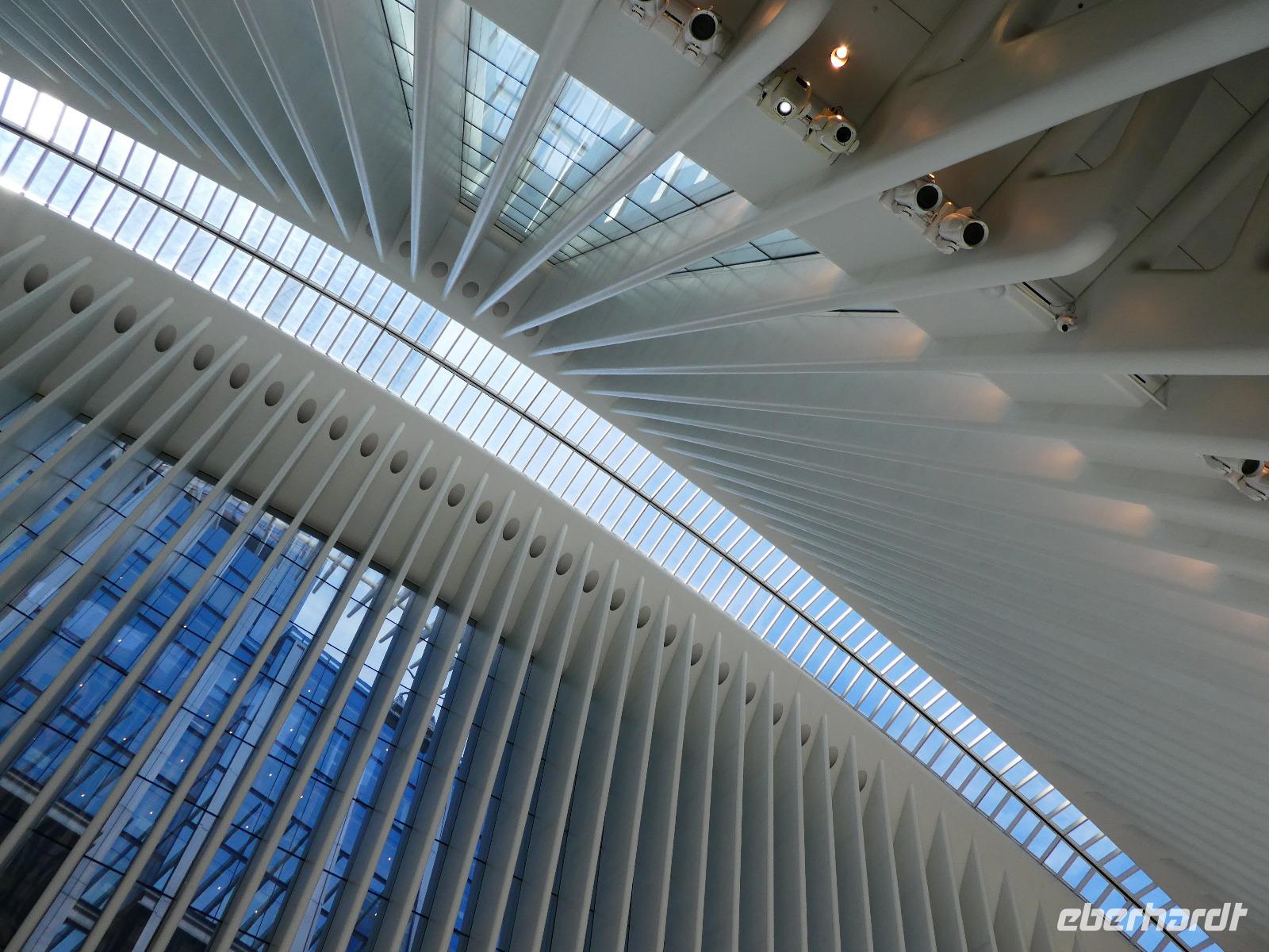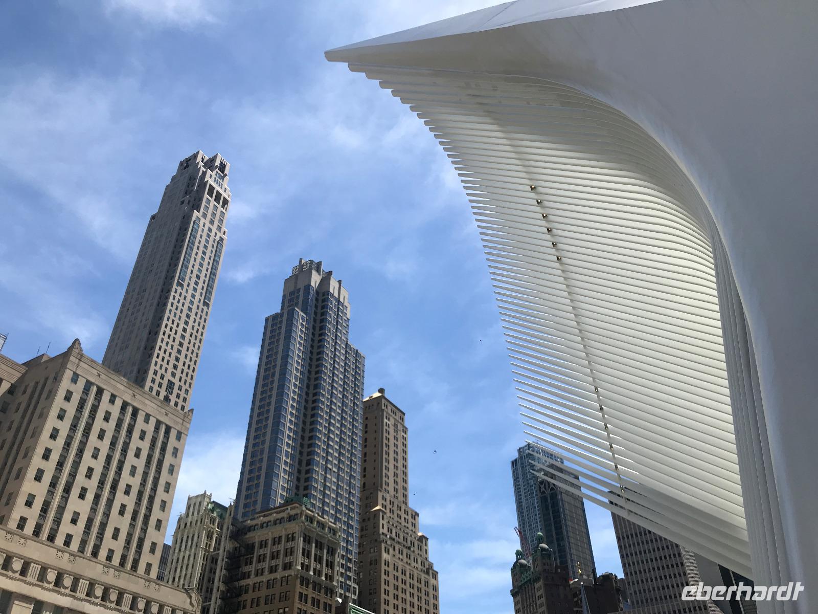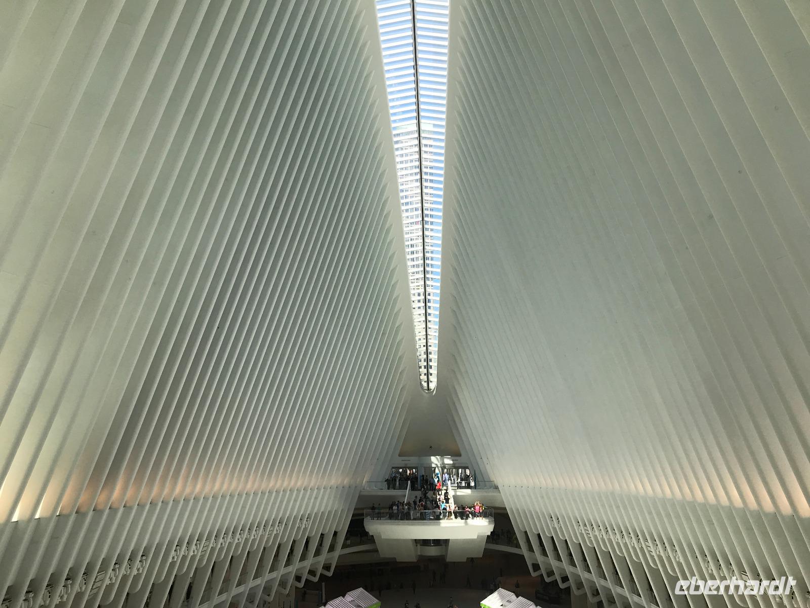 Vorbei an der Trinity Church, die leider wegen Renovierungsarbeiten geschlossen war, liefen wir zum neuen Jahrhundert-Bahnhof Oculus, der 2016 mit sieben Jahren Verspätung eröffnet wurde. Dieses architektonische Meisterwerk ist nicht nur der neue Bahnhof am 9/11 Memorial, sondern beherbergt auch viele Geschäfte und Shops, in denen sich viel Zeit verbringen lässt. Mit fast 4 Milliarden Dollar Baukosten ist es der teuerste Bahnhof weltweit. Er soll einen Phoenix darstellen, der aus der Asche empor steigt.