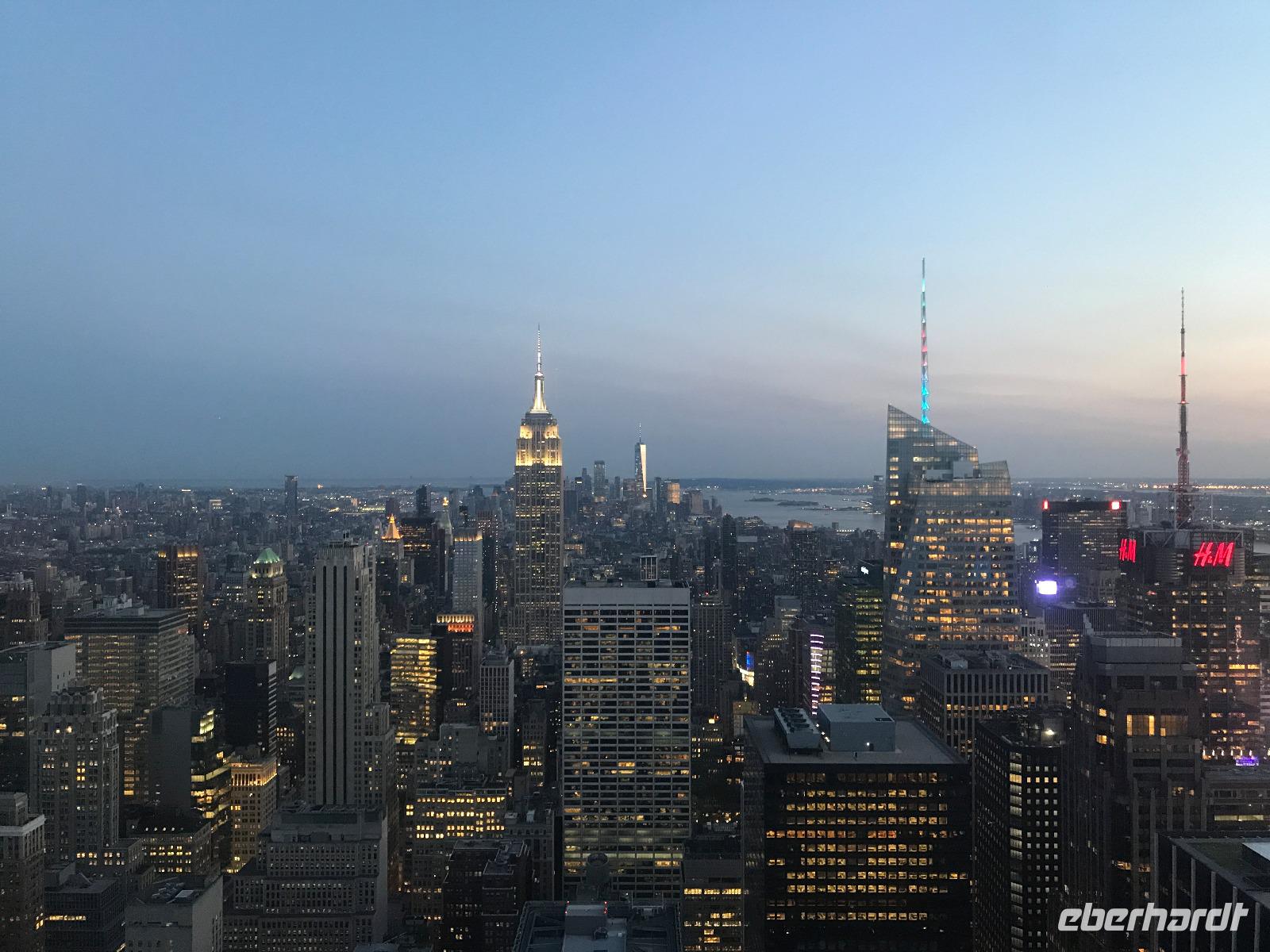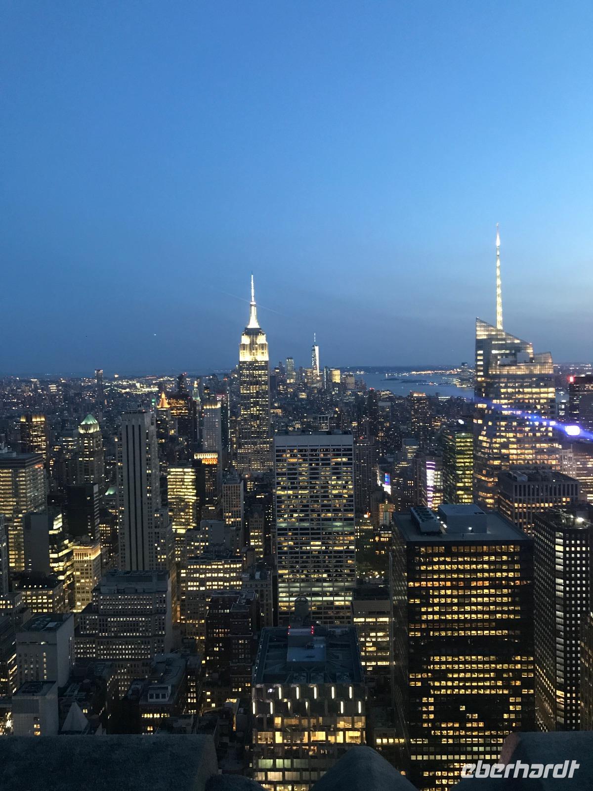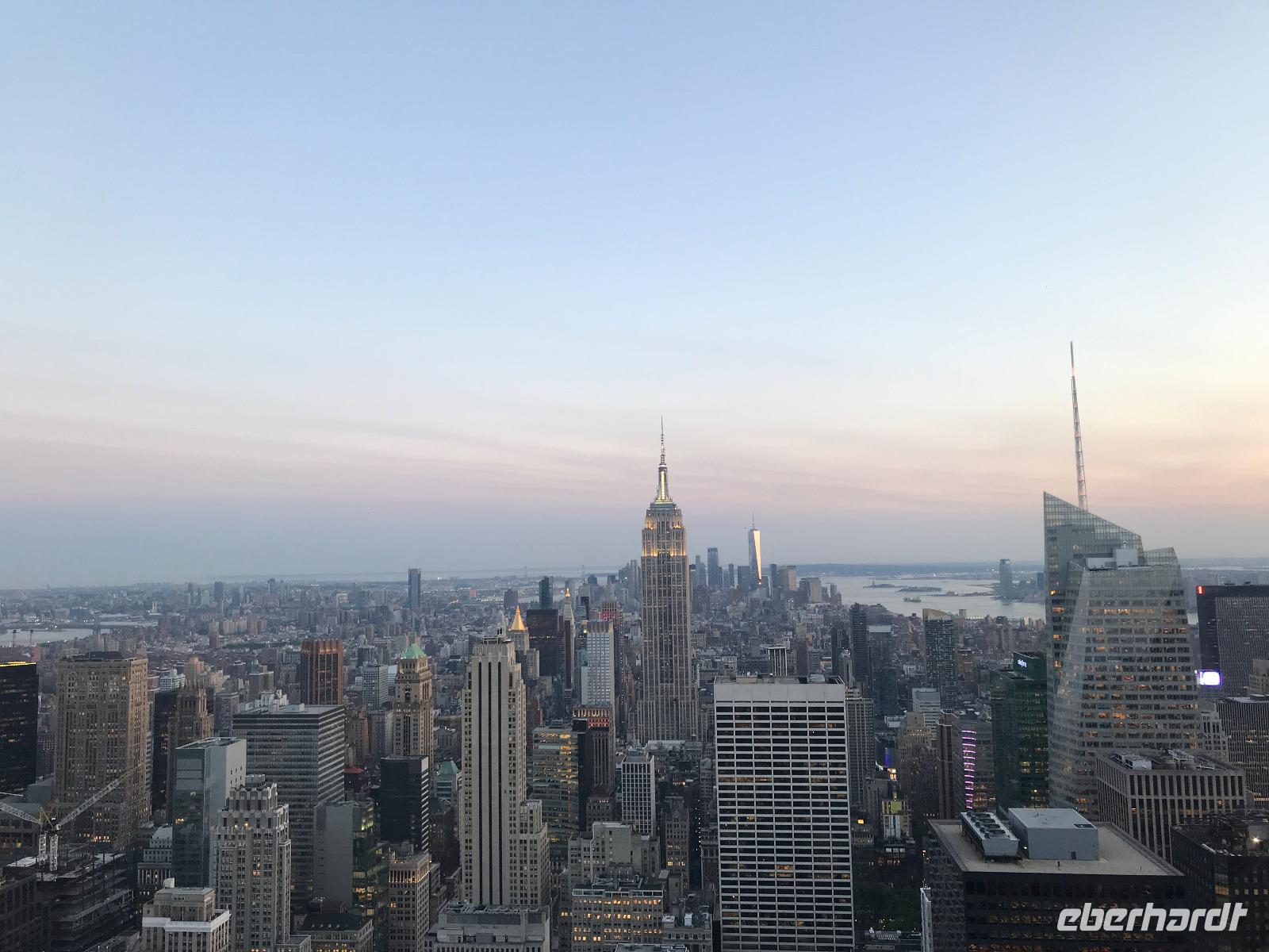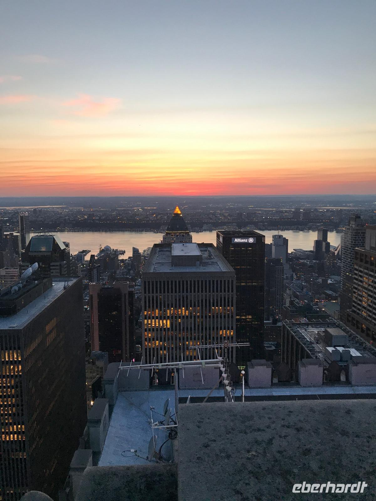 Am Abend erwartete uns ein weiteres Highlight - die Auffahrt auf das Rockefeller Center. Was für ein Ausblick! Wir waren in der Zeit der Dämmerung oben und konnten beobachten, wie nach und nach die Lichter in Manhattans Wolkenkratzern angingen. Gleichzeitig machte ein gigantischer Sonnenuntergang diesen Ausblick zu einem wunderschönen Farbspektakel.
