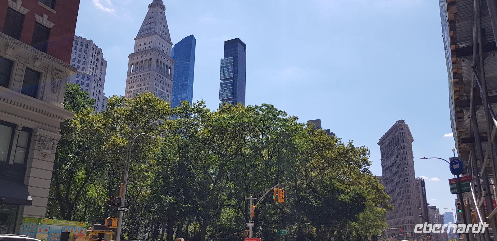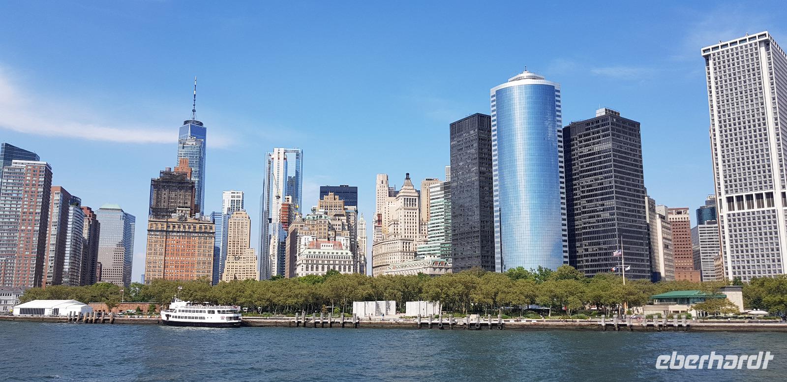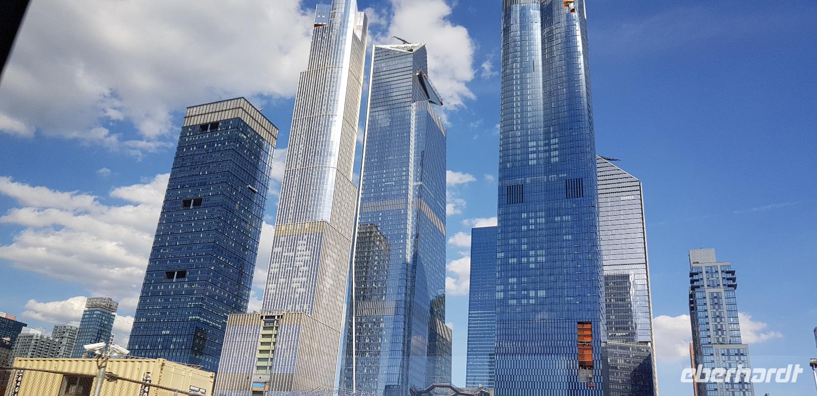 Weiter geht es zum ersten Wolkenkratzer der Stadt - dem Flatiron Building, frei übersetzt: Bügeleisen Gebäude - aufgrund seiner Form eines Bügeleisens. Anschließend erreichen wir Süd-Manhattan und den Ground Zero. Hier befanden sich bis zu den Anschlägen von 9/11 2001 die beiden Twin Towers. Heute erinnert nur noch das 9/11 Memorial mit den beiden Wasserbecken in quadratischer Form der beiden Türme und das Museum an die Terrorattacke von damals. Rings herum hat man neue und modernere Bürotürme errichtet, inklusive dem neuen One World Trade Center mit 542m Höhe, welches wir 2 Tage später noch besichtigen werden. Gleich um die Ecke liegt der Battery Park, von wo aus man einen tollen Blick in Richtung Freiheitsstatue und Ellis Island hat. Weiter geht es über die Manhattan Bridge nach Williamsburg, wo wir uns das jüdische Viertel einmal genauer anschauen. Hier sind wir wieder in einer komplett anderen Welt. Keine Hochhäuser, Ruhe und überall hebräische Schriftzeichen. Nach einer kurzen Fotopause fahren wir wieder nach Manhattan zurück in Richtung Hudson Yards am Hudson River gelegen. Hier fahren wir vorbei an den neu errichteten Wolkenkratzern und schließlich zum Hotel zurück.