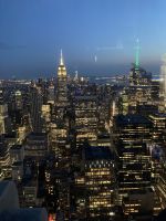 Vor der Abfahrt vom Hotel gibt es noch ein paar lokale Nachrichten: da wurde doch tatsächlich jemand von einem Hai beim Baden vor Long Island gebissen. Und die seit vielen Jahren ausgestellte Concorde, neben dem Flugzeugträger am Hudson, wird per Schiff zum Restaurieren nach Brooklyn gebracht. Die METRO bringt uns schnell zum Battery Park, und wir kommen nach gründlicher Sicherheitskontrolle gleich auf das nächste Schiff zur Statue of Liberty. Das Wetter ist genau richtig für unsere Fahrt, sonnig und etwas windig. Mit dem Audio Guide wird Liberty Island entdeckt, das Museum bietet interessante Informationen zum Bau der Statue und herrliche Sicht auf die Sky-Line. Die Weiterfahrt geht nach Ellis Island, dem Ort der Ankunft/Einwanderung für 12 Mio. Menschen. Wieder erhalten alle einen Audio Guide, entdecken das beeindruckende Gebäude und stärken sich im Imbiss. Nach einer Pause im Hotel geht es per METRO zum Rockefeller Center, wo alle den Platz sehen wollen, wo später im Jahr der riesige Weihnachtsbaum stehen wird. Oben - eben bei Top of the Rock1 - erleben wir einen wunderbaren Abend: als in der Dämmerung immer mehr die Lichter in den Gebäuden angehen, sind alle fast still, ergriffen von dem wunderbaren Bild - eben einmalig! Auf der Dachterrasse unseres Hotels treffen wir uns zu einem letzten Drink in New York.
