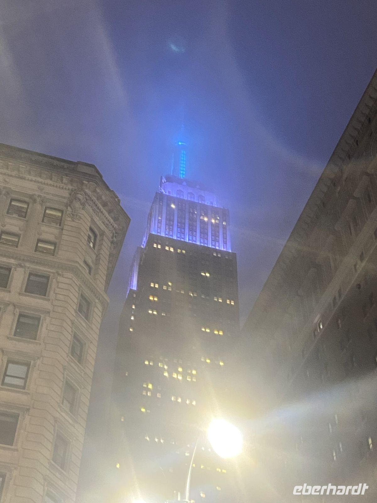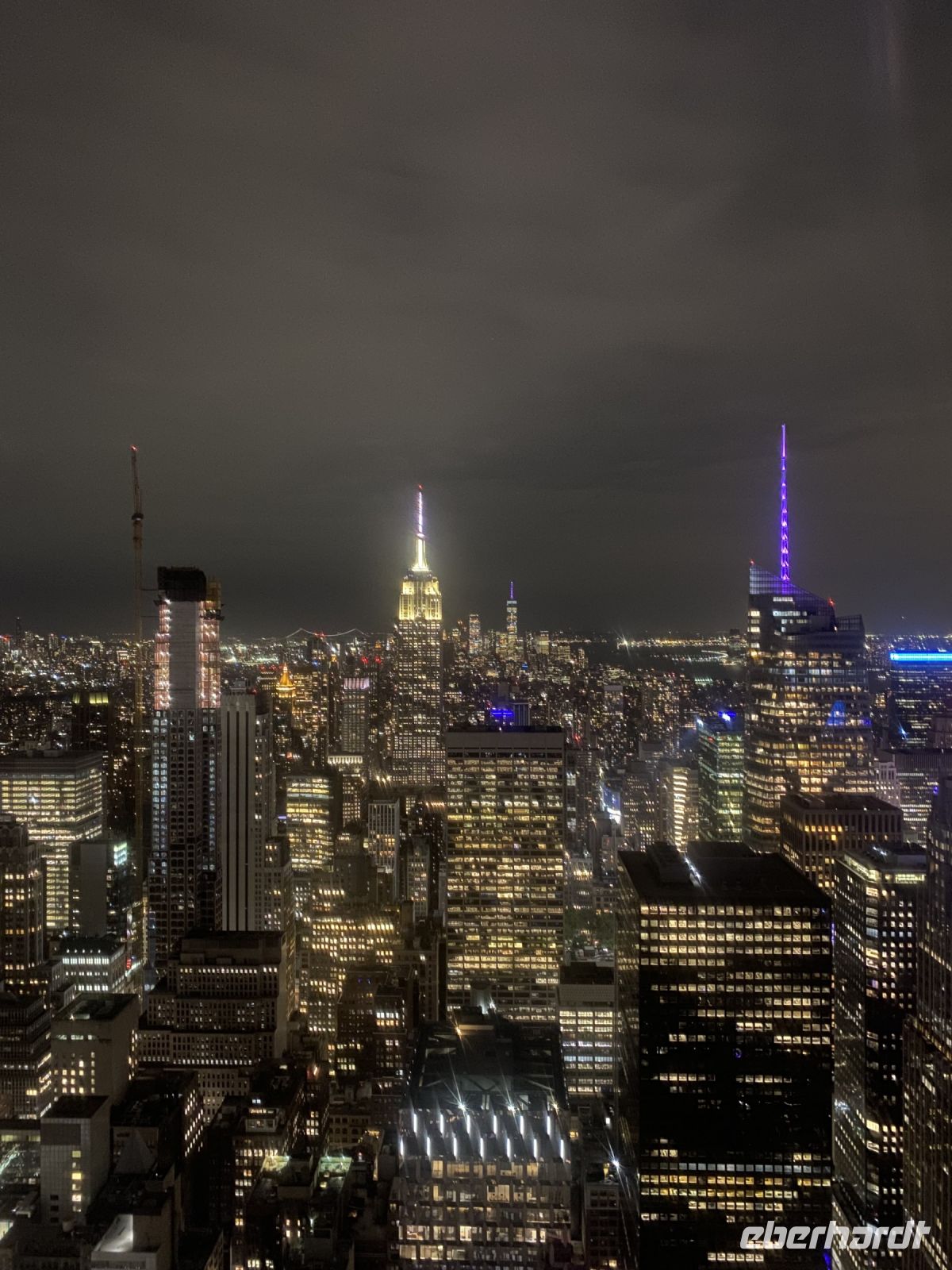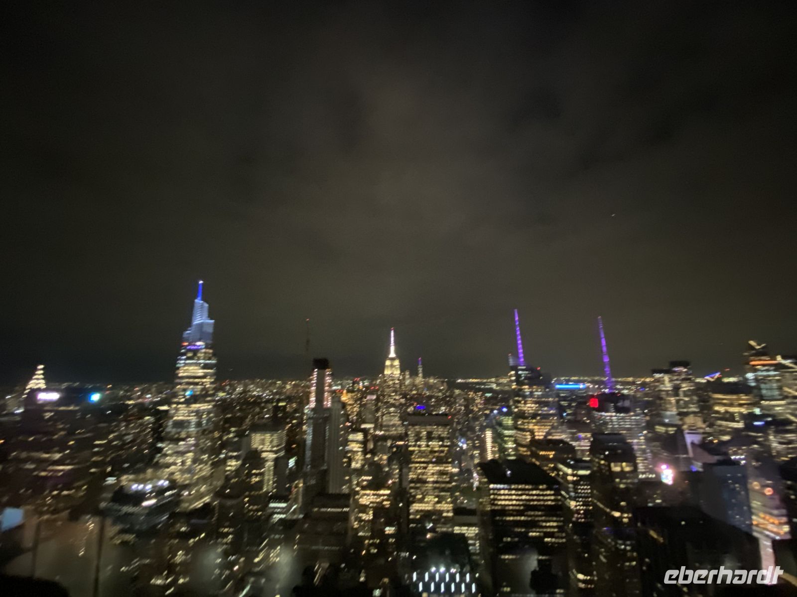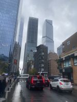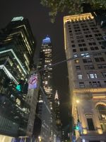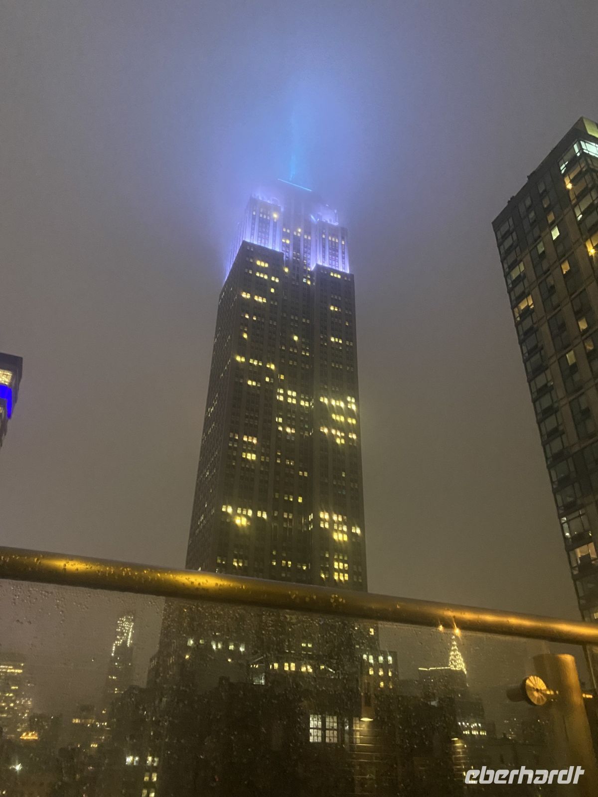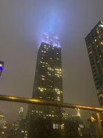 Die Lichter der Stadt erwarten uns buchstäblich, die Stadt hat es geschafft, wir sind in Ihrem Bann. Und so können Fotos Wolkenkratzer mit versteckter Spitze in Regenwolken absolut spektakulär sein.
