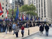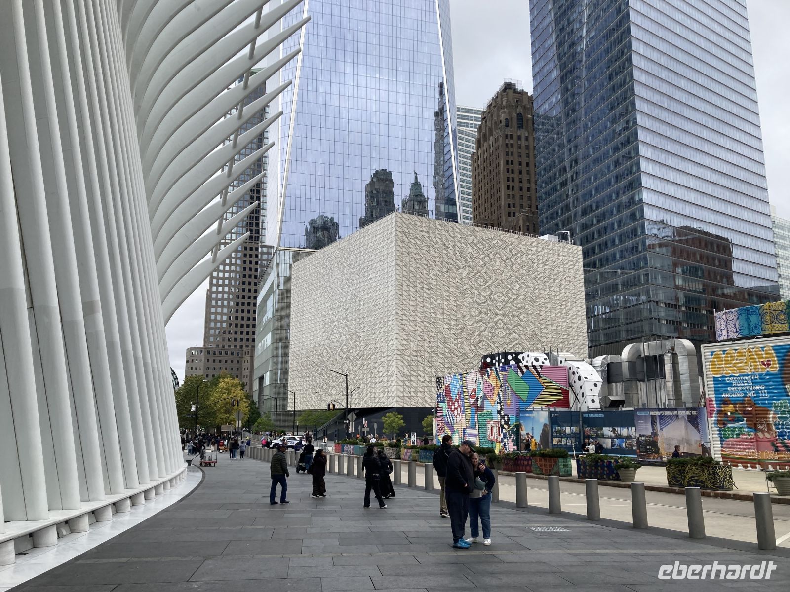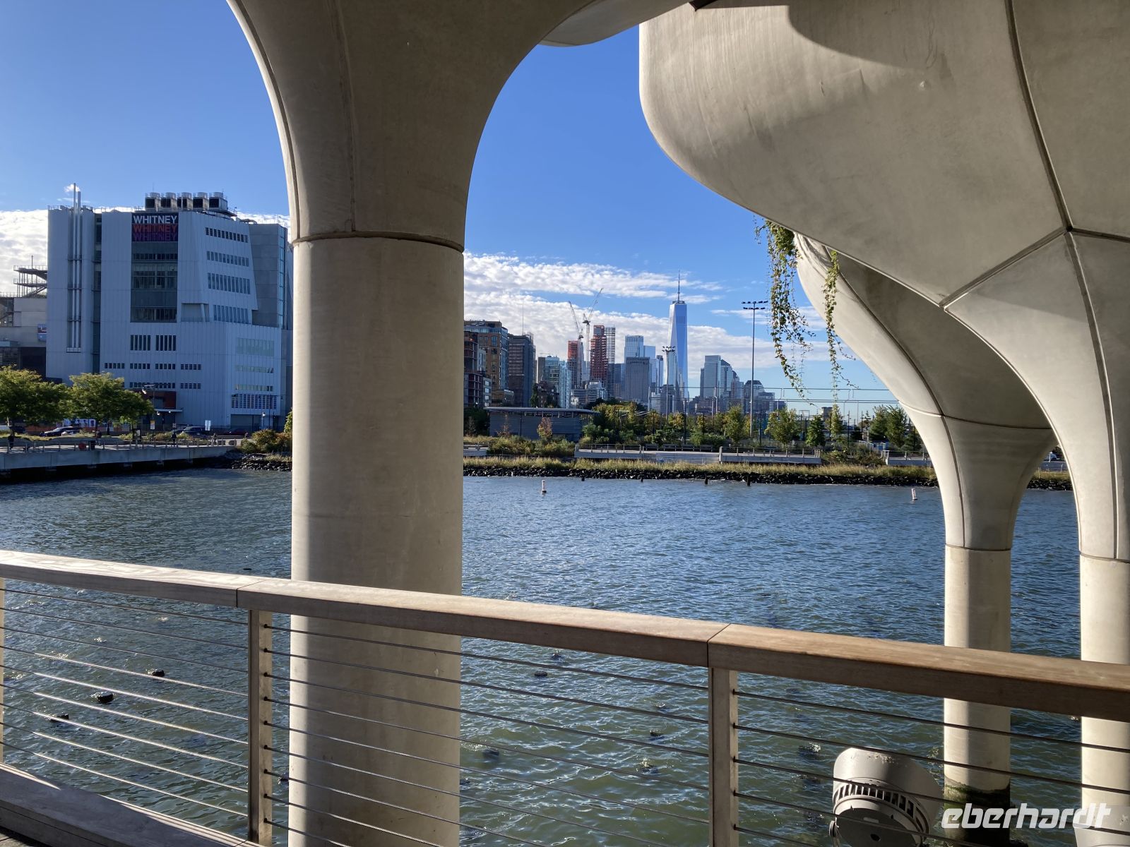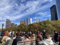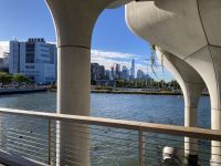 Mittlerweile ist die Gruppe sehr U-Bahn erfahren, einzelne Gäste erkunden selbst die Stadt per U-Bahn. Wir fahren mit der R Linie nach Süden bis zur Rector Street und gehen in die Wall Street zum „furchtlosen Mädchen“ und zum Broadway mit dem mächtigen Bullen. Die geplante Auffahrt auf das One World Trade Center muss entfallen, denn in 250 m Höhe ist der Wolkenkratzer völlig von Wolken umhüllt, dort oben also Sicht null. An der Kasse werden wir freundlich darauf hingewiesen, dass wir unsere Karten umschreiben lassen könnten auf morgen, wenn das Wetter wieder sonnig ist. Das Angebot nehmen wir mit großem Dank an. Nach der etwas längeren Mittagspause machen wir uns auf den Weg zur Brooklyn Bridge. Wir gehen an der neu gestalteten Uferpromenade von Brooklyn entlang, ein wunderbarer Weg mit herrlichen Ausblicken auf Manhattan.