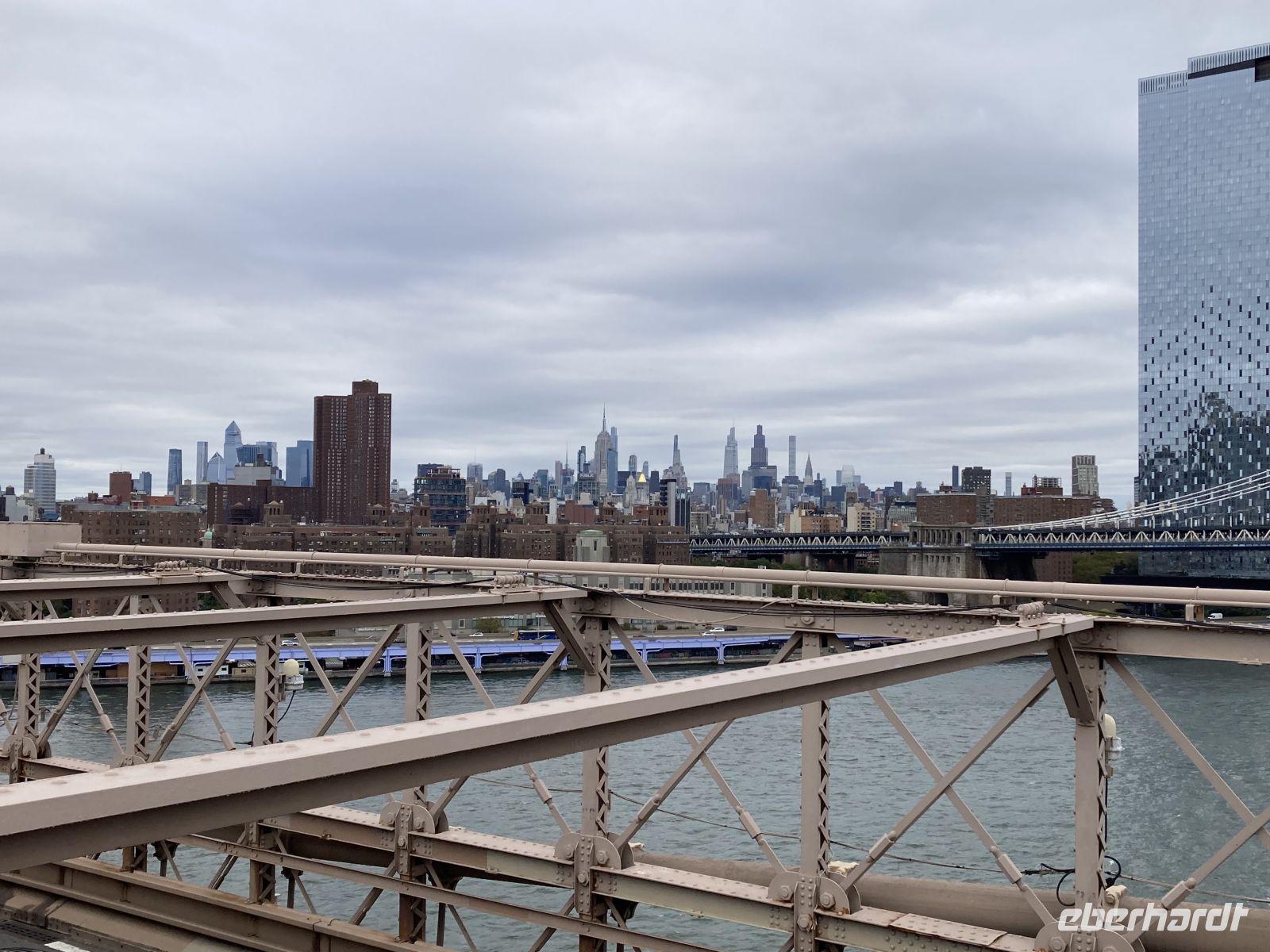 Nachdem die Firma EBERHARDT die ganze Gruppe mit Eis erfrischt hat - eine gern angenommene Überraschung, denn in Brooklyn macht man sehr gutes Eis! – gehen wir über die Brooklyn Bridge zurück nach Manhattan. Was für wunderbare Blicke auf Manhattan hat man von der Brücke aus!