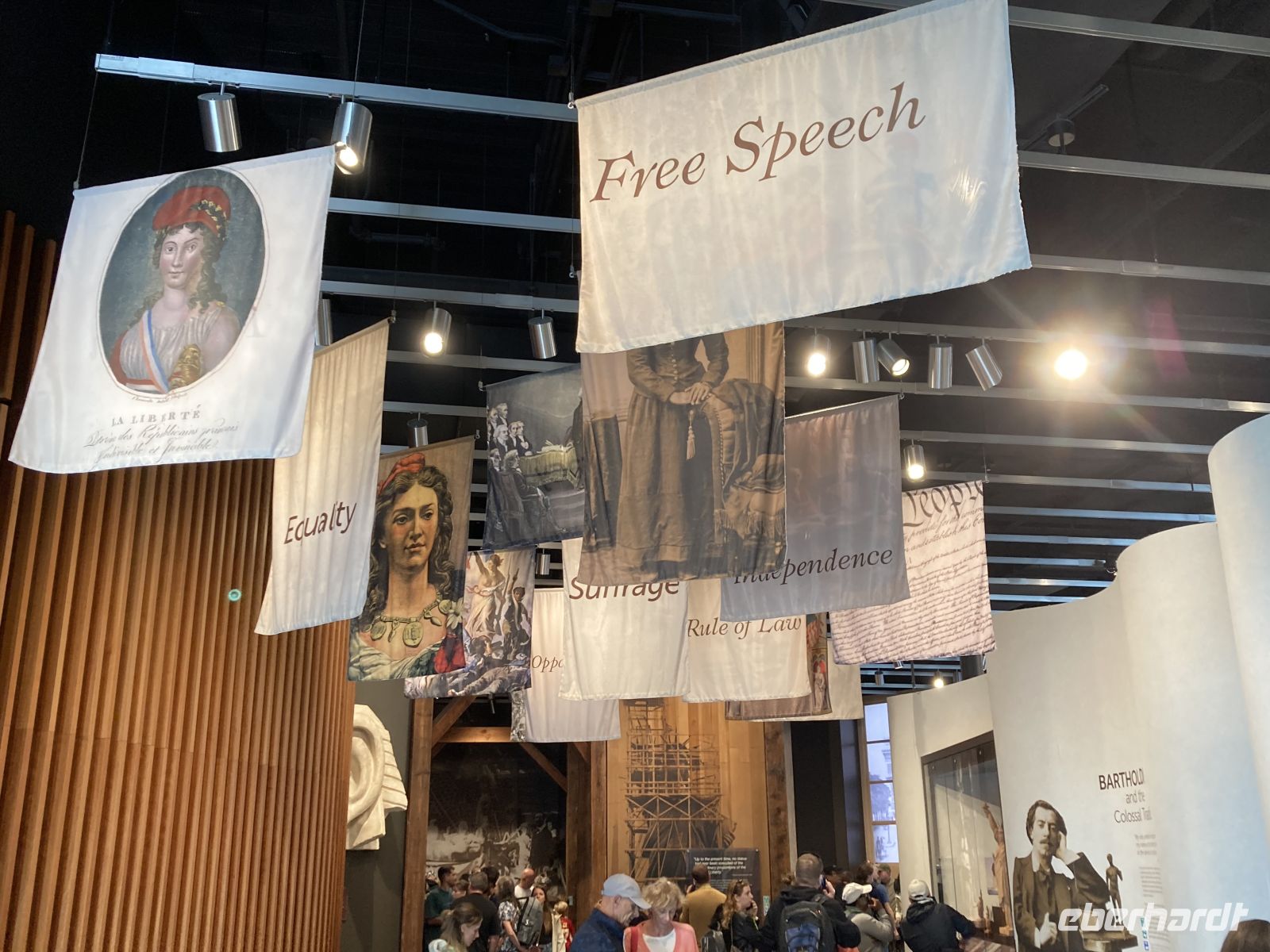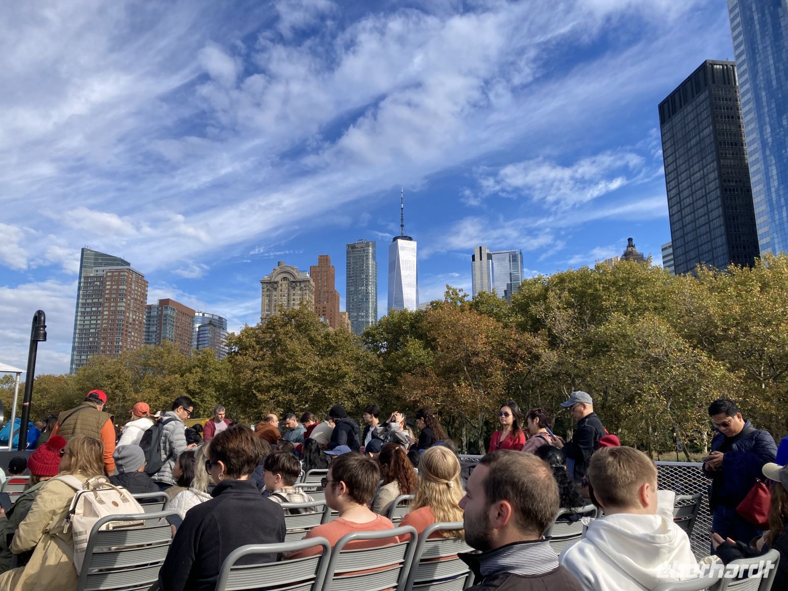 Heute steht die Freiheitsstatue im Mittelpunkt! Wir erreichen die Südspitze von Manhattan mit der U-Bahn und gehen sofort an Bord eines kleinen Schiffs, dass uns mit vielen anderen Gästen zur Insel bringt, auf der die Freiheitsstatue steht. Das Wetter ist sonnig, klar, wunderbar. Wir haben Zeit für viele Fotos beim Rundgang auf der Insel. Auch das gut gestaltete Museum auf der Insel ist ein Besuch wert. Eine kurze Schiffsfahrt bringt uns dann nach Ellis Island, auf die Insel mit dem großen Einwanderungsgebäude, das viele Jahrzehnte lang Millionen von Einwanderern in Empfang genommen hat. Jemand aus der Gruppe macht erfolgreich Ahnenforschung und entdeckt Spuren seiner Familie. Von Ellis Island geht es zurück zur Südspitze von Manhattan, eine kurze Schiffsfahrt. Mit der METRO fahren wir zum WORLD TRADE CENTER, denn nach unserer Mittagspause fahren wir hinauf in das höchste Gebäude der Stadt und genießen eine herrliche Rund-Um-Sicht. Vom Regen der vergangenen Tage ist die Luft klar, wir sehen weit über die Stadt und bis zum Atlantik, der sich jenseits der Verrazano-Brücke erstreckt. Gestern waren wir auf der Brooklyn-Bridge unterwegs, die jetzt unter uns liegt.