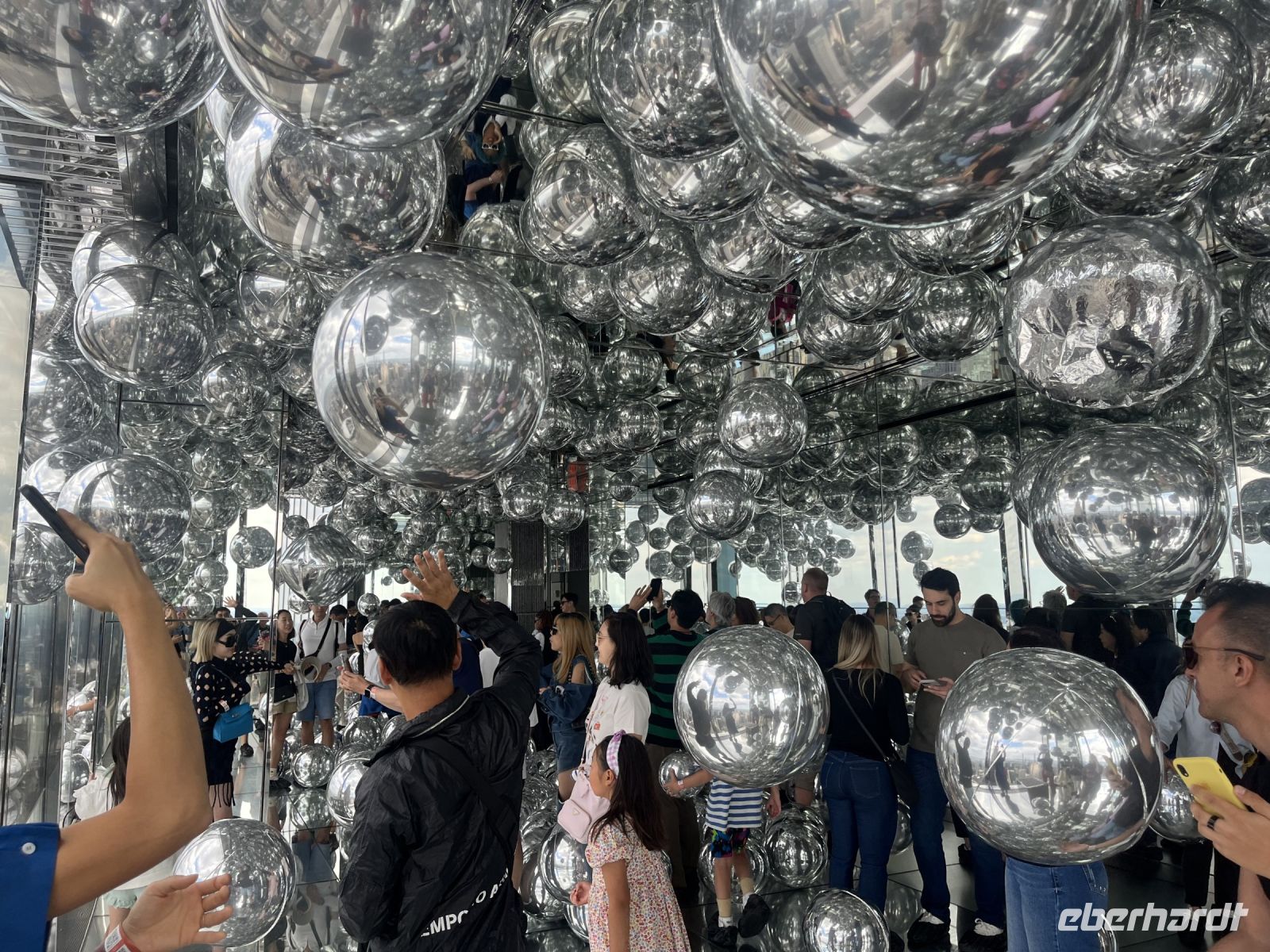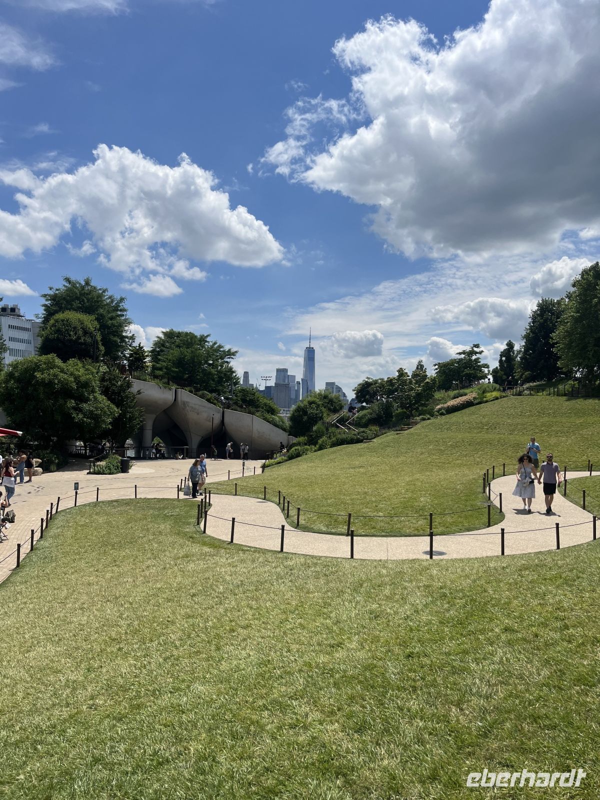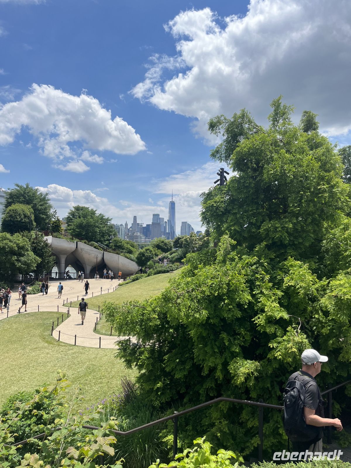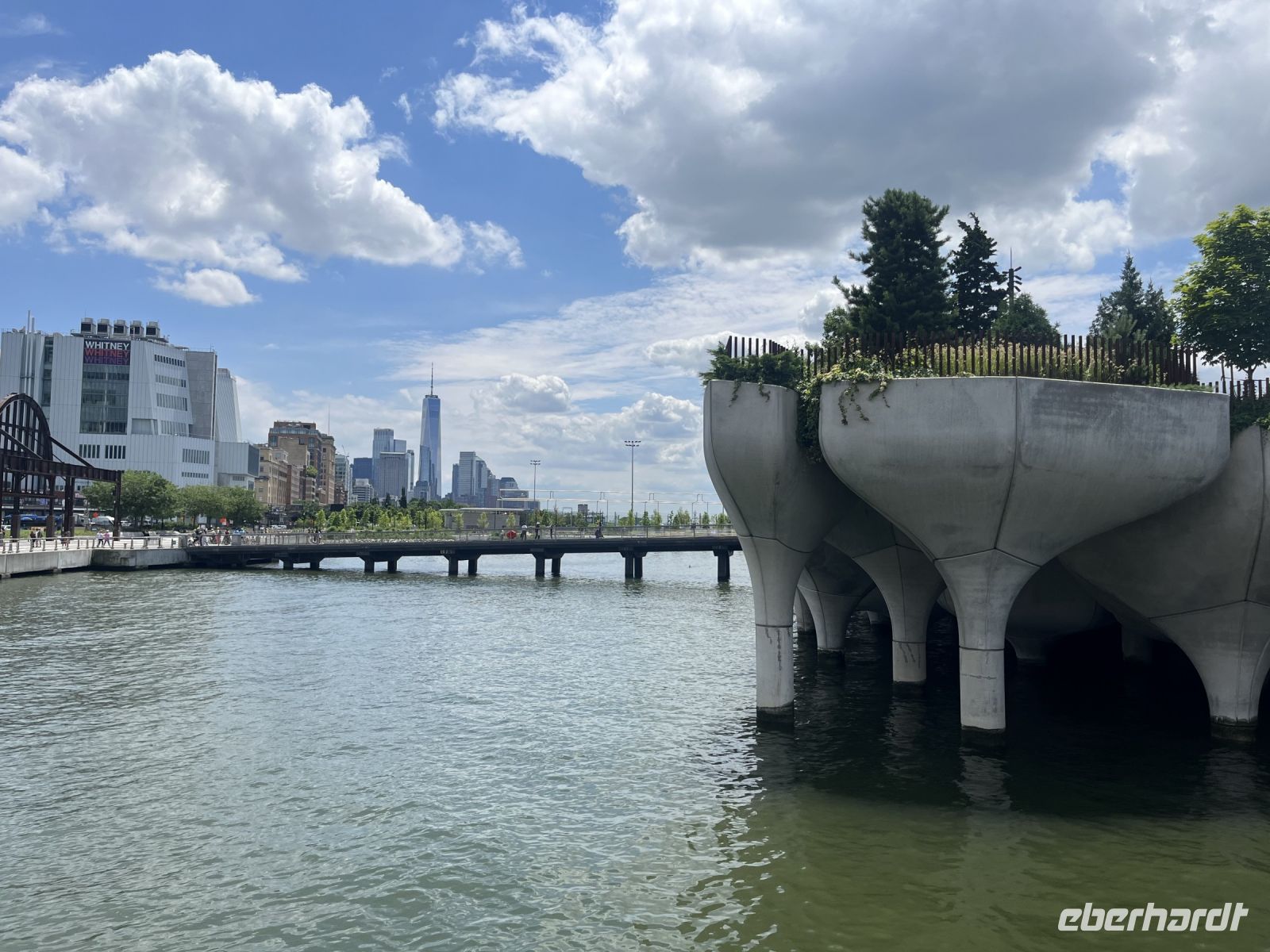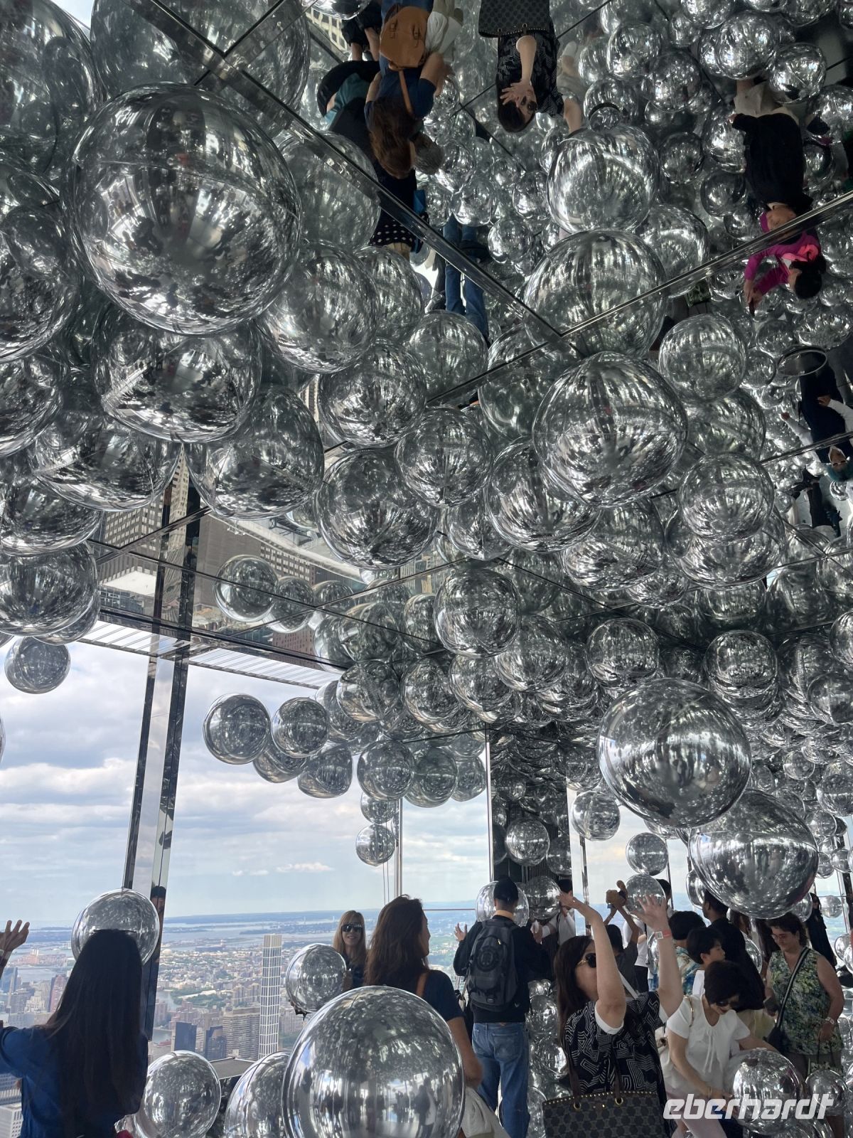Heute nehmen wir die lila Linie direkt nach Hudson Yards. Hudson Yards ist einer der neueren Stadtteile Manhattans. Der Bau des Komplexes begann Ende 2012, und der erste Teil wurde Anfang 2019 eröffnet. Hier gibt es viel zu tun und zu sehen. The Vessel und andere markante Bauwerke verleihen dem Gebiet einen besonderen Charakter. Vor The Vessel haben wir auch einen tollen Ausblick auf die Aussichtsplattform The Edge in schwindelerregender Höhe. Wir nehmen uns noch kurz Zeit, um uns in dem angrenzenden Einkaufszentrum die Luxusboutiquen von Dior und Louis Vuitton anzusehen. Allerdings zeigt das "Eier steicheln" an der Wall Street doch noch keine Wirkung, so dass wir es beim Schauen belassen. Von hier aus führt uns der Weg an der Konzerthalle The Shed vorbei direkt auf die High Line. Sie ist eine 2,33 Kilometer lange, nicht mehr als solche genutzte Güterzugtrasse im Westen von Manhattan, die von 2006 bis 2019 zu einer Parkanlage, dem High Line Park, umgebaut wurde. Überall gibt es kleine Bänke, die zum Verweilen einladen. Wir spazieren entlang bis zur 14. Straße. Anschließend besuchen wir den Chelsea Market, der mit allerlei Geschäften und Spezialitäten lockt. Hier finden wir auch einen Stand mit Berliner Currywurst und deutschem Bier. Ein schönes Fotomotiv. Von hier aus satten wir Little Island einen kleinen Besuch ab. Der angelegte Park sieht natürlich aus der Ferne ganz besonders aus. An sich ist es nur ein Park, kann aber zu Recht als grüne Oase im Hudson bezeichnet werden. Es gibt Wanderwege, die zu den höchsten Punkten der Insel führen und wunderschöne Ausblicke auf Manhattan, New Jersey und den Hudson. Nach dem Besuch nehmen wir die Metro in Richtung Bryant Park, den wir kurz durchqueren, um zur Nationalbibliothek von New York zu kommen, die vor allem durch ihre pompösen Deckengemälde berühmt ist. Von hier aus trennen uns nur wenige Meter zu Fuß von unserer Aussichtsplattform des Summit One Vanderbilt Gebäudes gegenüber vom Grand Central Terminal. Die Aussichtsplattform des Summit One Vanderbilt erstreckt sich über drei Etagen des beeindruckenden Wolkenkratzers. Von hier aus haben wir nicht nur einen einzigartigen Blick auf das Empire State Building, das Chrysler Building, den Bryant Park und den Times Square, die sich alle in der Nähe befinden, sondern es bietet auch ein Kunsterlebnis, durch welches man hindurchgehen kann. Innen ist alles verspiegelt und es gibt einen Raum mit überdimensionalen Luftballons, die durch die Gegend fliegen. Danmit entstehen einmalige Fotomotive. Vermutlich war es für uns die meist beeindruckendste Aussichtsplattform auf unserer Reise.