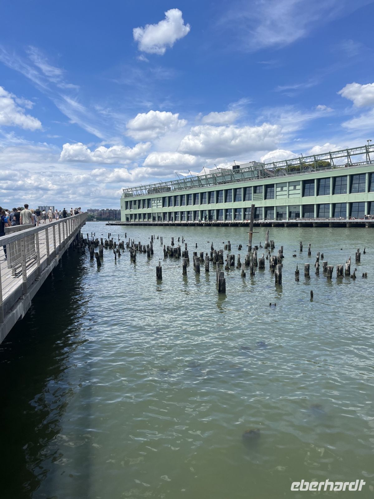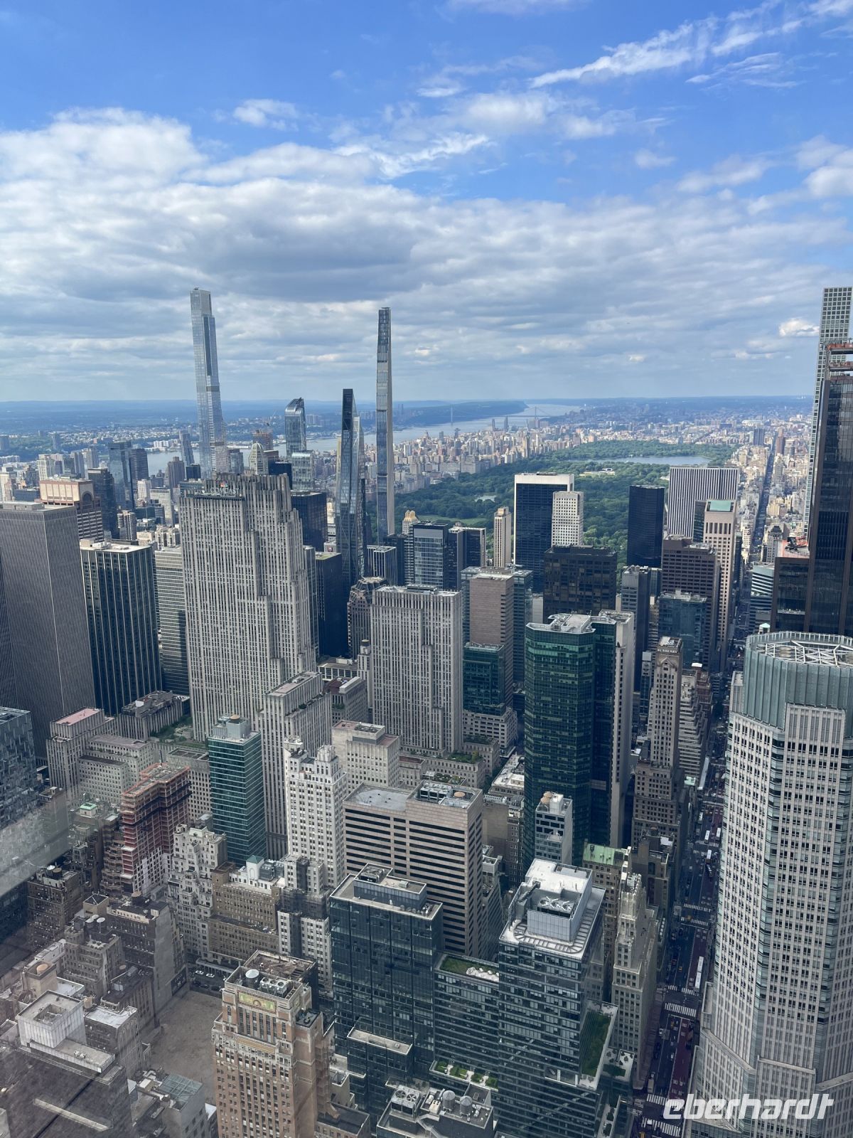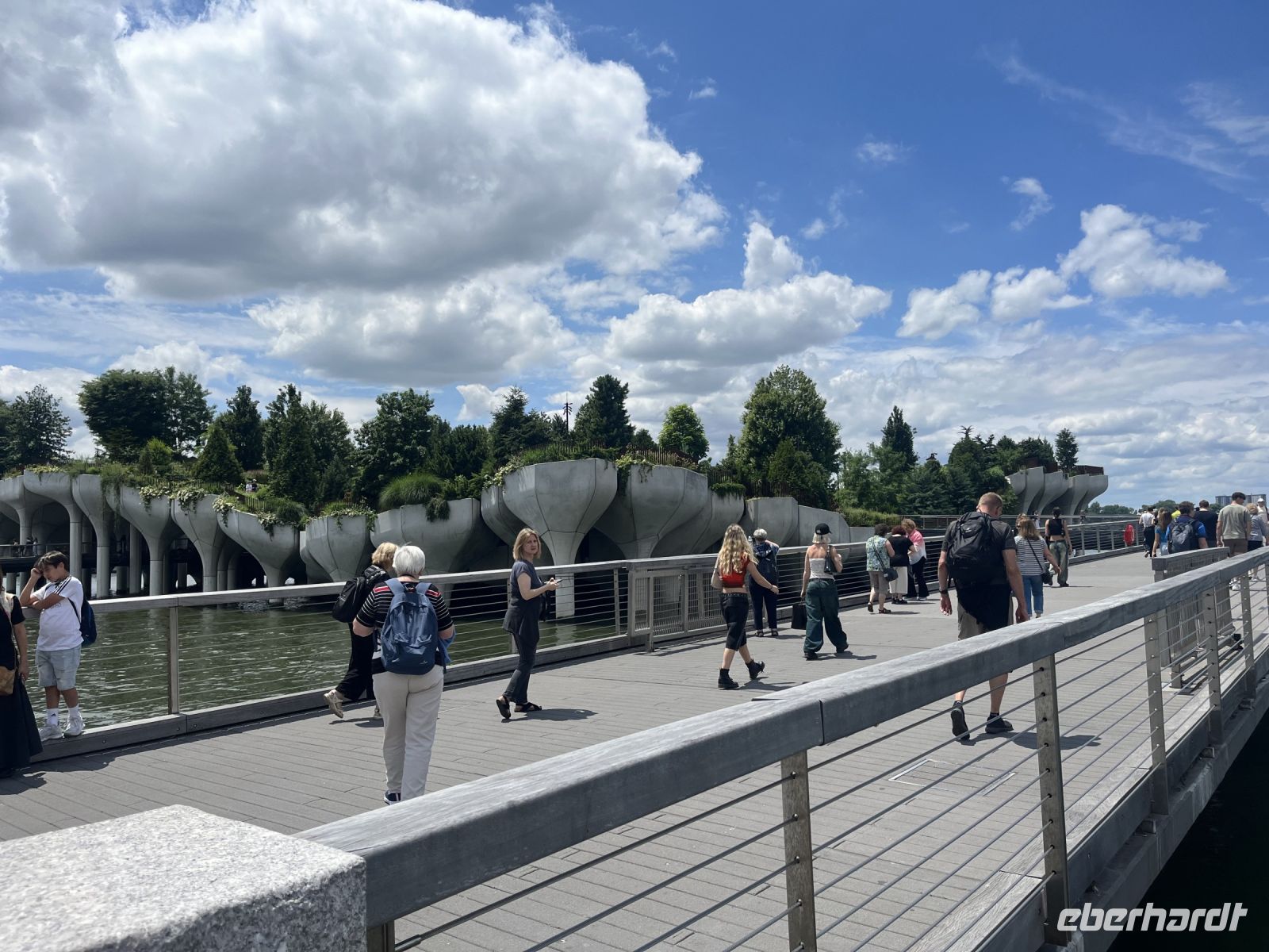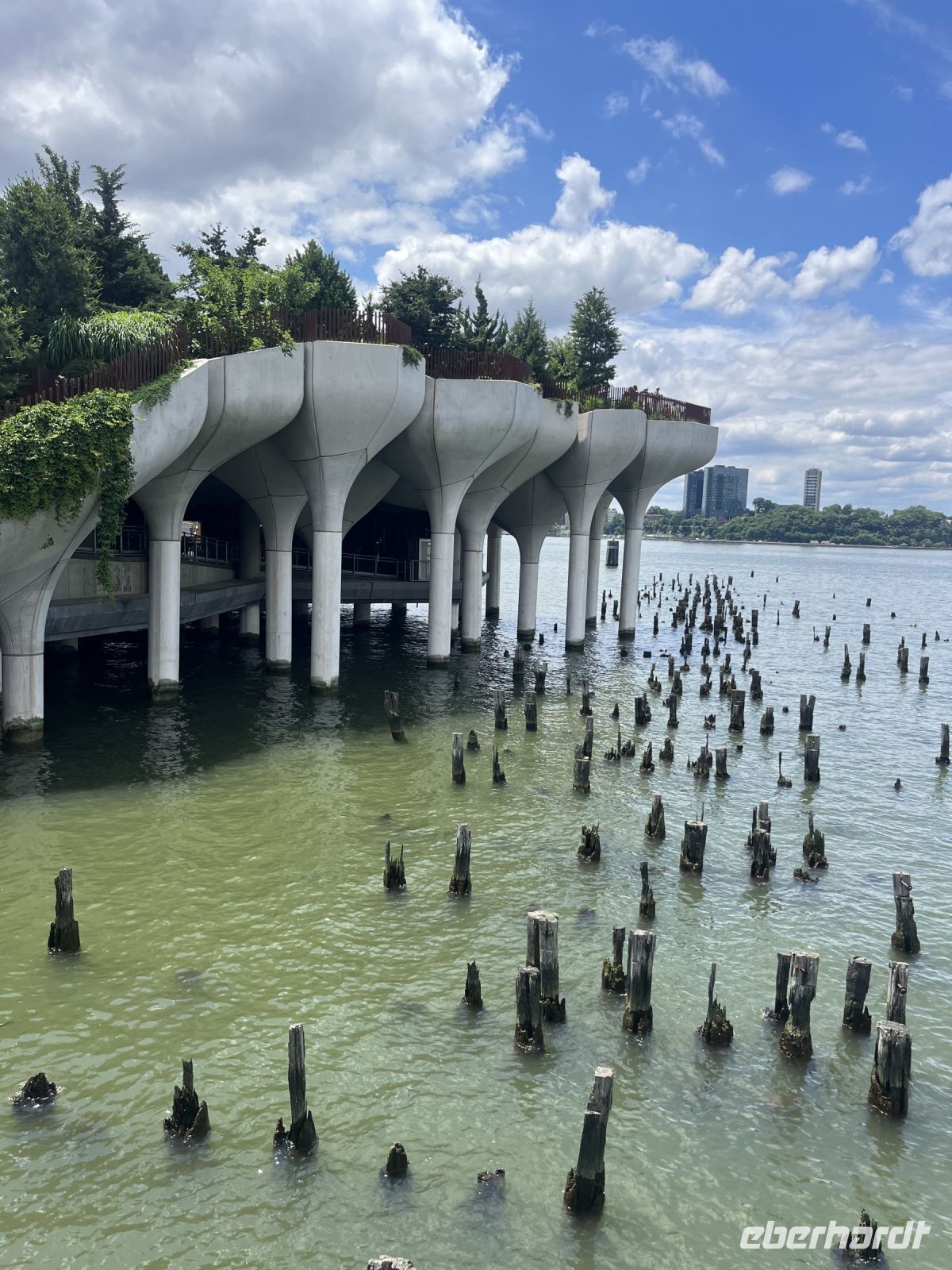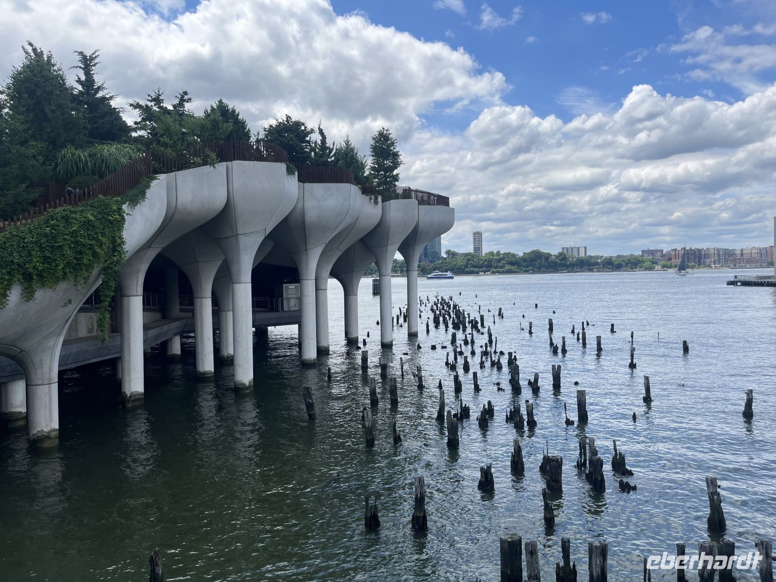 Heute nehmen wir die lila Linie direkt nach Hudson Yards. Hudson Yards ist einer der neueren Stadtteile Manhattans. Der Bau des Komplexes begann Ende 2012, und der erste Teil wurde Anfang 2019 eröffnet. Hier gibt es viel zu tun und zu sehen. The Vessel und andere markante Bauwerke verleihen dem Gebiet einen besonderen Charakter. Vor The Vessel haben wir auch einen tollen Ausblick auf die Aussichtsplattform The Edge in schwindelerregender Höhe. Wir nehmen uns noch kurz Zeit, um uns in dem angrenzenden Einkaufszentrum die Luxusboutiquen von Dior und Louis Vuitton anzusehen. Allerdings zeigt das "Eier steicheln" an der Wall Street doch noch keine Wirkung, so dass wir es beim Schauen belassen. Von hier aus führt uns der Weg an der Konzerthalle The Shed vorbei direkt auf die High Line. Sie ist eine 2,33 Kilometer lange, nicht mehr als solche genutzte Güterzugtrasse im Westen von Manhattan, die von 2006 bis 2019 zu einer Parkanlage, dem High Line Park, umgebaut wurde. Überall gibt es kleine Bänke, die zum Verweilen einladen. Wir spazieren entlang bis zur 14. Straße. Anschließend besuchen wir den Chelsea Market, der mit allerlei Geschäften und Spezialitäten lockt. Hier finden wir auch einen Stand mit Berliner Currywurst und deutschem Bier. Ein schönes Fotomotiv. Von hier aus satten wir Little Island einen kleinen Besuch ab. Der angelegte Park sieht natürlich aus der Ferne ganz besonders aus. An sich ist es nur ein Park, kann aber zu Recht als grüne Oase im Hudson bezeichnet werden. Es gibt Wanderwege, die zu den höchsten Punkten der Insel führen und wunderschöne Ausblicke auf Manhattan, New Jersey und den Hudson. Nach dem Besuch nehmen wir die Metro in Richtung Bryant Park, den wir kurz durchqueren, um zur Nationalbibliothek von New York zu kommen, die vor allem durch ihre pompösen Deckengemälde berühmt ist. Von hier aus trennen uns nur wenige Meter zu Fuß von unserer Aussichtsplattform des Summit One Vanderbilt Gebäudes gegenüber vom Grand Central Terminal. Die Aussichtsplattform des Summit One Vanderbilt erstreckt sich über drei Etagen des beeindruckenden Wolkenkratzers. Von hier aus haben wir nicht nur einen einzigartigen Blick auf das Empire State Building, das Chrysler Building, den Bryant Park und den Times Square, die sich alle in der Nähe befinden, sondern es bietet auch ein Kunsterlebnis, durch welches man hindurchgehen kann. Innen ist alles verspiegelt und es gibt einen Raum mit überdimensionalen Luftballons, die durch die Gegend fliegen. Danmit entstehen einmalige Fotomotive. Vermutlich war es für uns die meist beeindruckendste Aussichtsplattform auf unserer Reise.