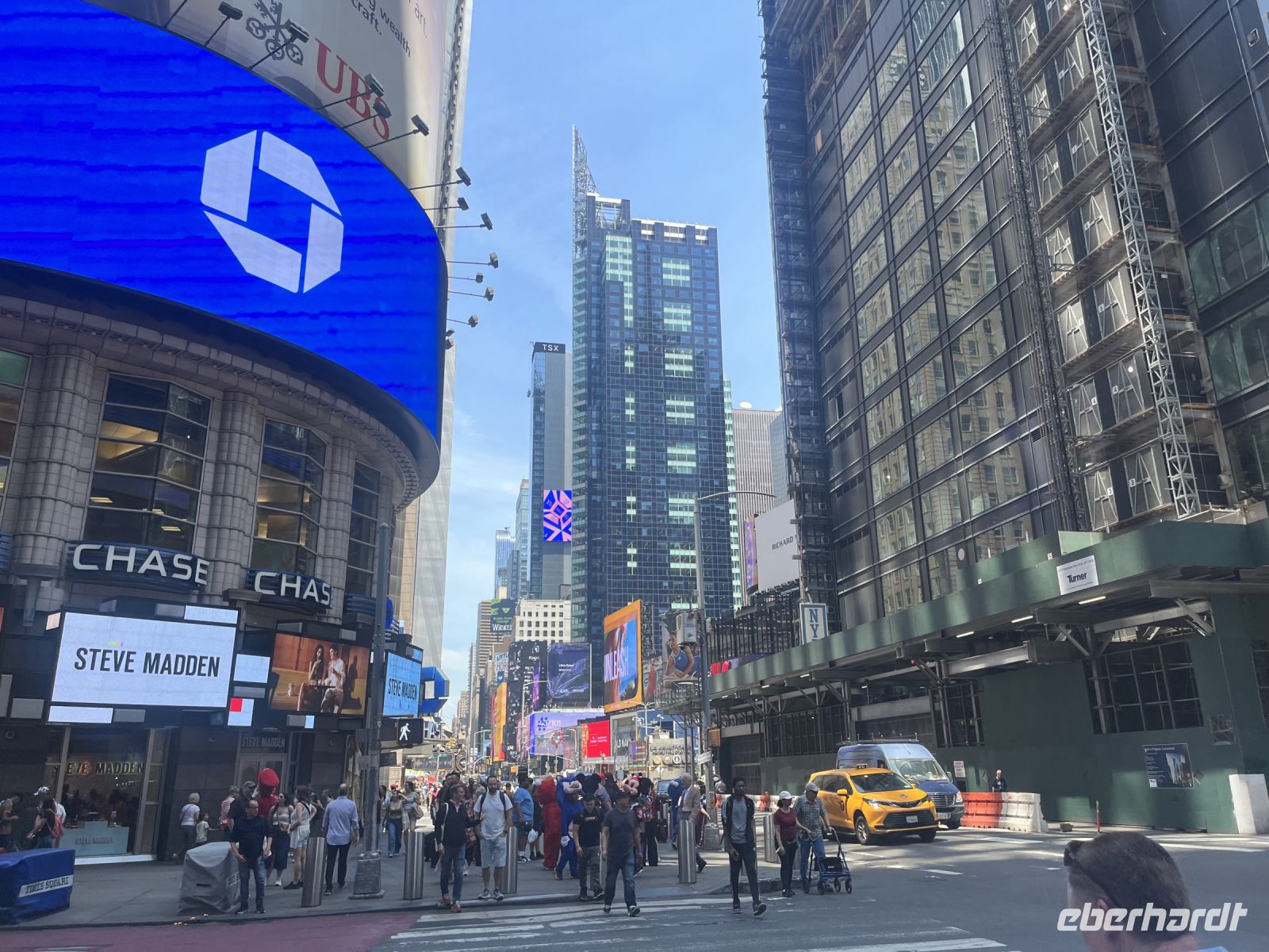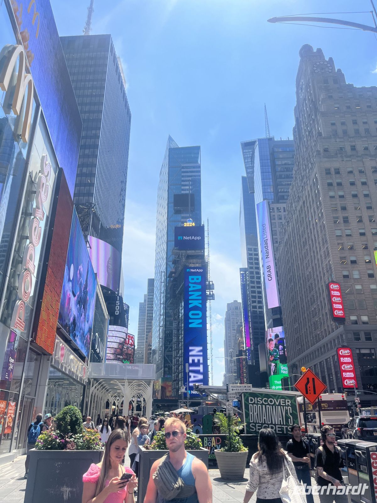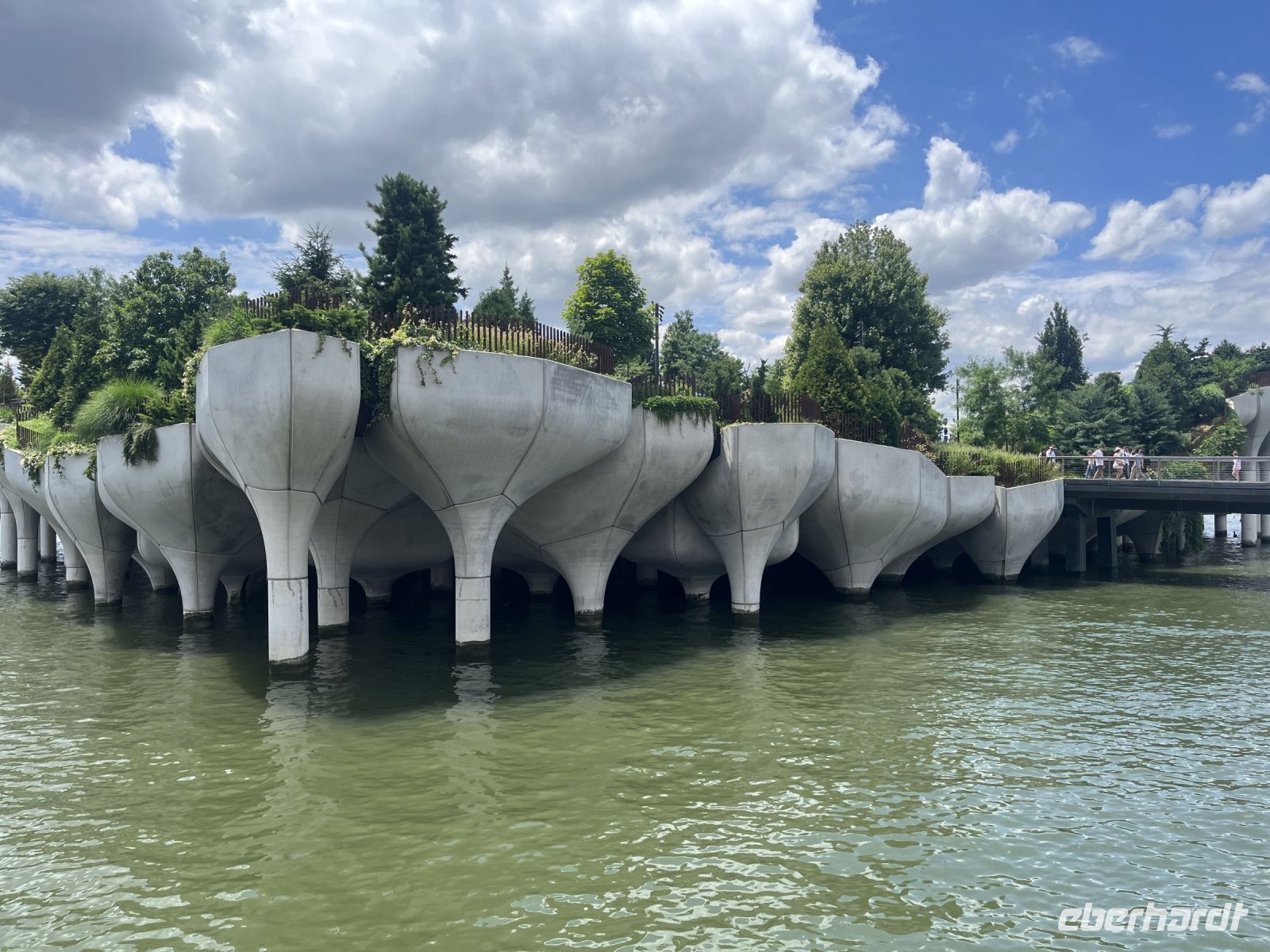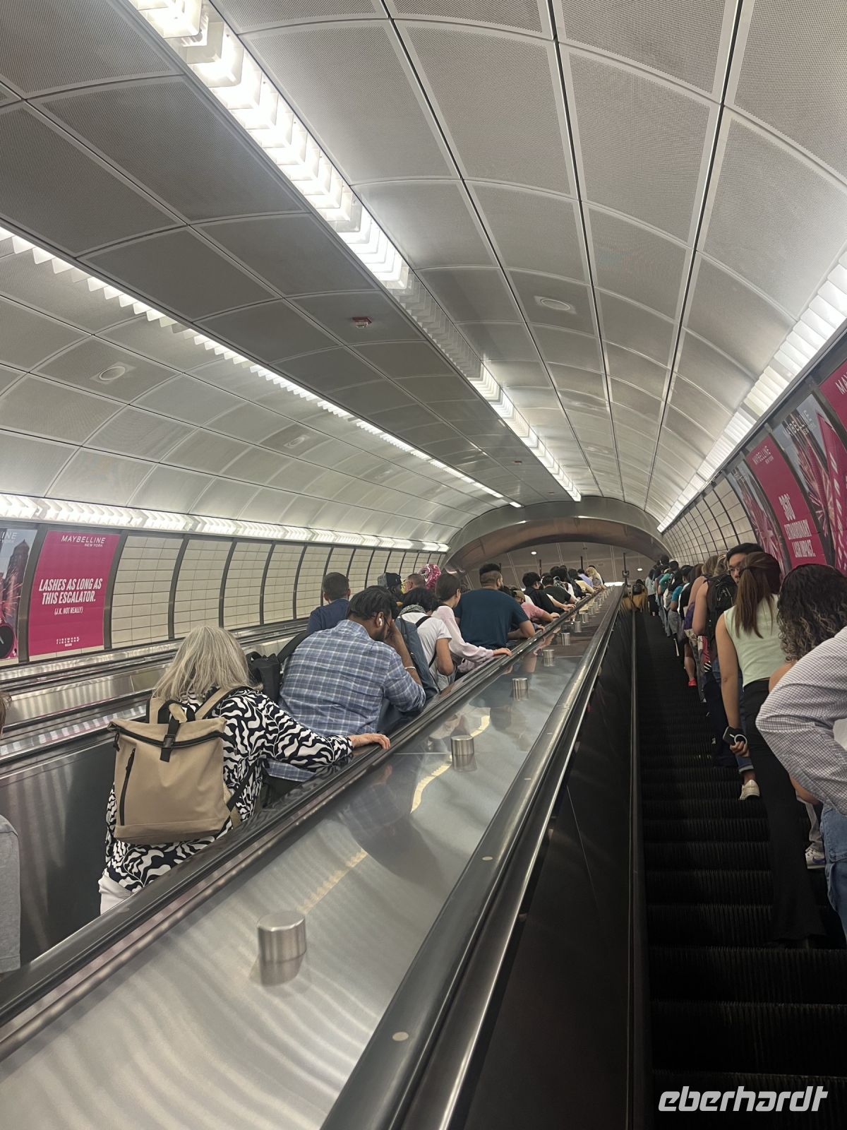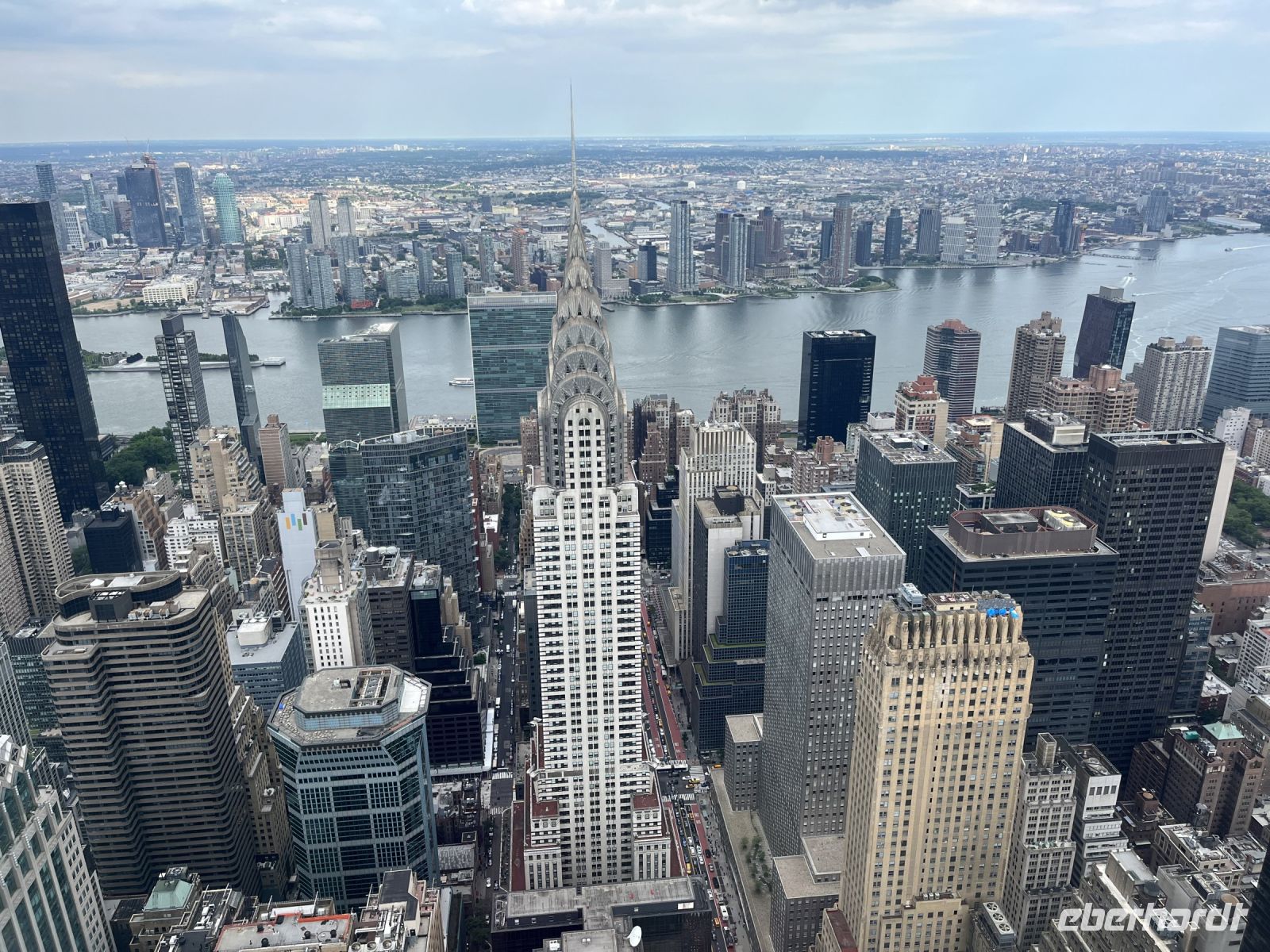 Heute nehmen wir die lila Linie direkt nach Hudson Yards. Hudson Yards ist einer der neueren Stadtteile Manhattans. Der Bau des Komplexes begann Ende 2012, und der erste Teil wurde Anfang 2019 eröffnet. Hier gibt es viel zu tun und zu sehen. The Vessel und andere markante Bauwerke verleihen dem Gebiet einen besonderen Charakter. Vor The Vessel haben wir auch einen tollen Ausblick auf die Aussichtsplattform The Edge in schwindelerregender Höhe. Wir nehmen uns noch kurz Zeit, um uns in dem angrenzenden Einkaufszentrum die Luxusboutiquen von Dior und Louis Vuitton anzusehen. Allerdings zeigt das "Eier steicheln" an der Wall Street doch noch keine Wirkung, so dass wir es beim Schauen belassen. Von hier aus führt uns der Weg an der Konzerthalle The Shed vorbei direkt auf die High Line. Sie ist eine 2,33 Kilometer lange, nicht mehr als solche genutzte Güterzugtrasse im Westen von Manhattan, die von 2006 bis 2019 zu einer Parkanlage, dem High Line Park, umgebaut wurde. Überall gibt es kleine Bänke, die zum Verweilen einladen. Wir spazieren entlang bis zur 14. Straße. Anschließend besuchen wir den Chelsea Market, der mit allerlei Geschäften und Spezialitäten lockt. Hier finden wir auch einen Stand mit Berliner Currywurst und deutschem Bier. Ein schönes Fotomotiv. Von hier aus satten wir Little Island einen kleinen Besuch ab. Der angelegte Park sieht natürlich aus der Ferne ganz besonders aus. An sich ist es nur ein Park, kann aber zu Recht als grüne Oase im Hudson bezeichnet werden. Es gibt Wanderwege, die zu den höchsten Punkten der Insel führen und wunderschöne Ausblicke auf Manhattan, New Jersey und den Hudson. Nach dem Besuch nehmen wir die Metro in Richtung Bryant Park, den wir kurz durchqueren, um zur Nationalbibliothek von New York zu kommen, die vor allem durch ihre pompösen Deckengemälde berühmt ist. Von hier aus trennen uns nur wenige Meter zu Fuß von unserer Aussichtsplattform des Summit One Vanderbilt Gebäudes gegenüber vom Grand Central Terminal. Die Aussichtsplattform des Summit One Vanderbilt erstreckt sich über drei Etagen des beeindruckenden Wolkenkratzers. Von hier aus haben wir nicht nur einen einzigartigen Blick auf das Empire State Building, das Chrysler Building, den Bryant Park und den Times Square, die sich alle in der Nähe befinden, sondern es bietet auch ein Kunsterlebnis, durch welches man hindurchgehen kann. Innen ist alles verspiegelt und es gibt einen Raum mit überdimensionalen Luftballons, die durch die Gegend fliegen. Danmit entstehen einmalige Fotomotive. Vermutlich war es für uns die meist beeindruckendste Aussichtsplattform auf unserer Reise.