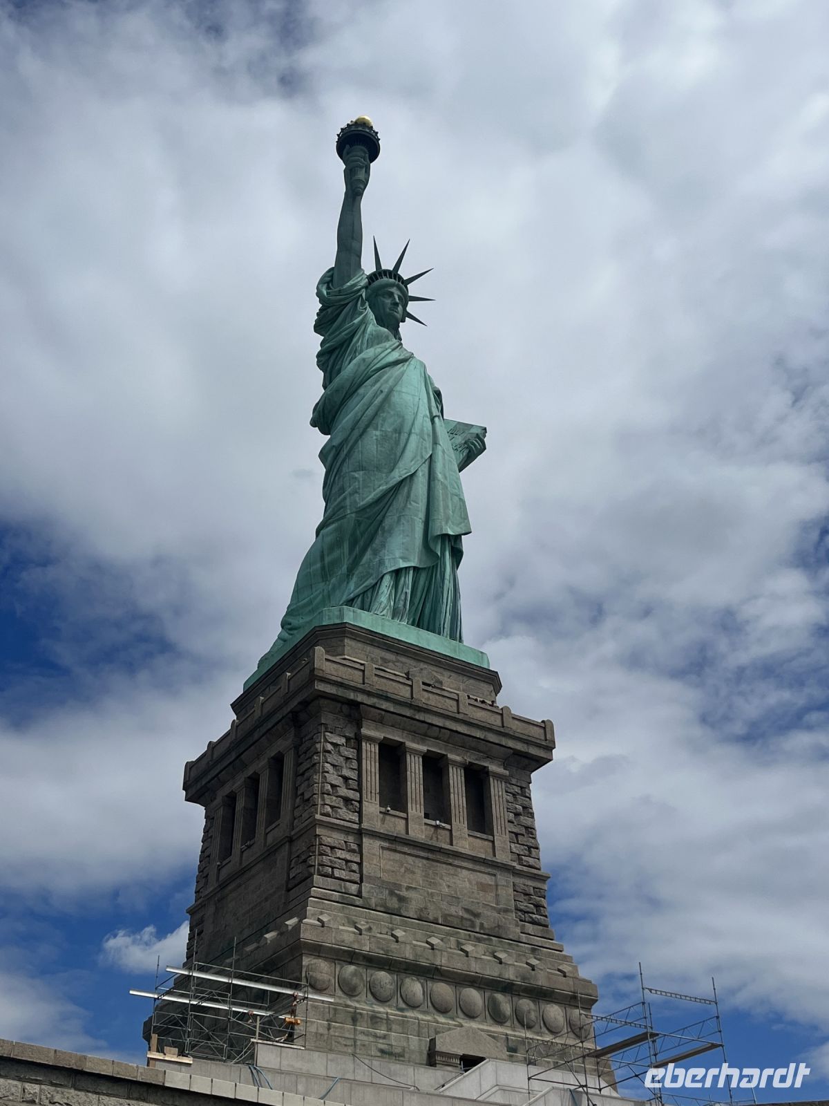 Heute unternehmen wir einen Ausflug nach Liberty und Ellis Island. Wir nehmen die rote Linie direkt an unserem Hotel bis zur Station South Ferry, wo die Boote nach Liberty und Ellis Island abfahren. Am Battery Park angekommen sehen wir schon eine lange Schlange und befürchten das Schlimmste, aber mit unseren Zeittickets kommen wir schnell an der Schlange vorbei und sind an der Sicherheitskontrolle, ehe wir uns versehen. Mit Kontrollen kennen wir uns spätestens nach dieser Reise auch bestens aus. Mit unserem Boot schippern wir gemütlich bis Liberty Island und genießen ein paar Sonnenstrahlen, von denen wir während unserer Reise wirklich sehr verwöhnt wurden. Hier angekommen bekommt jeder einen deutschen Audioguide und es bleibt viel Zeit, um die Insel und das angrenzende Museum auf eigene Faust zu erkunden. Unsere Tickets enthalten auch den Zugang zum Podest, von dem wir die Freiheitsstatue nioch näher betrachten können und welches uns eine unglaubliche Aussicht auf Mahattan bietet. Anschließend fahren wir weiter nach Ellis Island, dem Einwandermuseum. Die Audiogudies erzählen auf sehr authentische Weise die Geschichte von Millionen von Immigranten, die zwischen 1892 und 1954 hier ankamen. Vor unserem Besuch genießen wir noch ein amerikanisches Mittagessen mit Fish und Chips oder Pizza mit Blick auf Manhattan. Anschließend fahren wir mit dem Boot wieder zum Festland und nehmen die Metro zurück zu unserem Hotel. Den restlichen Nachmittag nutzen einige Gäste, um bei Macys einzukaufen, dass direkt um die Ecke vom Hotel liegt und mit vielen Rabatten lockt. Einige ruhen sich sicher auch aus, da wir täglich mehrere Kilometer zu Fuß unterwegs sind. Nach einer kurzen Pause im Hotel nehmen wir die Metro in Richtung Top of the Rock am Rockefeller Center sehen den großen, goldenen Engel und die Fahnen, die wir aus vielen Filmen kennen. Anschließend fahren wir zum Top of the Rock und genießen hier eine unvergleichbare Aussicht auf das Empire State Building bei Sonnenuntergang. Ein ganz mutiger Herr der Gruppe traut sich sogar auf die neueste Attraktion "The Beam", ein Balken, der 3 Meter nach oben gefahren wird und sich einmal um die eigene Achse dreht. Es entstehen tolle Fotomotive. Müde aber glücklich nehmen wir die Metro zum Hotel und fallen in unsere Betten.