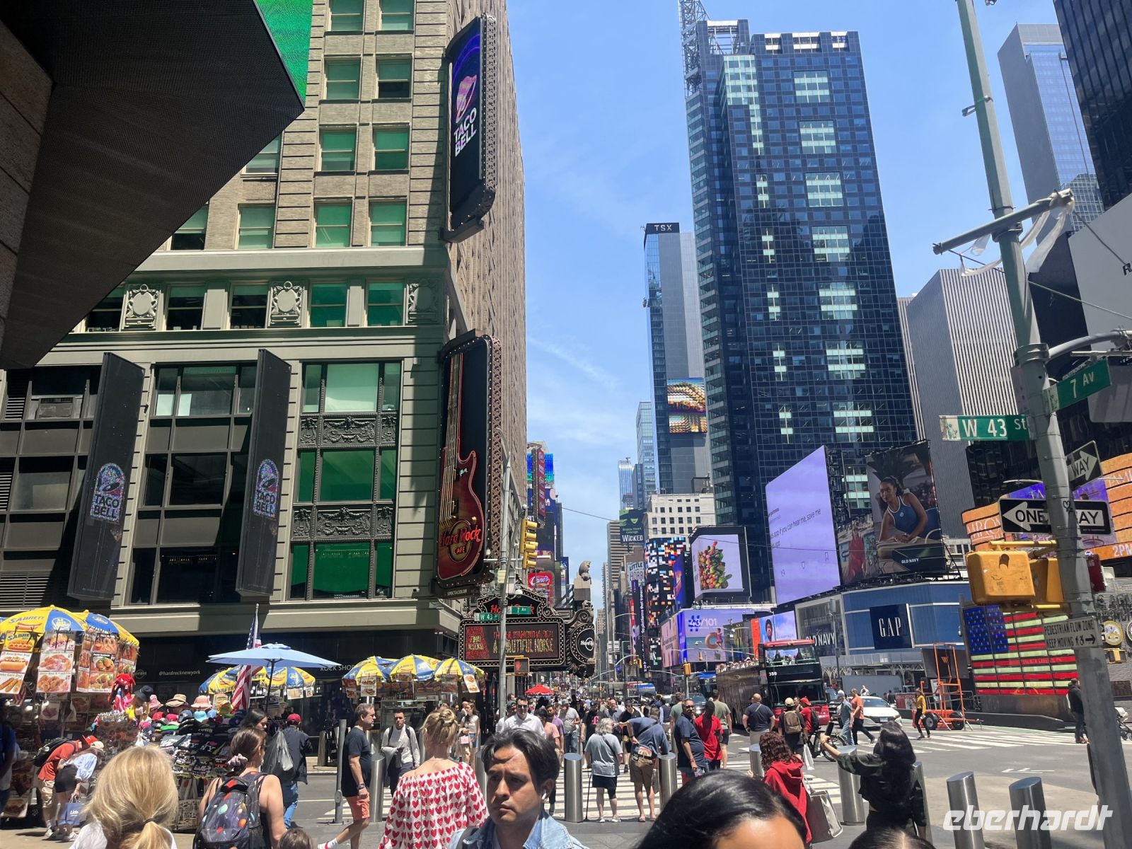 Am zeitigen Morgen trafen sich die ersten Reisefreudigen meiner 12-köpfigen New York Singlegruppe am Flughafen in Dresden. Bereits bei den Telefonaten an den Vortagen konnten letzte Fragen geklärt werden und so freuten wir uns sehr auf unsere gemeinsame Reise und auf unser Städterlebnis Big Apple- New York City. Nach dem Check-In am Flughafen Dresden, begaben wir uns zu unserem Abfluggate und flogen pünktlich zu unserer ersten Station nach Frankfurt am Main. Hier angekommen nahmen wir herzlich unsere Mitreisenden in Empfang, die Frankfurt direkt oder von anderen Ausgangsflughäfen erreichten. Die Chemie stimmte sofort und so entschieden wir uns bereits am ersten Tag schon für das "Du". Mit etwas Verspätung brachte uns die Lufthansa nach 8 Stunden Flugzeit nach New York. Dank der Zeitverschiebung von 6 Stunden, erreichten wir die Metropole am Nachmittag. Ein paar Fingerabdrücke später waren wir froh, dass all unsere Koffer angekommen und wir herzlich von Asja, unserer örtlichen Reiseleiterin für die nächsten zwei Tage begrüßt worden. Bereits auf dem Weg zum Hotel direkt in Manhattan erfuhren wir schon viel Wissenswertes über die Stadt und konnten es kaum erwarten, die Stadt in den nächsten Tagen zu erkunden. Wir erreichten unser Hotel "Hilton Garden Inn" in der 28. Straße, die jeden Tag herrlich mit Blumen und Pflanzen geschmückt war (die New Yorker nennen Sie auch liebevoll Blumenstraße), am späten Nachmittag und bezogen die Zimmer. Unterwegs wurden wir auch mit dem Blick auf das Empire State Building belohnt. Am Abend trafen wir uns wieder und liefen zu Fuß zu unserem Restaurant, das gleich um die Ecke lag. Bevor wir aber zu Abend essen, entscheiden wir uns noch für einen kurzen Spaziergang zum Times Square, auch wenn alle sehr müde sind. Schnell erkannten wir, dass es sich bei den Querstraßen um Streets und bei den Längsstraßen um Avenues handelt. Später haben wir nur noch von 28. Straße zwischen 7. und 6. Avenue gesprochen. Wahrscheinlich werdet ihr dies auch noch im Traum hören. Beeindruckt von den Leuchtreklamen am Times Square, waren wir dann aber doch froh, dass wir unser Restaurant sicher erreichten. Langsam macht sich die Zeitverschiebung bemerkbar und so spazieren wir nach italienischer Küche zurück zum Hotel und freuen uns auf die nächsten Tage.