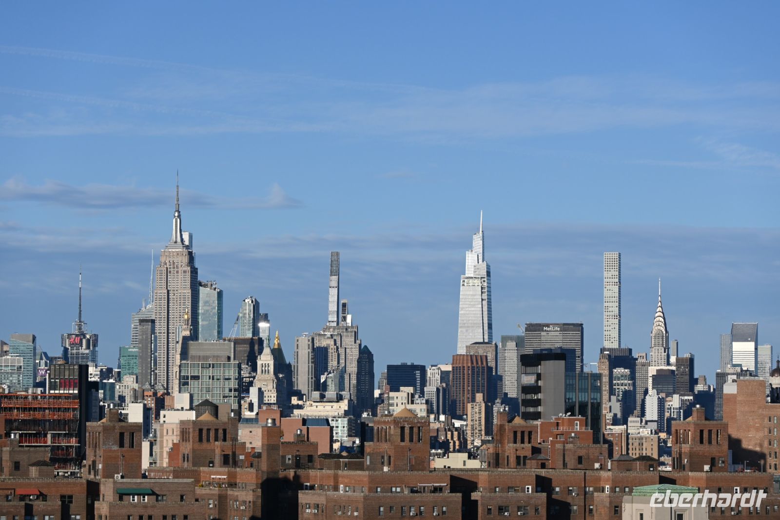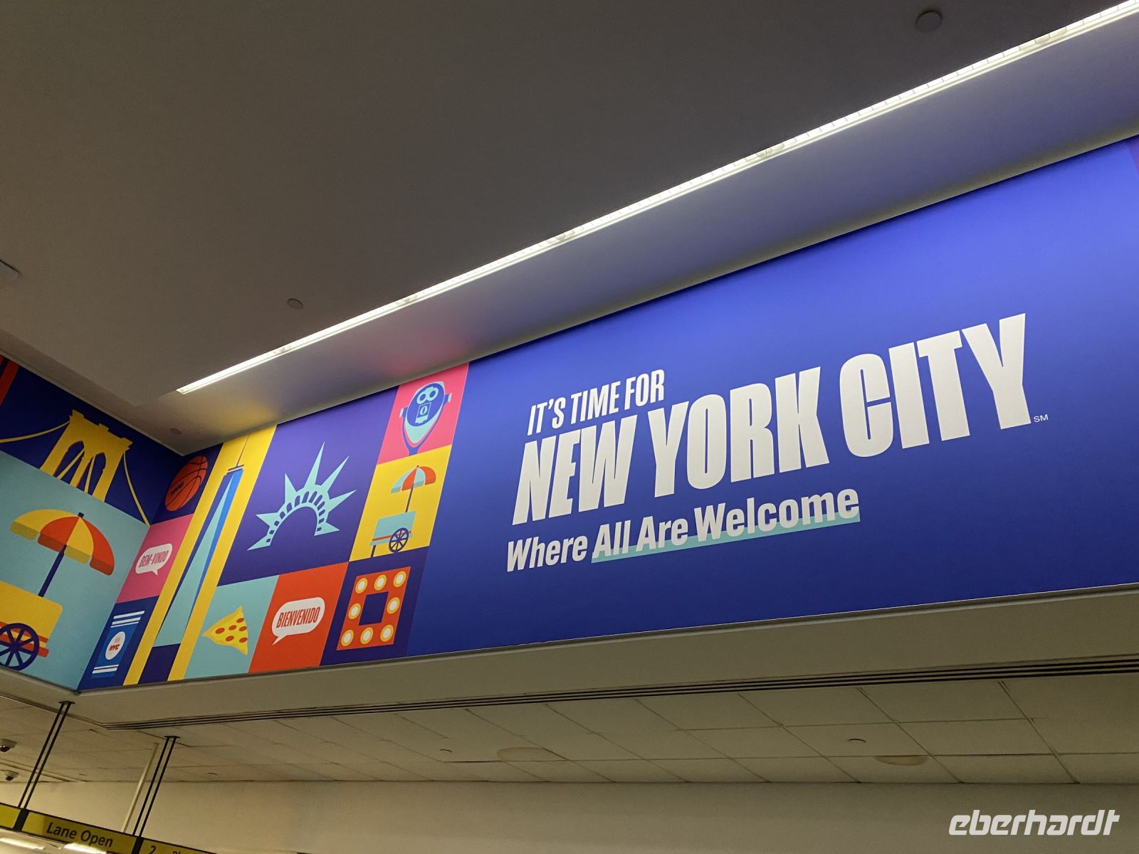 Am Vormittag trifft sich die Gruppe am Gate Z69 des Terminal 1 am Flughafen Frankfurt. Ein Teil der Gruppe kommt mit mir aus Dresden geflogen, andere sind gestern schon mit der Bahn angereist und haben im Flughafenhotel geschlafen. 10.20 Uhr soll das Boarding für unsere Boing 747-400 starten, die passiert jedoch mit etwas Verspätung. Diese können wir bei den neun Stunden Flugzeit auch nicht mehr aufholen und treffen nach einem ruhigen Flug, am Nachmittag am John F. Kennedy Airport in New York ein. Aus dem Flieger raus heißt es erstmal anstehen. Wir müssen die Einreisekontrolle passieren und sind mit ESTA, Gesundheitsbescheinigung, Impfnachweis und Pass bestens vorbereitet. Nach und nach schließen allerdings die Schalter der Kontrollen nach und nach und nur noch zwei bleiben übrig, damit verläuft das Prozedere immer langsamer. Nach zwei Stunden haben wir es dann doch endlich geschafft, holen unsere Koffer und dann ab nach draußen. In der Flughafenhalle wartet schon unsere Reiseleiterin Fatima. Sie führt uns zum Bus und innerhalb von etwas mehr als einer Stunde sind wir schon im Hotel. Der Check-in geht ebenfalls schnell und wir beziehen unsere Zimmer. Damit keiner erst müde wir, denn in Deutschland ist es ja bereits nach Mitternacht, treffen wir uns direkt wieder und laufen gemeinsam zum Abendessen.