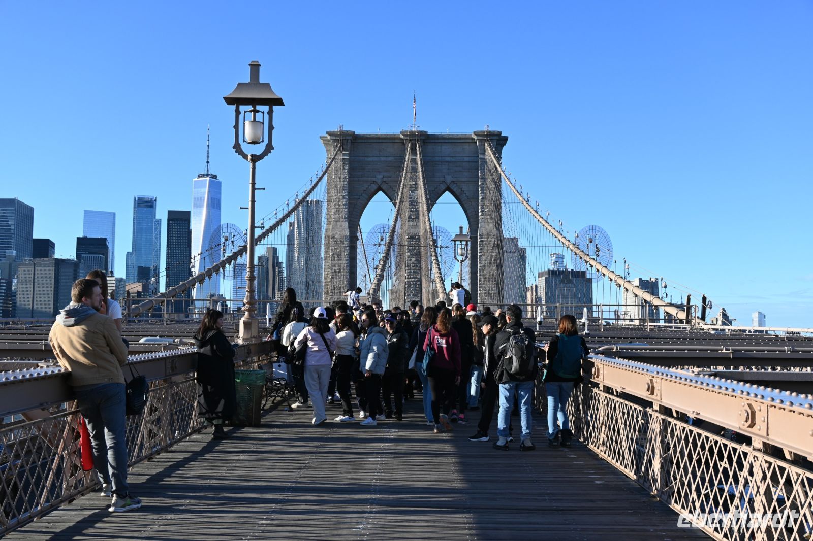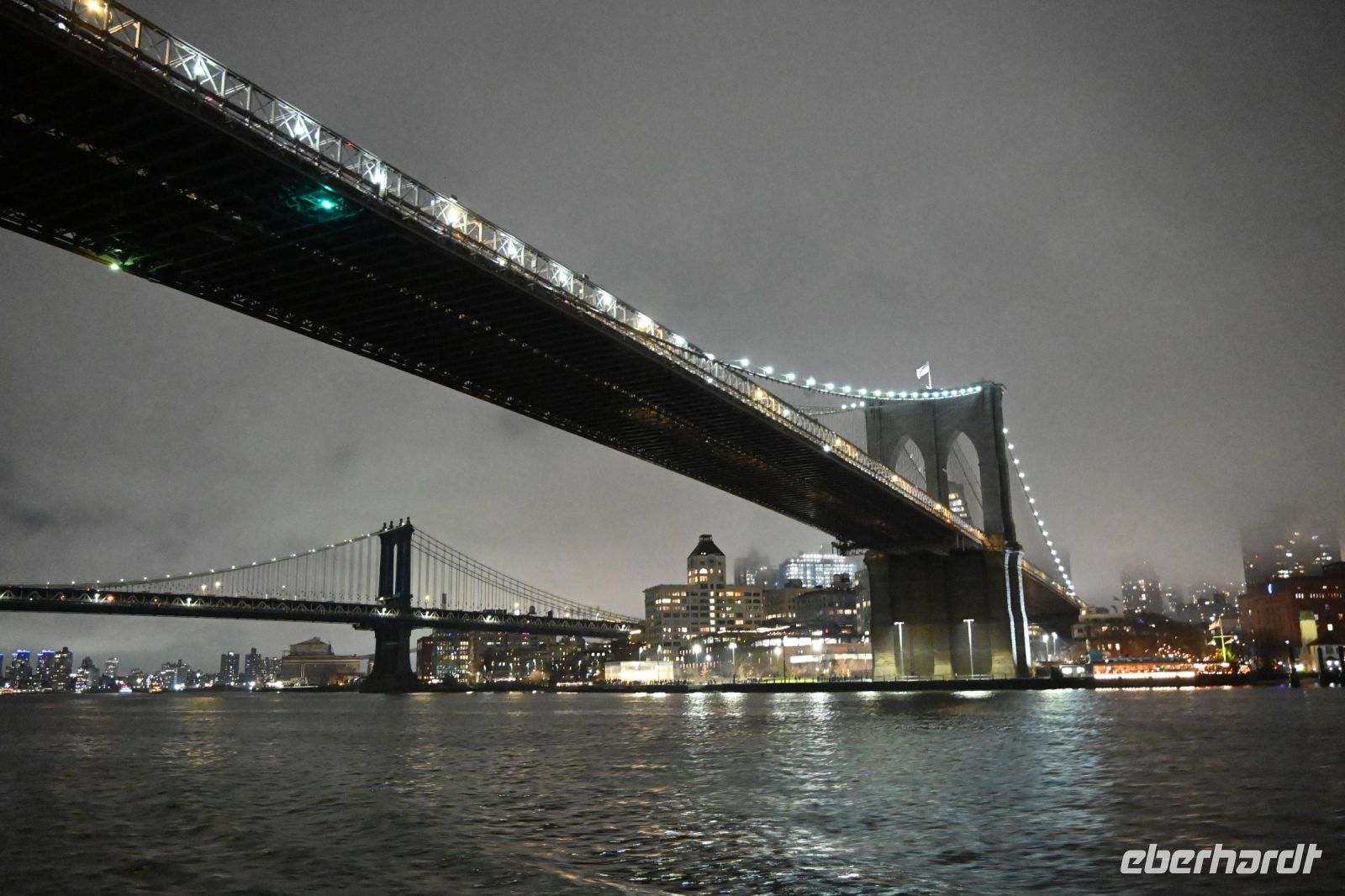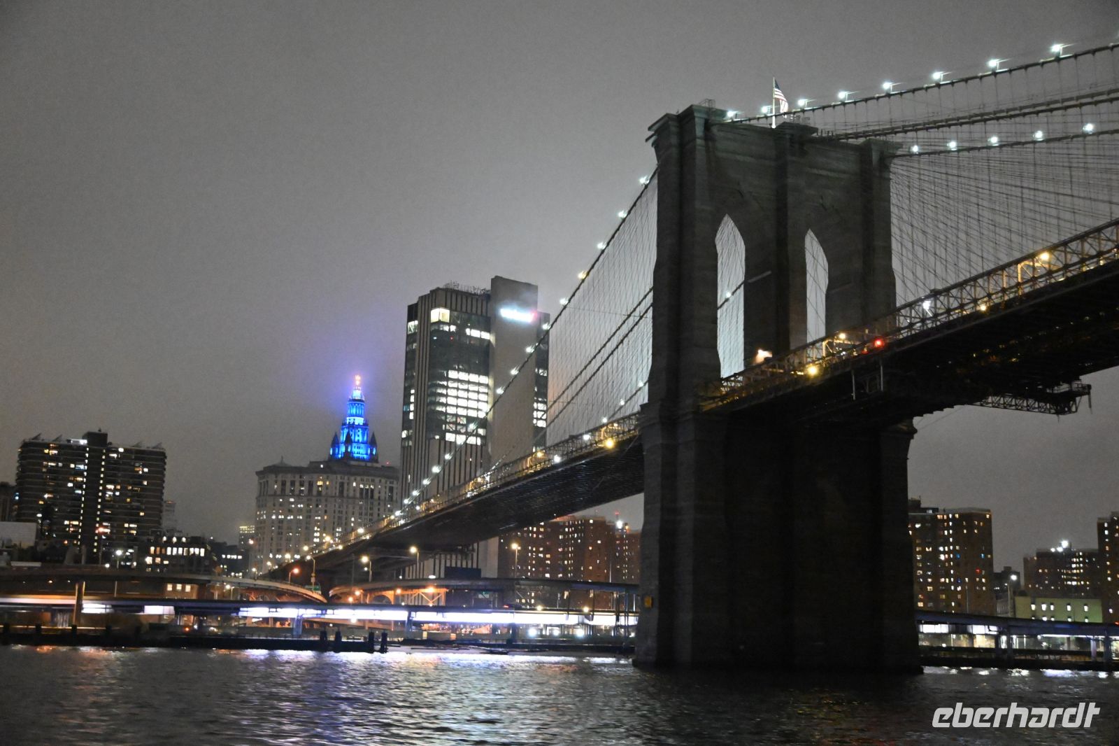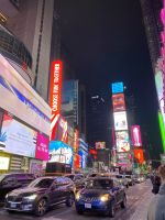 Mit der U-Bahn geht es für uns wieder Richtung Downtown und diesmal etwas weiter durch den Tunnel nach Brooklyn. Nach einem kleinen Spaziergang durch das Viertel DUMBO nehmen wir die etwas versteckte Treppe hinauf zur Brooklyn Bridge. Viele Menschen haben den gleichen Plan, wie wir, sie wollen die Brücke Richtung Manhattan überqueren. Viele Bilder werden an den unterschiedlichen Punkten gemacht. Es ist nicht mehr lang bis zum Sonnenuntergang, weswegen immer mehr Menschen auf die Brücke strömen. Kurz vor dem Ende geht dann gar nichts mehr, man kommt weder vor noch zurück. Da wäre man sogar mit dem Auto mal schneller. Mit etwas drängeln und quetschen kommen wir doch noch von der Brücke runter. Bis die Gruppe wieder vollständig ist, dauert es eine Weile. Nach kurzer Pause im Hotel, brechen wir auf zu unserem letzten Abendessen. Die Aufregung am Time Square hat sich wieder etwas gelegt und an die gestrige Feier erinnert nur noch das viele bunte Konfetti. Im Restaurant Bubba Gump herrscht aber auch reges Treiben. Die Restaurantkette wurde durch den bekannten Film "Forrest Gump" inspiriert und erreichte einen großen Erfolg in der USA.