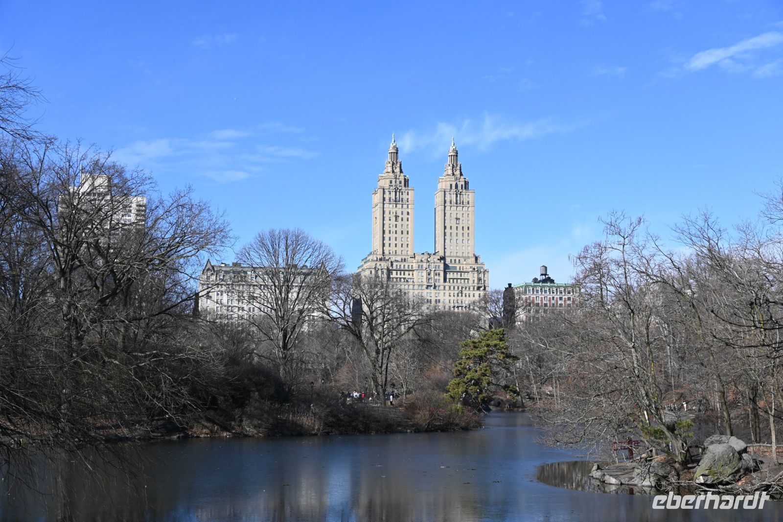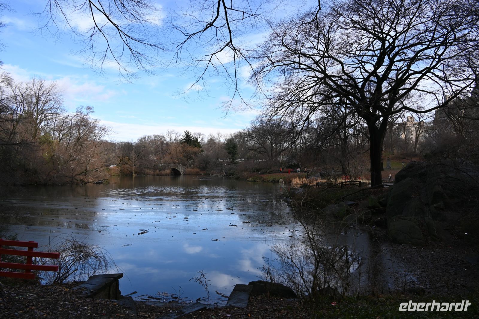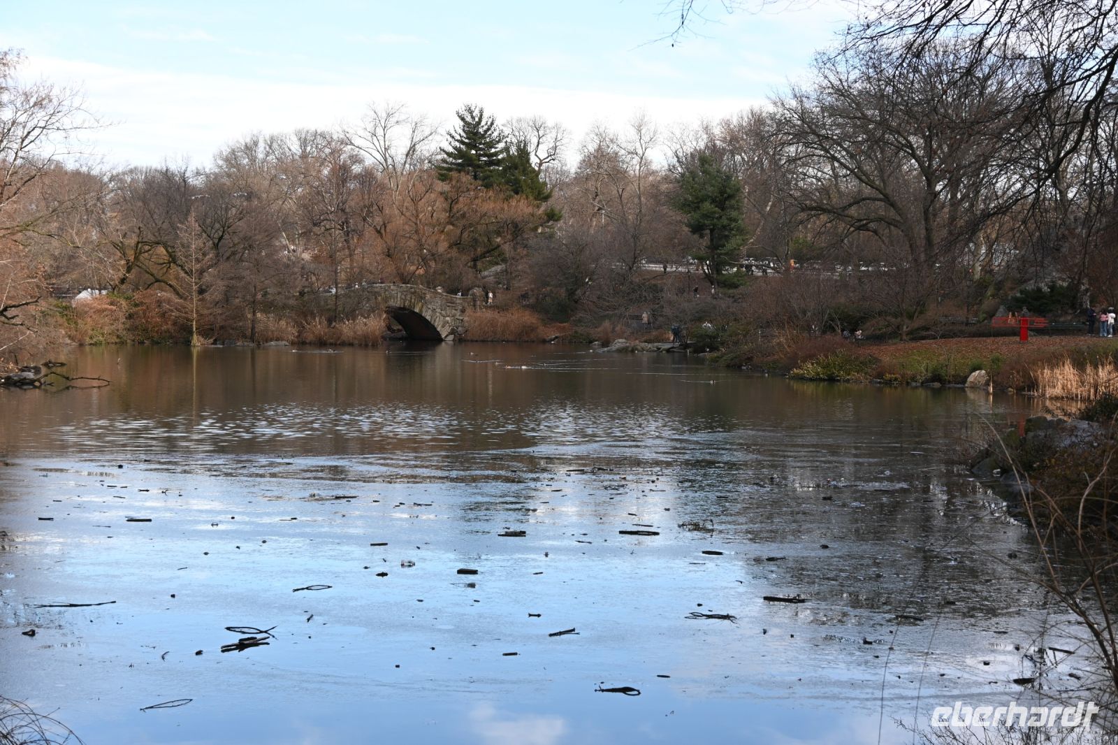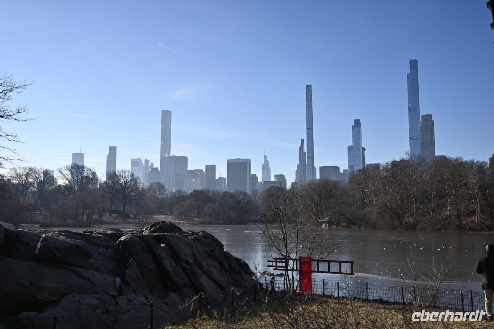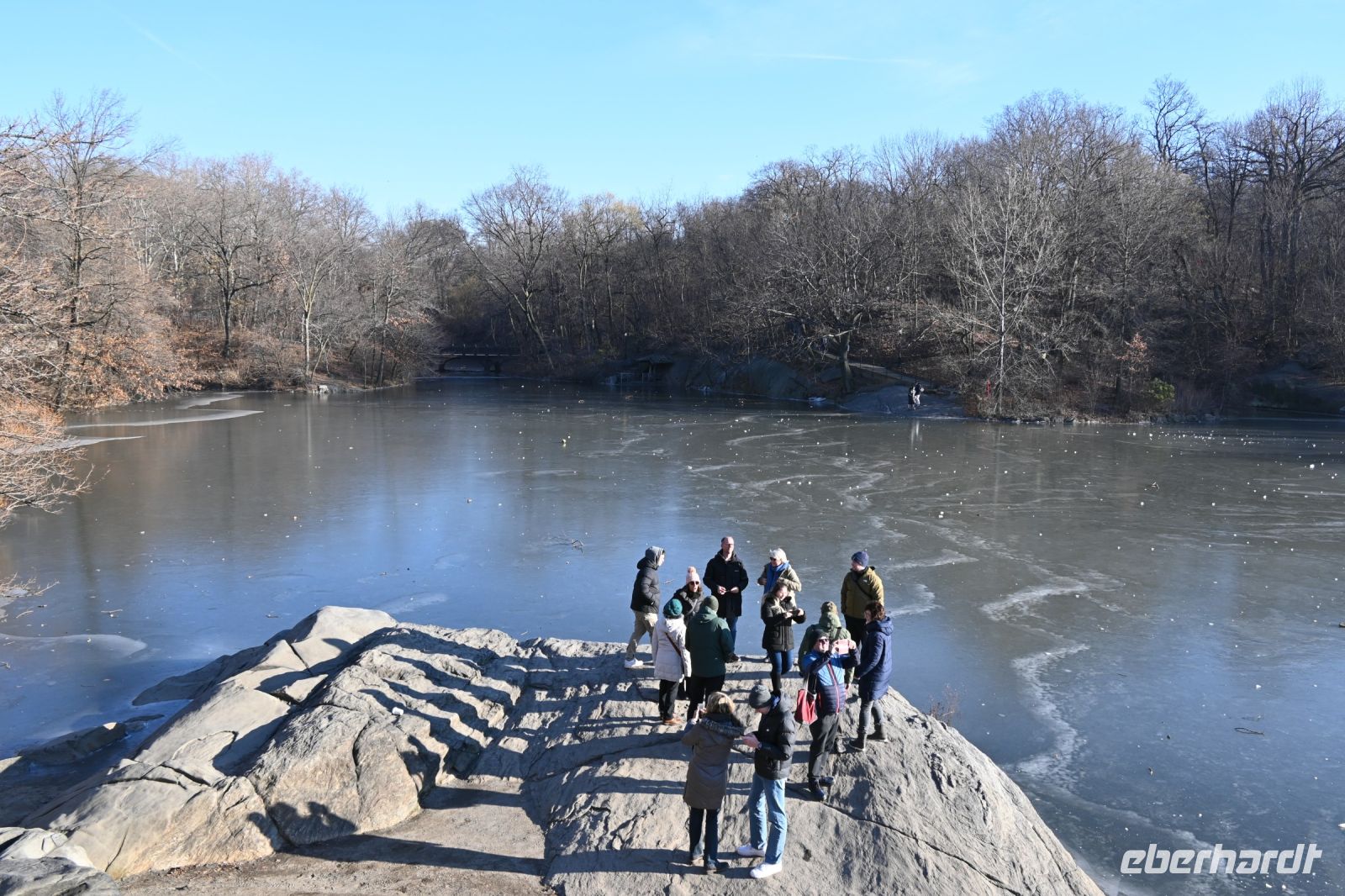 Pünktlich 9 Uhr sitzen wir alle in unserem kleinen Reisebus und unser Busfahrer Frank und Fatima zeigen uns ihre Stadt. Erstmal fahren wir Uptown, also Richtung Norden zum Central Park. Fatima will uns die Ecken zeigen, die wir in den nächsten Tagen nicht sehen werden und obwohl der Stadtteil Manhattan nur circa 22 Kilometer lang und maximal 4 Kilometer breit ist, gibt es viel zu sehen. Den ganzen Tag begleitet uns ein herrlicher Sonnenschein, also können wir viele Stopps einlegen und auch etwas zu Fuß gehen. Damit uns die Stadt nicht gleich völlig erschlägt, halten wir im westlichen Teil des Central Park. In den Tagen über Weihnachten, kam eine Kältewelle aus dem Westen und in New York gab es Temperaturen von -25°C. Der kleine See hier ist noch zugefroren, jedoch ist das Betreten strengstens verboten. Eine wirkliche schöne Stelle für einen Stopp, über den Park hinweg, sieht man die Skyline und wir haben die Sonne im Gesicht.