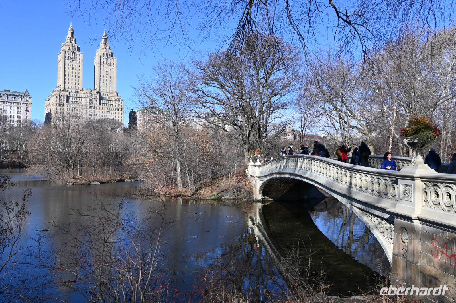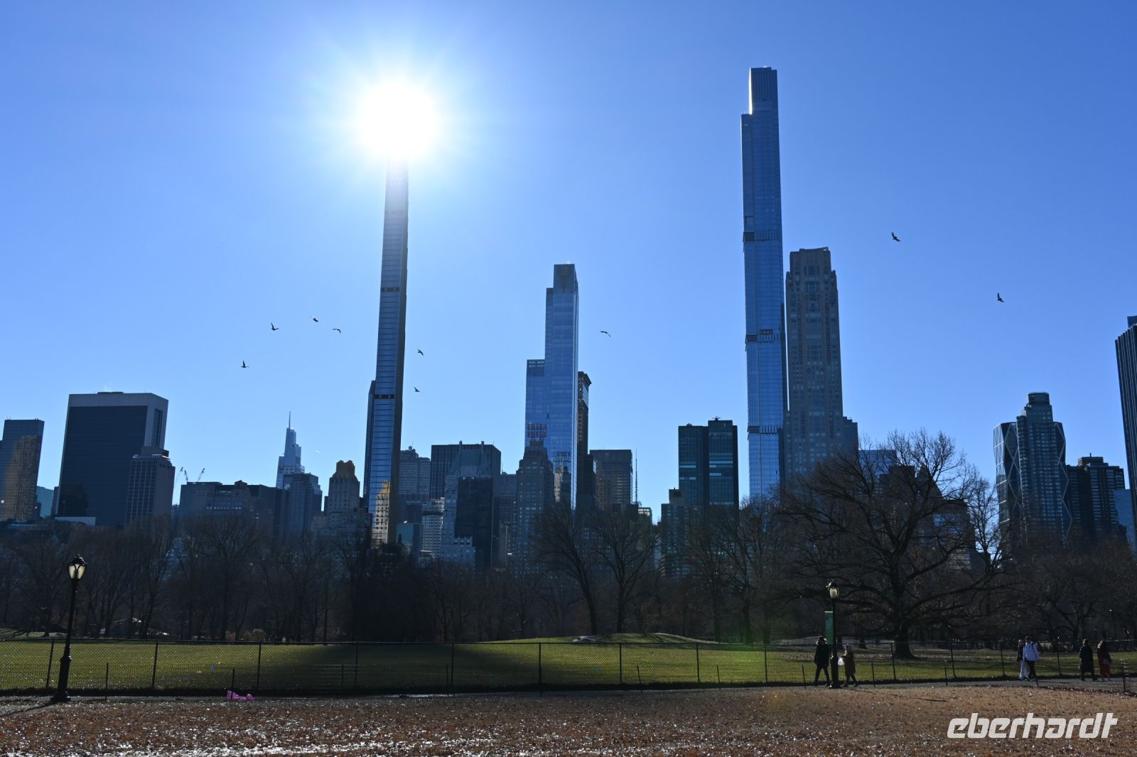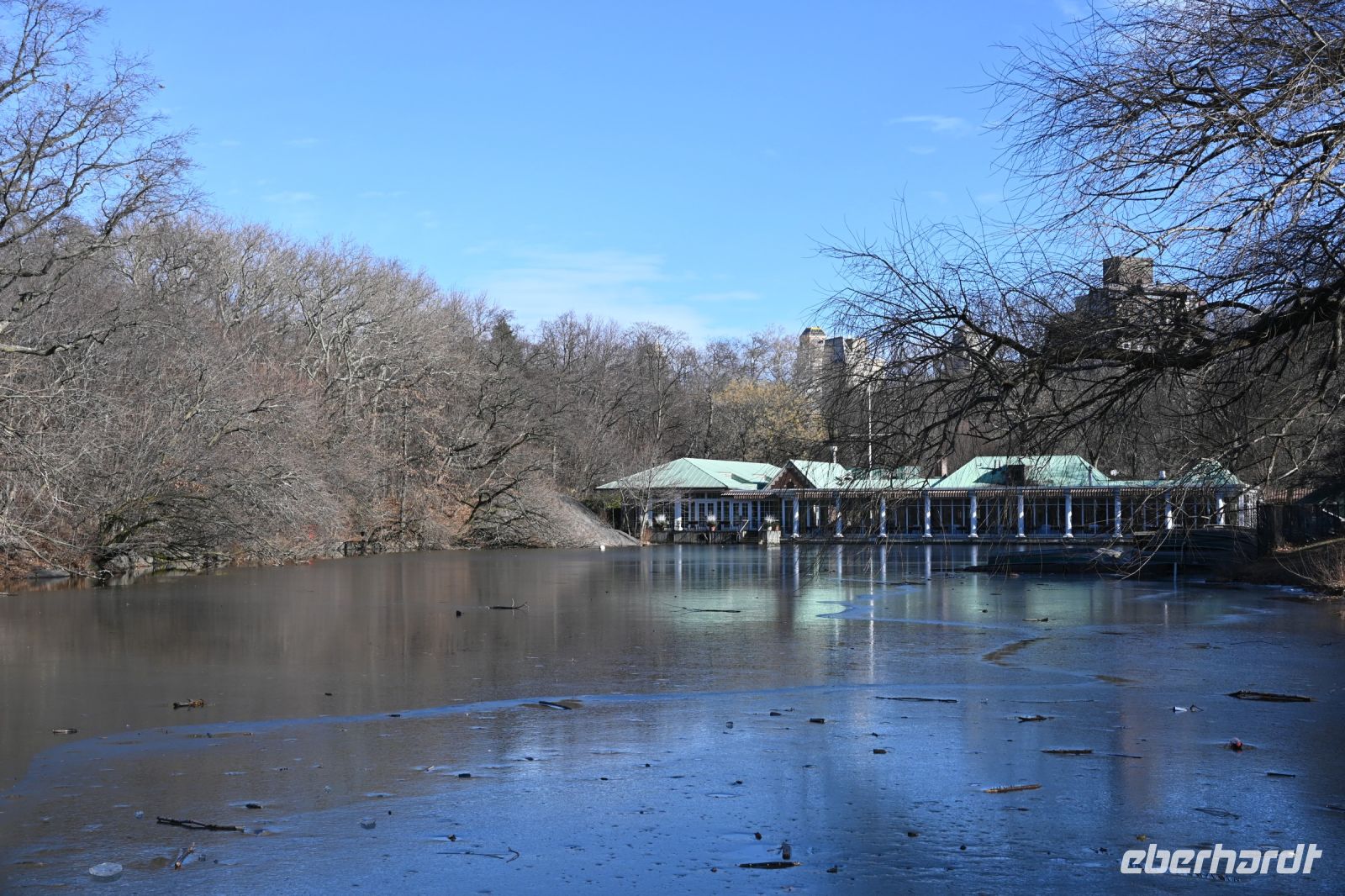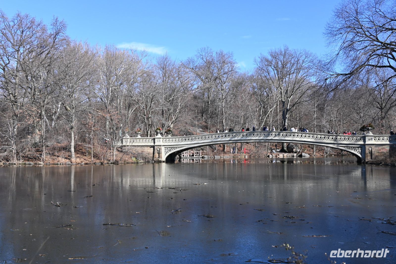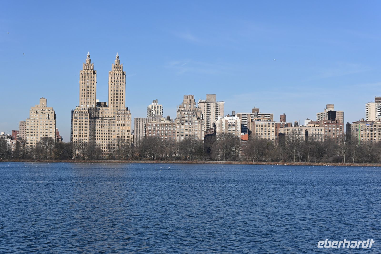 Pünktlich 9 Uhr sitzen wir alle in unserem kleinen Reisebus und unser Busfahrer Frank und Fatima zeigen uns ihre Stadt. Erstmal fahren wir Uptown, also Richtung Norden zum Central Park. Fatima will uns die Ecken zeigen, die wir in den nächsten Tagen nicht sehen werden und obwohl der Stadtteil Manhattan nur circa 22 Kilometer lang und maximal 4 Kilometer breit ist, gibt es viel zu sehen. Den ganzen Tag begleitet uns ein herrlicher Sonnenschein, also können wir viele Stopps einlegen und auch etwas zu Fuß gehen. Damit uns die Stadt nicht gleich völlig erschlägt, halten wir im westlichen Teil des Central Park. In den Tagen über Weihnachten, kam eine Kältewelle aus dem Westen und in New York gab es Temperaturen von -25°C. Der kleine See hier ist noch zugefroren, jedoch ist das Betreten strengstens verboten. Eine wirkliche schöne Stelle für einen Stopp, über den Park hinweg, sieht man die Skyline und wir haben die Sonne im Gesicht.