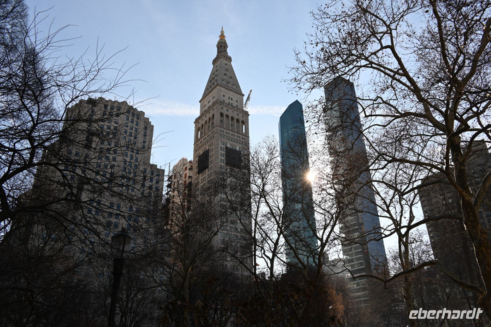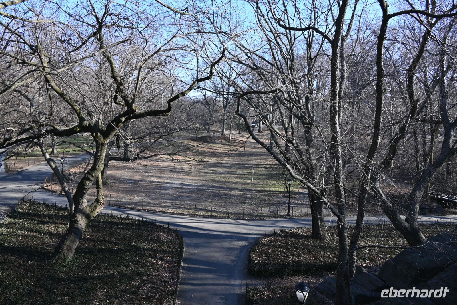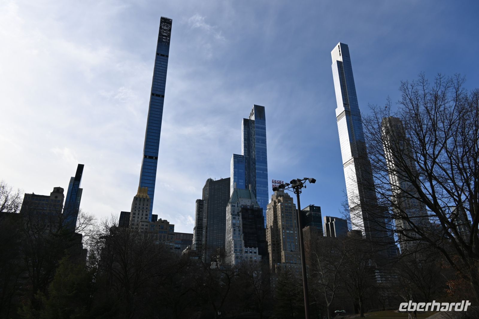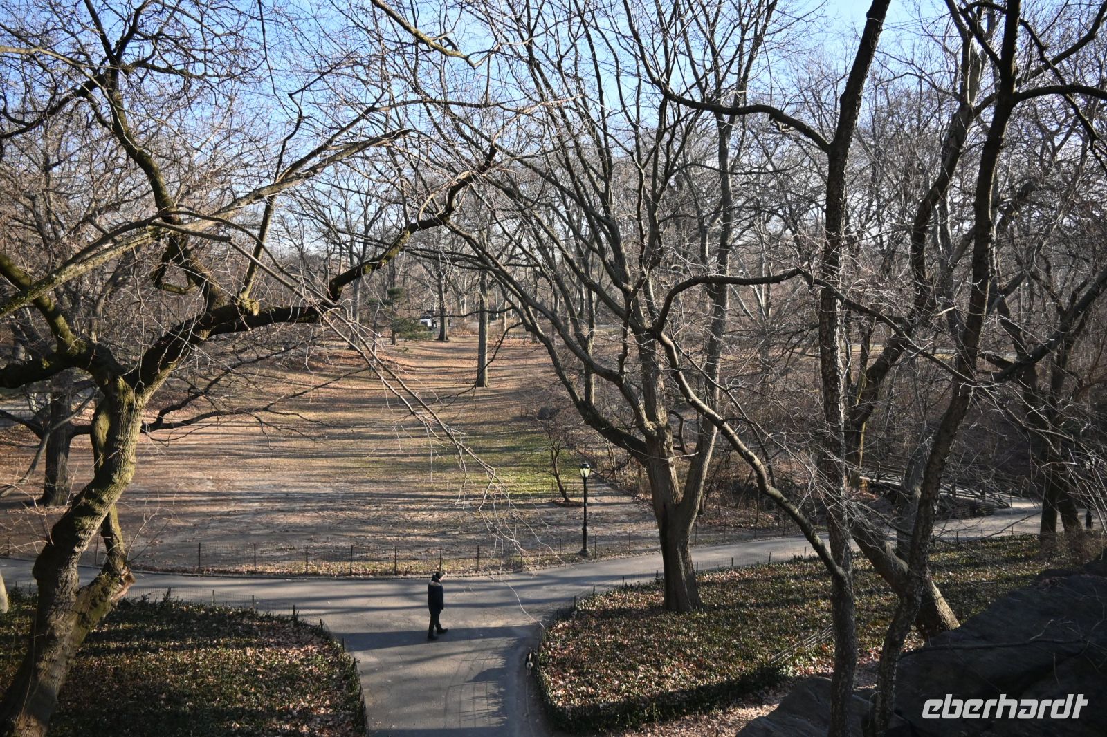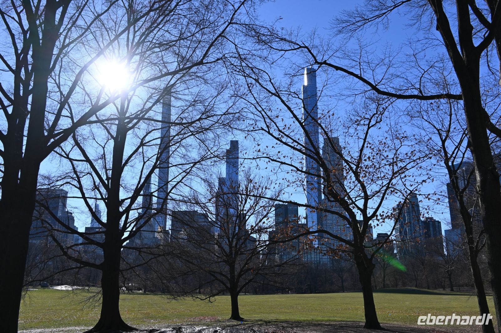 Pünktlich 9 Uhr sitzen wir alle in unserem kleinen Reisebus und unser Busfahrer Frank und Fatima zeigen uns ihre Stadt. Erstmal fahren wir Uptown, also Richtung Norden zum Central Park. Fatima will uns die Ecken zeigen, die wir in den nächsten Tagen nicht sehen werden und obwohl der Stadtteil Manhattan nur circa 22 Kilometer lang und maximal 4 Kilometer breit ist, gibt es viel zu sehen. Den ganzen Tag begleitet uns ein herrlicher Sonnenschein, also können wir viele Stopps einlegen und auch etwas zu Fuß gehen. Damit uns die Stadt nicht gleich völlig erschlägt, halten wir im westlichen Teil des Central Park. In den Tagen über Weihnachten, kam eine Kältewelle aus dem Westen und in New York gab es Temperaturen von -25°C. Der kleine See hier ist noch zugefroren, jedoch ist das Betreten strengstens verboten. Eine wirkliche schöne Stelle für einen Stopp, über den Park hinweg, sieht man die Skyline und wir haben die Sonne im Gesicht.
