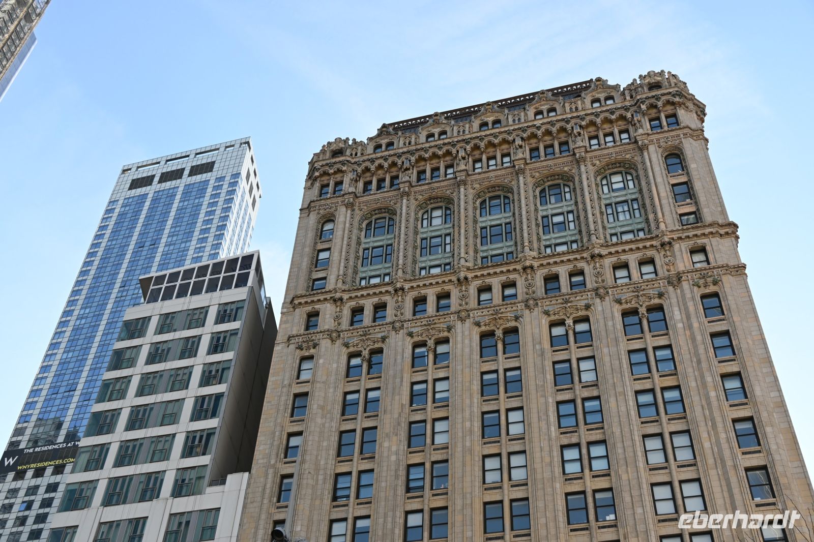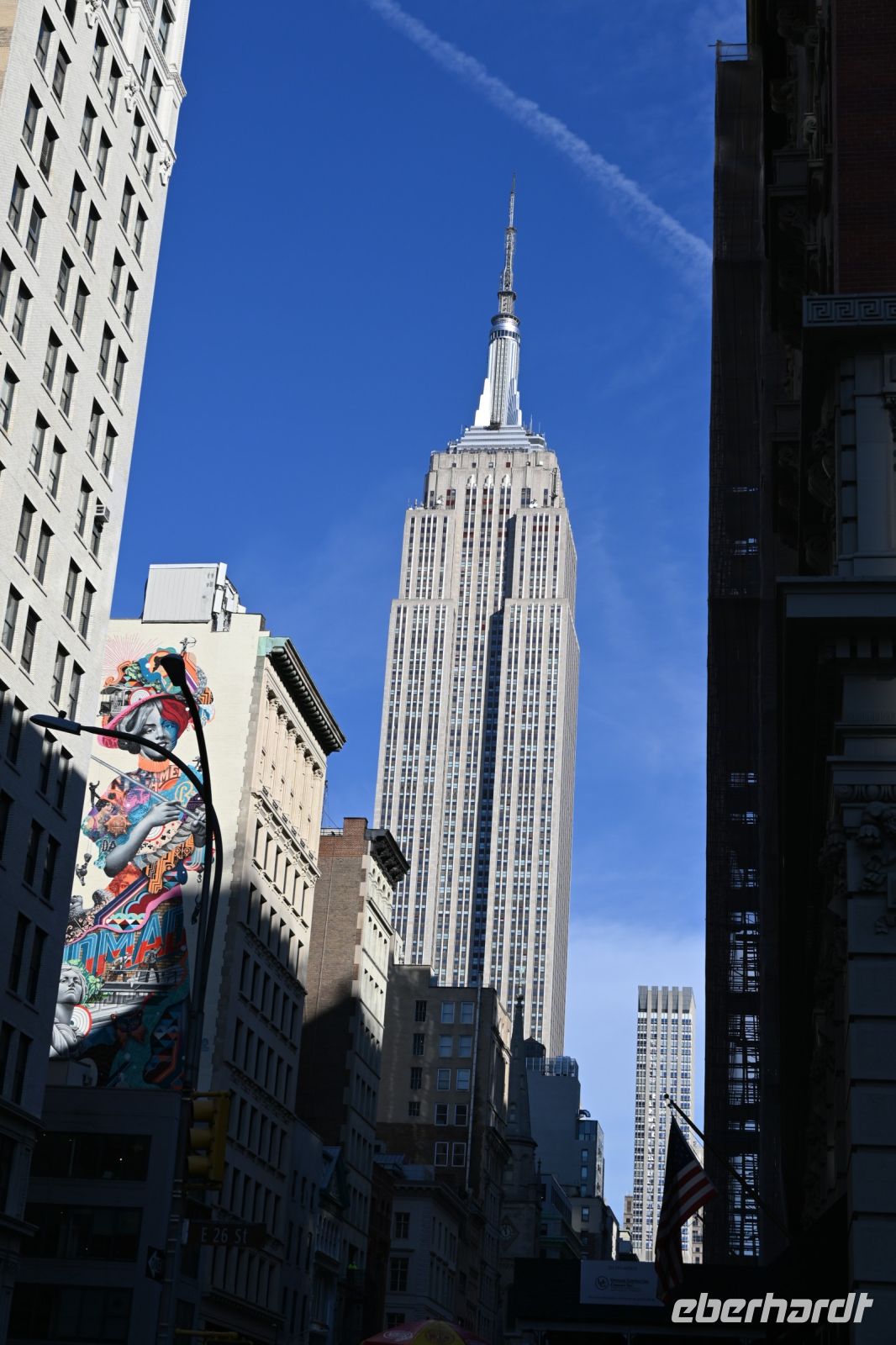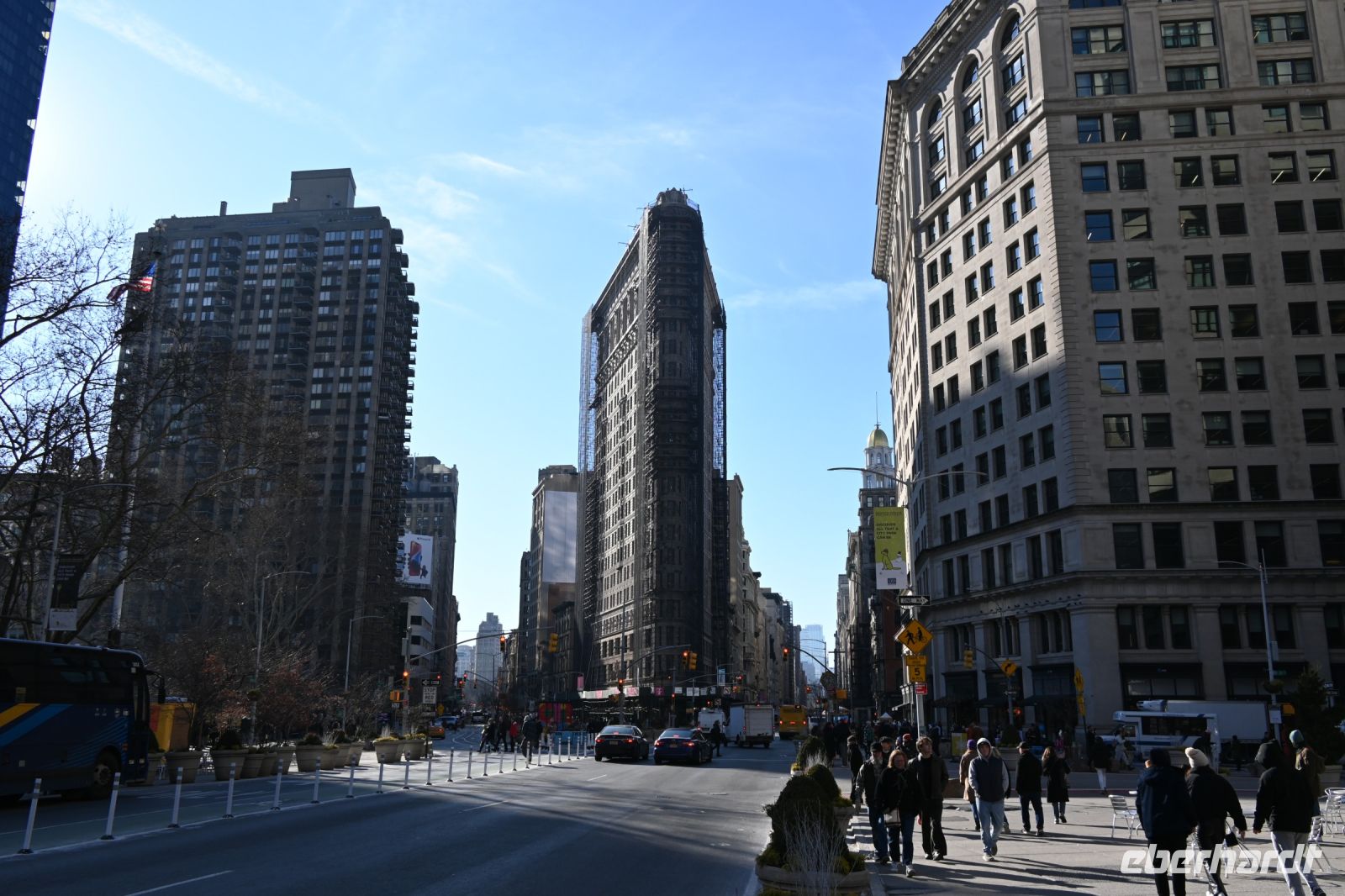 Es geht für uns jetzt wieder Downtown, also nach Süden, entlang des östlichen Ende des fünf Kilometer langen Central Parks. Dieser wurde 1857 angelegt und besteht, ähnlich wie der Stadtteil Manhatten, aus mehreren kleinen Teilen. Der Boden des Parks besteht aus Granitstein, welcher immer wieder kleine Hügel formt und so Höhen und Tiefen im Park entstehen lässt. Entlang der 5th Avenue kommen wir weiter Richtung Süden und vor uns werden die Häuser immer höher. Einen Halt machen wir noch am Bügeleisenhaus. Aufgrund der Form wurde das Flatiron Building ein Wahrzeichen von New York. Aktuell steht das Gebäude leer und wird umfassend renoviert, vorher wurde es als Bürogebäude von verschiedenen Firmen genutzt. An diesem Platz wird etwas vereint, was ein New Yorker sehr gerne hat, so erzählt uns Fatima. Man kann zwei Sachen gleichzeitig entdecken bzw. erledigen. Entlang der 5th Avenue hat man nämlich auch einen schönen Blick auf das Empire State Building, welches auch nur drei Straßen von unserem Hotel entfernt ist.