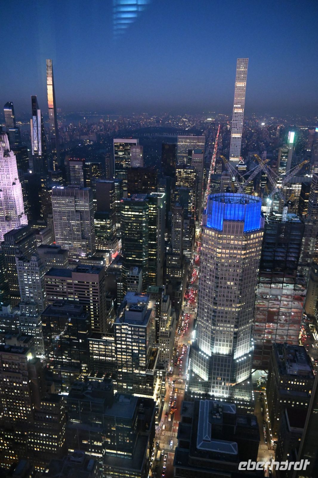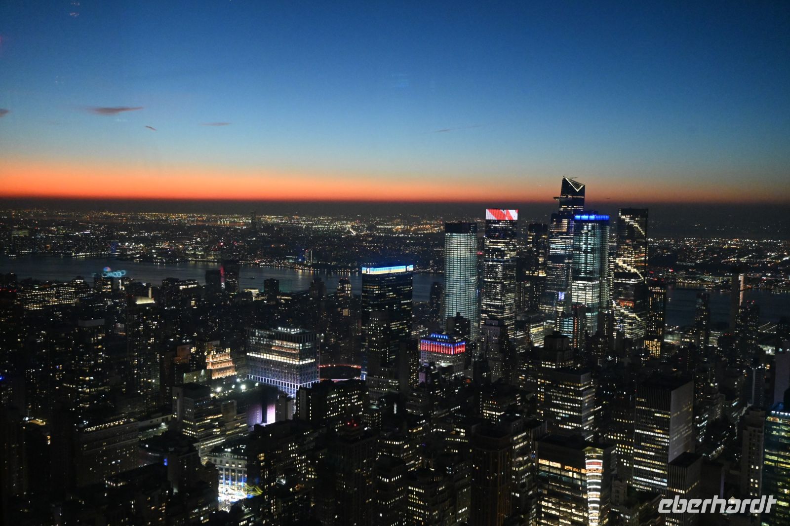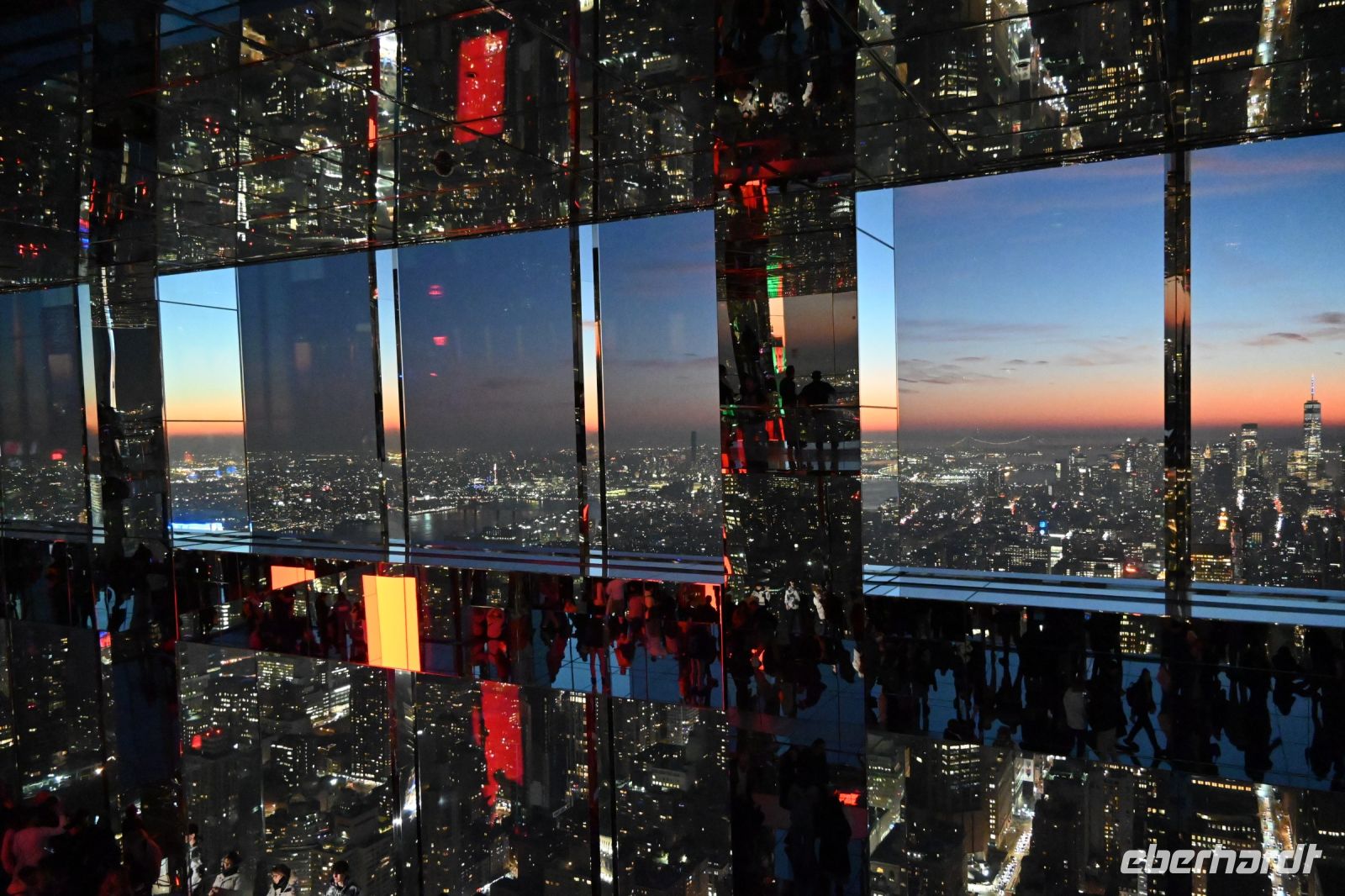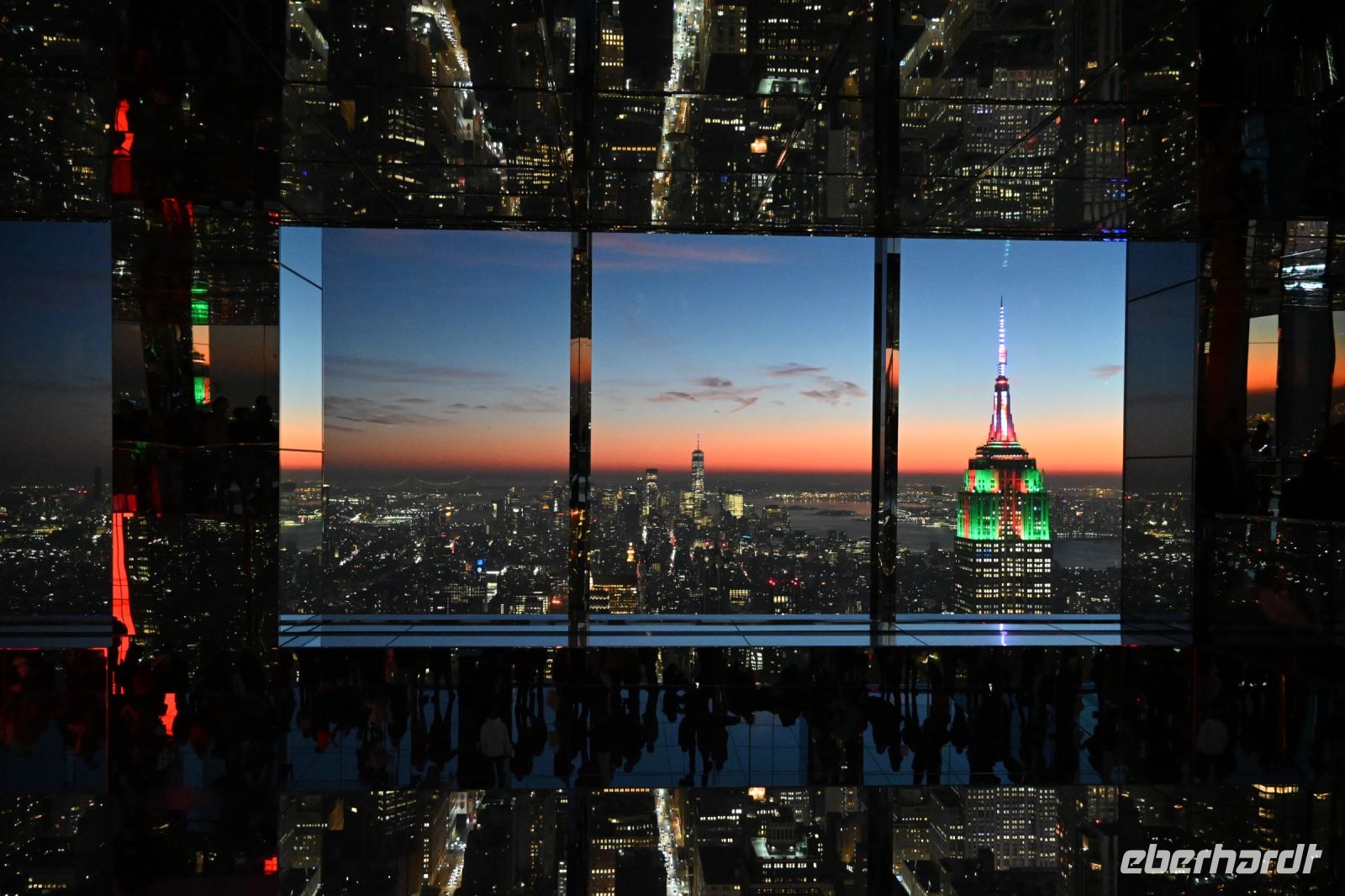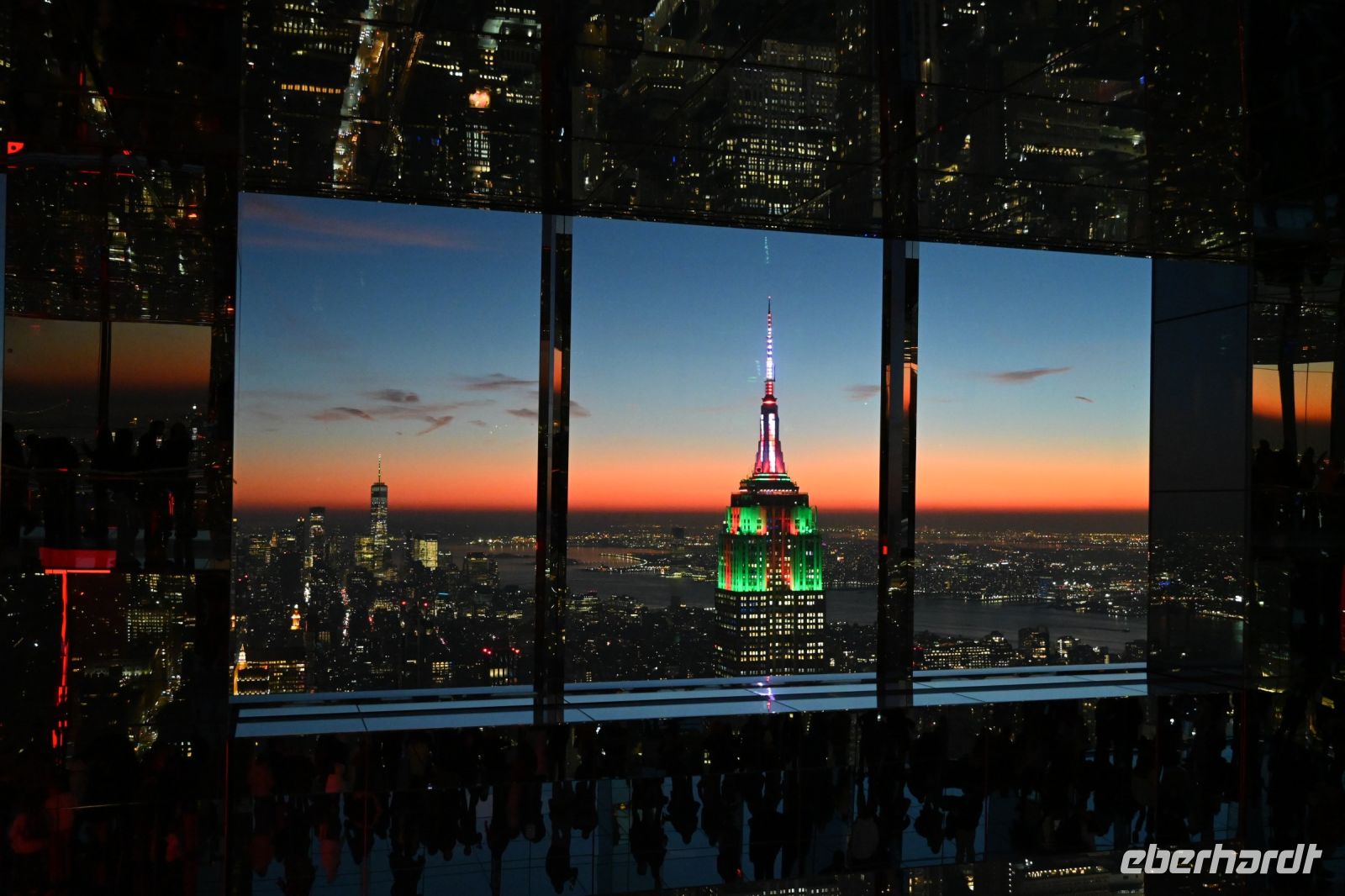 Mit dem Rest der Gruppe fahre ich wieder Uptown zum Grand Central Terminal. Gleich nebenan hat 2020 die Aussichtsplattform Summit One Vanderbilt eröffnet. Diese ist durch die Gestaltung der Räume etwas ganz besonderes. Als wir oben ankommen, ist gerade die Sonne untergegangen und der Himmel ist in wundervolle Farben getaucht, dazu bildet die beleuchtete Stadt mit den farblich angestrahlten Wolkenkratzern einen tollen Kontrast. Der erst Raum ist ganz aus Spiegeln und bietet mit dem Ausblick einmalige Fotomotive. Außerdem gibt es Räume mit Ballons, einer Himmelswand oder der Möglichkeit sich auf einem Glasboden so zu fotografieren, als würde man über der Stadt schweben.