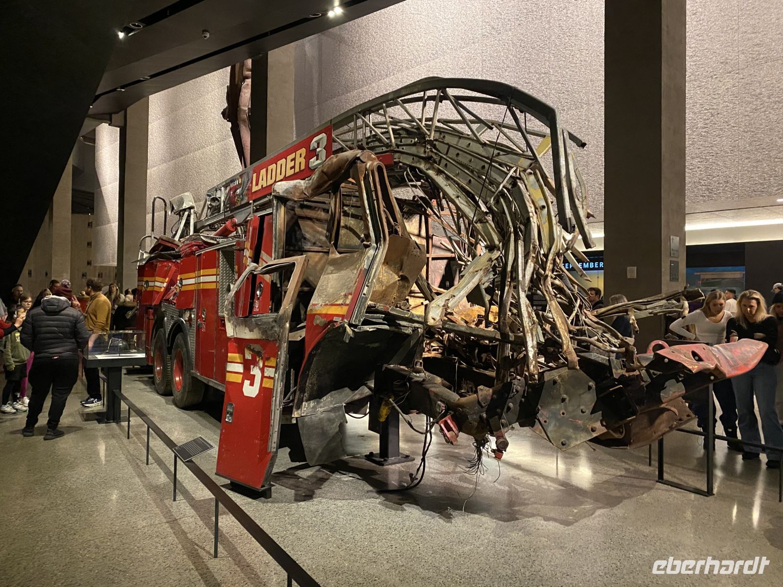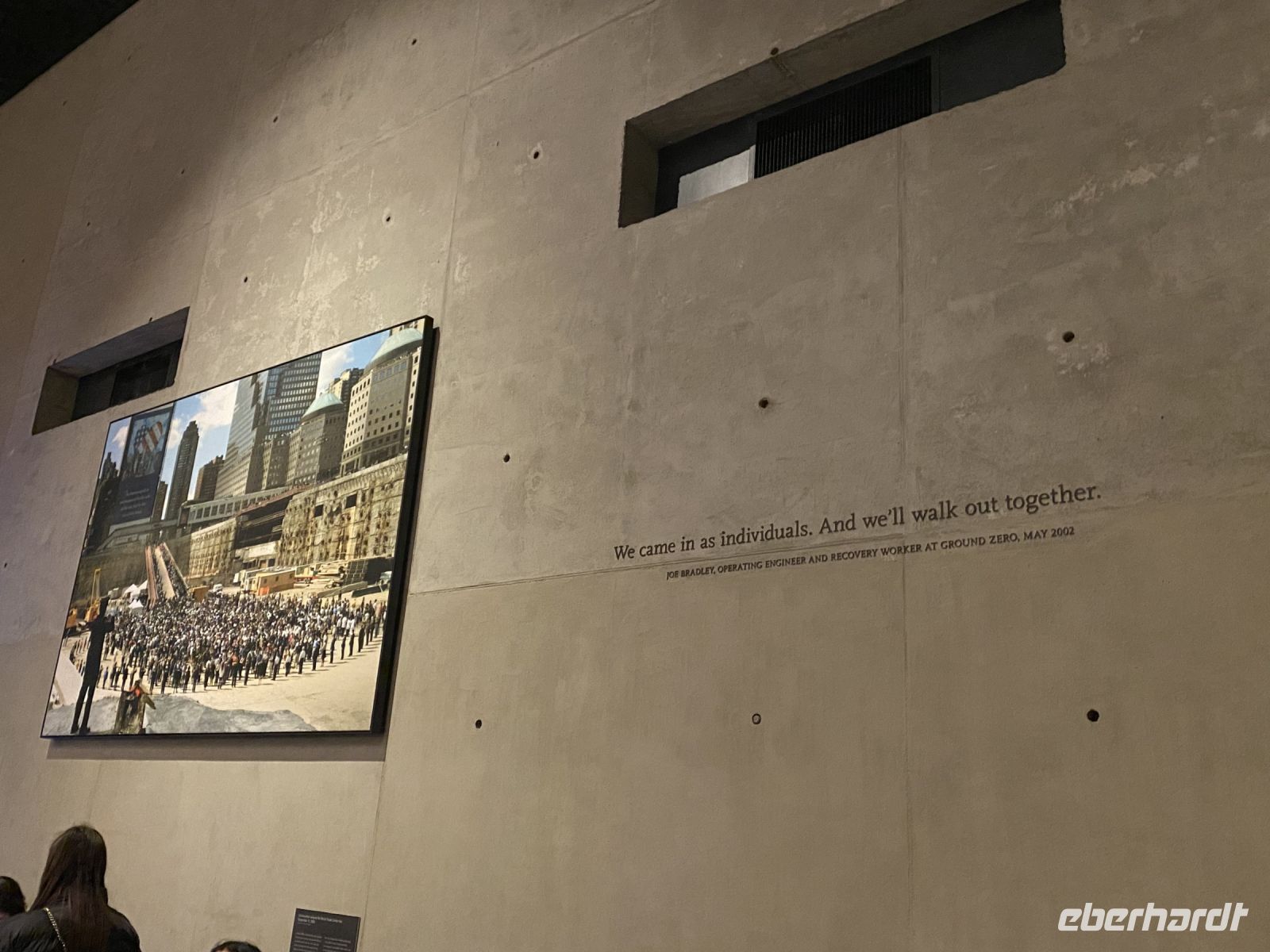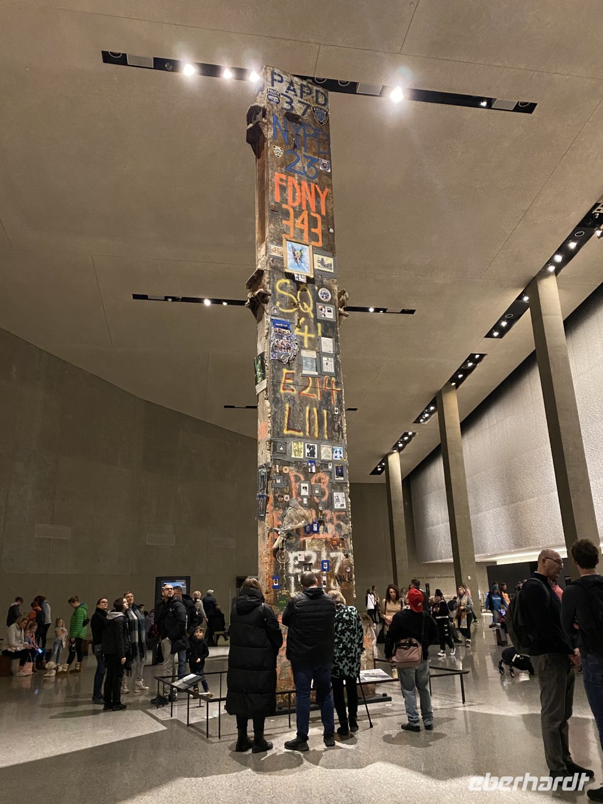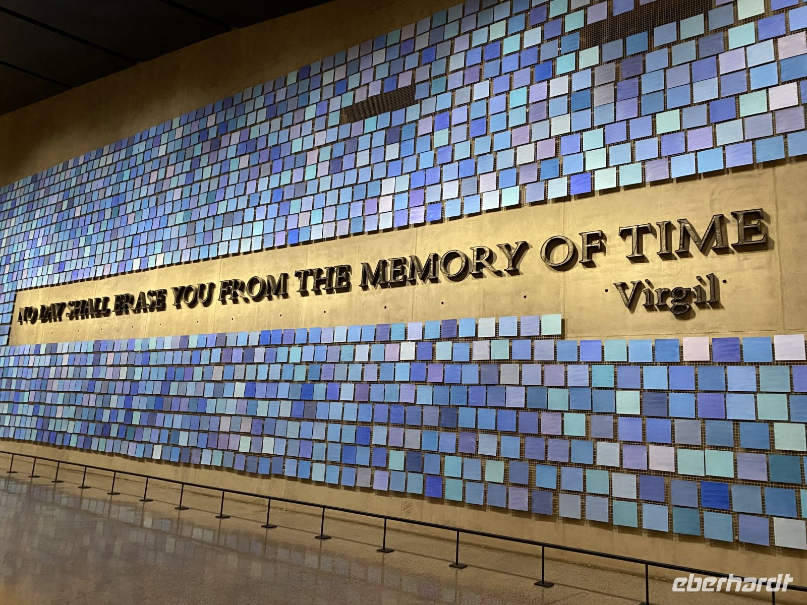 Ein Audioguide führt uns durch diese riesige Anlage. Alle möglichen Überbleibsel dieses grauenvollen Tages sind hier ausgestellt. Anhand von Bild-, Ton- und auch Videomaterial wird im Museum versucht, dem Besucher, einen möglichst genauen Eindruck dieses Tages zu machen. Hier können wir uns so viel Zeit nehmen, wie wir wollen. Die Stimmung ist gedrückt, jeder läuft mit viel Andacht hindurch, an einigen Stellen findet man Boxen mit Taschentüchern. Im Nachhinein braucht man einige Zeit, um die Eindrücke, Geschichten und Bilder zu verarbeiten. Diese Zeit kann man sich wunderbar draußen in der Sonne nehmen. Entlang der Wasserbecken im Außenbereich wurden in Bronzetafel die Namen aller 2.983 Opfern von diesem Tag eingraviert.