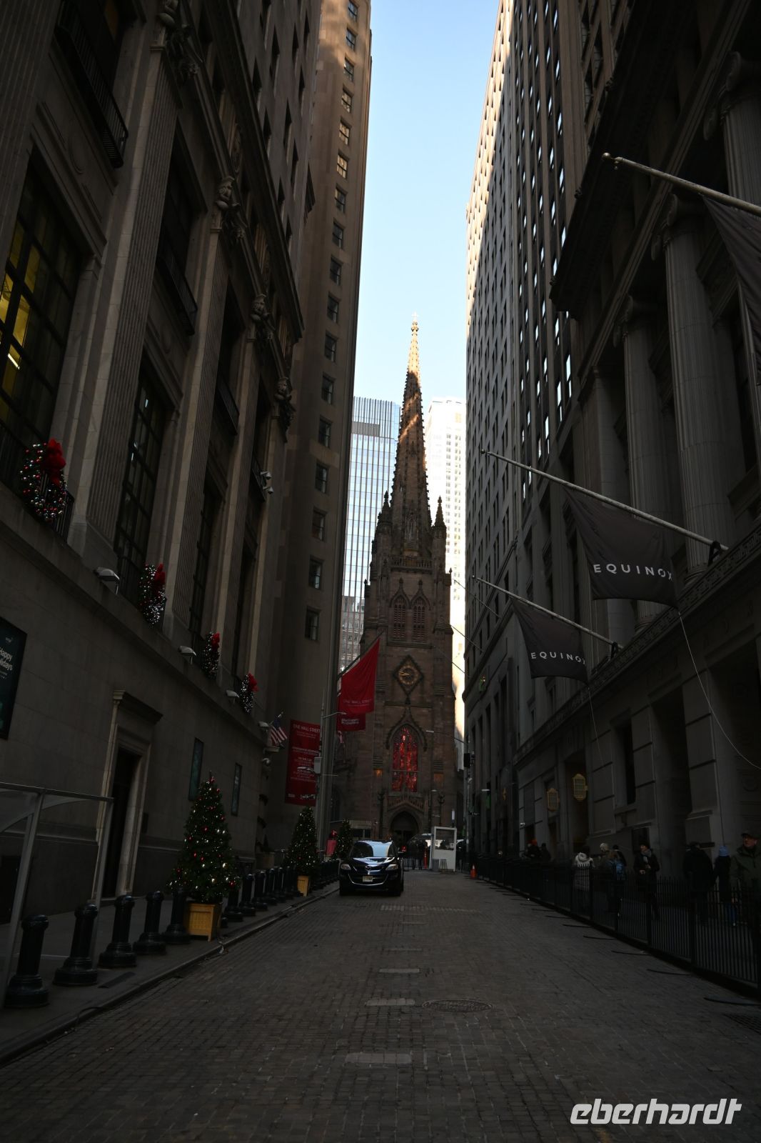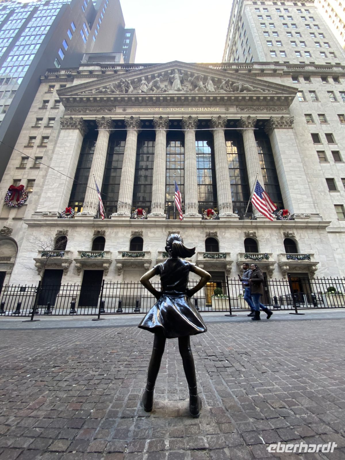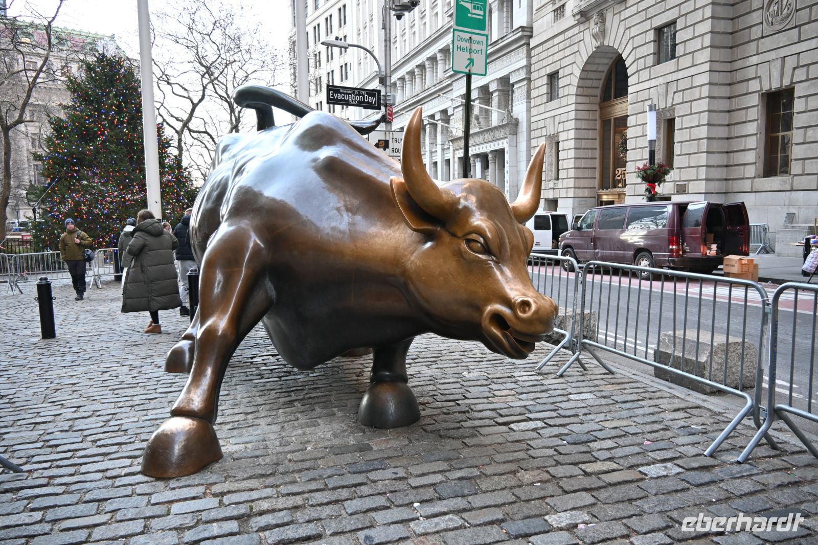 Heute geht es nach dem Frühstück wieder mit der U-Bahn nach Uptown. Der Tag wird sich heute viel um die Anschläge am 11. September 2001 drehen. Unser erster Stopp ist die Trinity Church an der Wall Street, Ecke Broadway. Eine der ältesten Kirchen der Stadt. Das heutige Bauwerk war 1846 das höchste Bauwerk der USA. Am Tag der Anschläge fanden viele Menschen hier Unterschlupf, um sich vor den Staubwolken zu retten. Noch heute wird hier jedes Jahr am 11. September um 8.46 Uhr, der Zeitpunkt, als das erste Flugzeug in den Nordturm flog, ein Gedenkgottesdienst abgehalten. Um die Kirche herum gibt es einen kleinen Friedhof, die Grabsteine hier sind 200 bis 300 Jahre alt. Wenn man aus der Kirche hinaustritt und die Straße überquert steht man im Herzen der internationalen Finanzwelt, der Wall Street. Die größte und wichtigste Börse der Welt, die New York Stock Exchange, hat hier ihren Sitz und etwas abseits der Straße, erreichen wir dann auch das bekannteste Wahrzeichen der Wall Street, den Charging Bull. der stürmende Bulle symbolisiert den aggressiven Willen der Börsenhändler nach Erfolg und Macht. Die Bronzefigur wurde von einem italienischen Künstler entworfen und dem Bullen bei den Eiern zu fassen, soll Glück bringen. Wir haben schon Glück, dass am frühen Morgen noch nicht so viele Besucher hier sind und wir fast ungestört Bilder machen können.