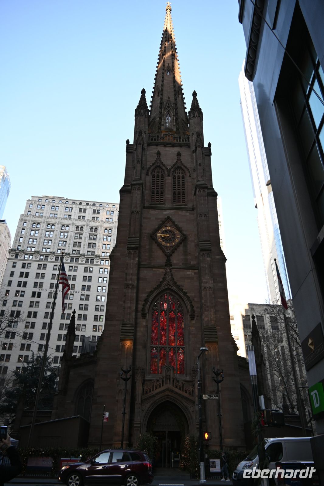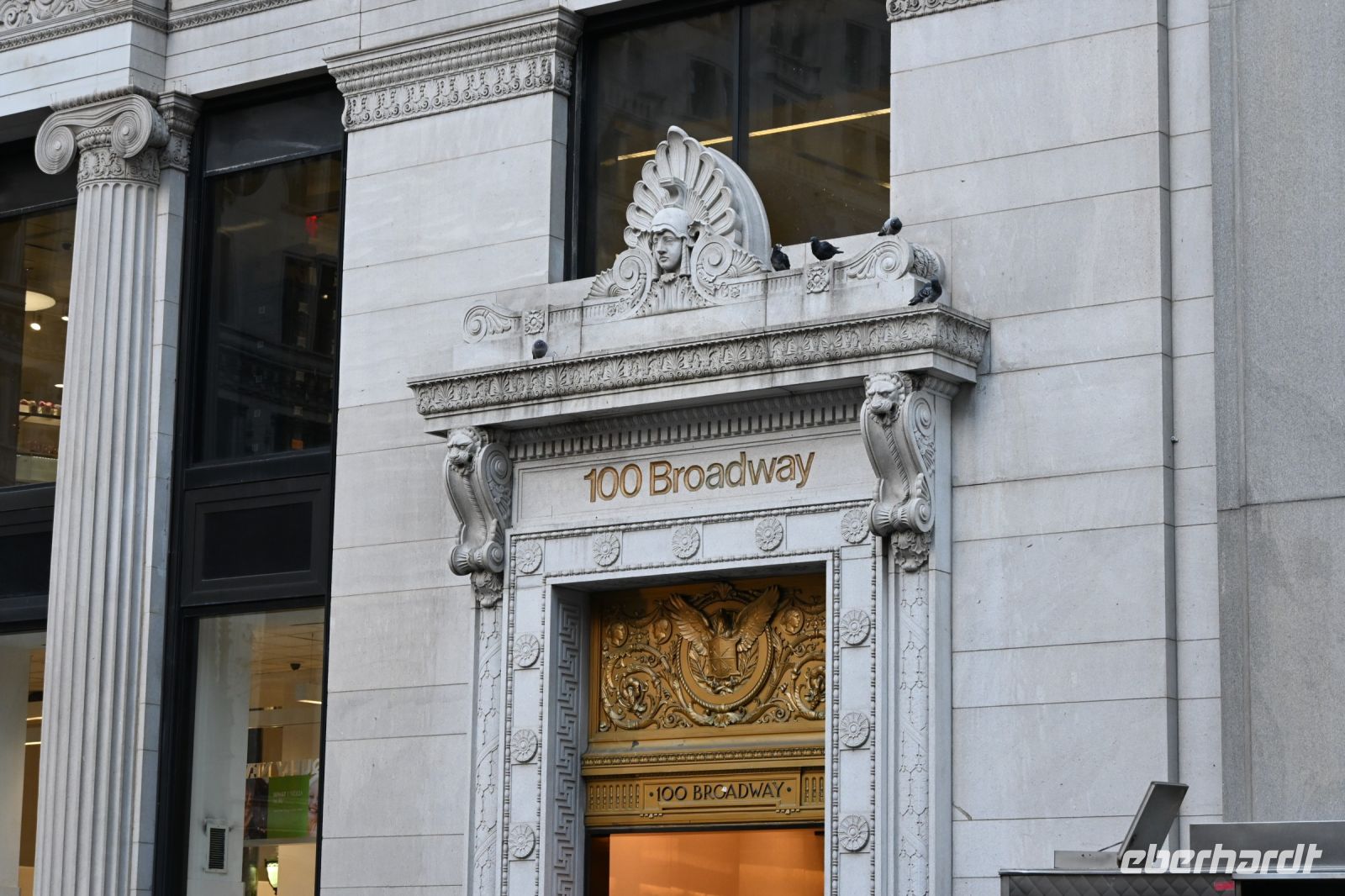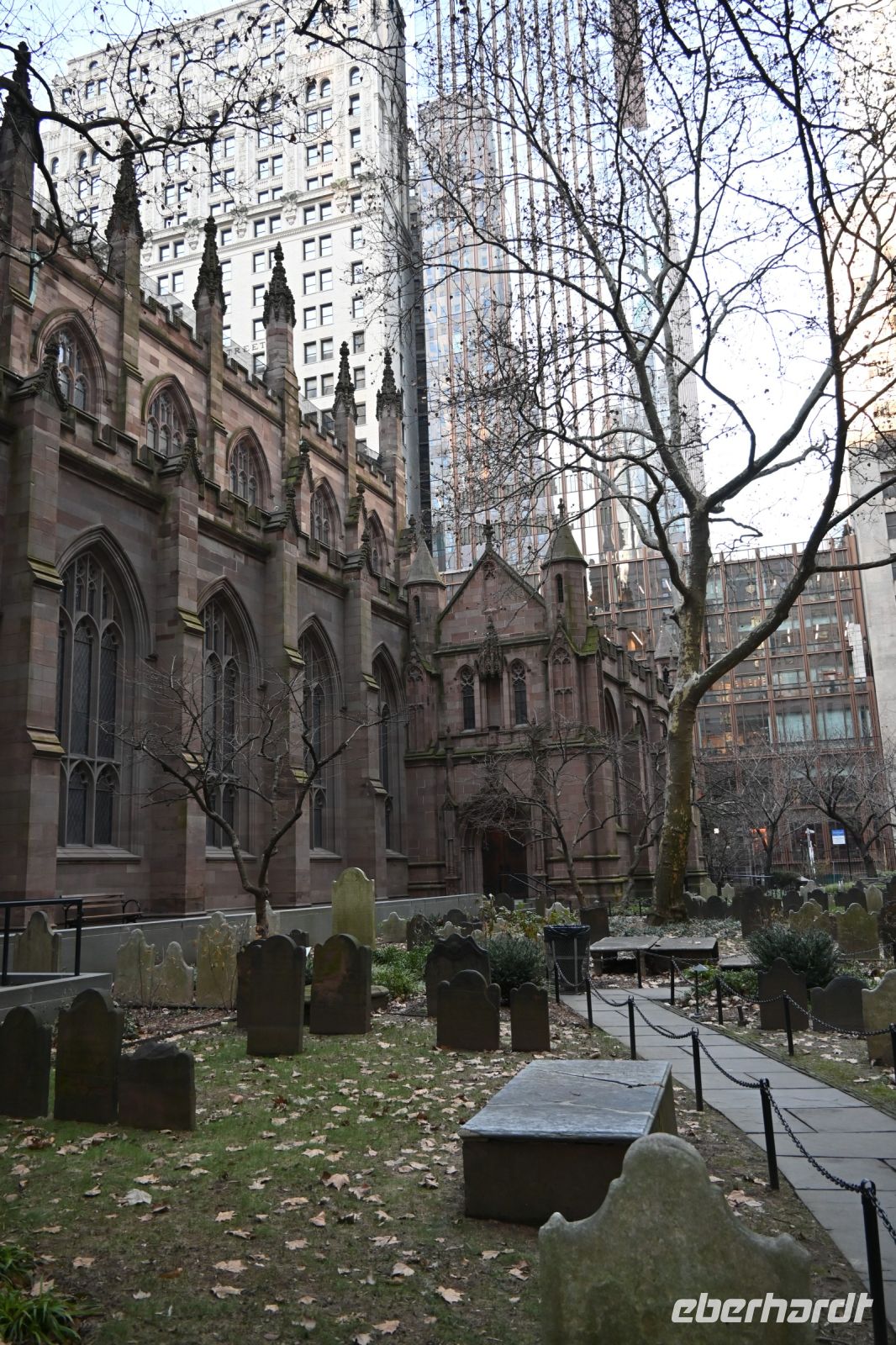 Heute geht es nach dem Frühstück wieder mit der U-Bahn nach Uptown. Der Tag wird sich heute viel um die Anschläge am 11. September 2001 drehen. Unser erster Stopp ist die Trinity Church an der Wall Street, Ecke Broadway. Eine der ältesten Kirchen der Stadt. Das heutige Bauwerk war 1846 das höchste Bauwerk der USA. Am Tag der Anschläge fanden viele Menschen hier Unterschlupf, um sich vor den Staubwolken zu retten. Noch heute wird hier jedes Jahr am 11. September um 8.46 Uhr, der Zeitpunkt, als das erste Flugzeug in den Nordturm flog, ein Gedenkgottesdienst abgehalten. Um die Kirche herum gibt es einen kleinen Friedhof, die Grabsteine hier sind 200 bis 300 Jahre alt. Wenn man aus der Kirche hinaustritt und die Straße überquert steht man im Herzen der internationalen Finanzwelt, der Wall Street. Die größte und wichtigste Börse der Welt, die New York Stock Exchange, hat hier ihren Sitz und etwas abseits der Straße, erreichen wir dann auch das bekannteste Wahrzeichen der Wall Street, den Charging Bull. der stürmende Bulle symbolisiert den aggressiven Willen der Börsenhändler nach Erfolg und Macht. Die Bronzefigur wurde von einem italienischen Künstler entworfen und dem Bullen bei den Eiern zu fassen, soll Glück bringen. Wir haben schon Glück, dass am frühen Morgen noch nicht so viele Besucher hier sind und wir fast ungestört Bilder machen können.
