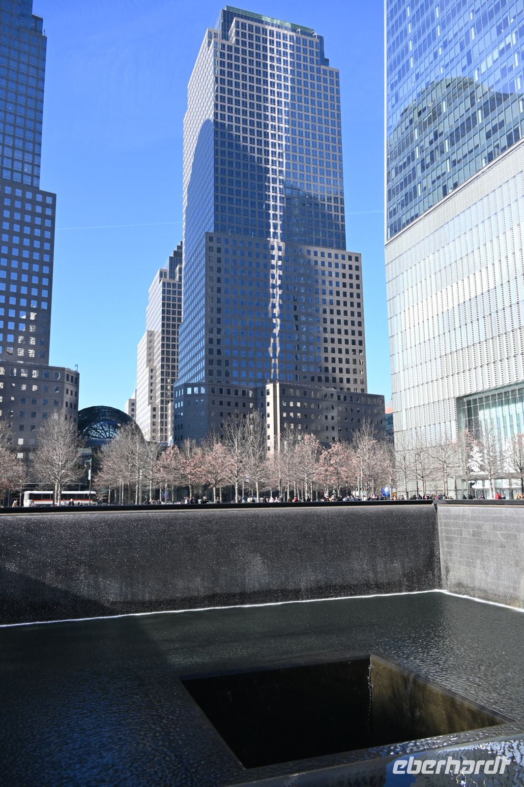 Nach einem kleinen Spaziergang erreichen wir unser eigentliches Ziel des heutigen Tages, das Mahnmal 9/11. Bis zum 11. September 2001 standen hier die Zwillingstürme, die höchsten Gebäude von New York, auf dem Gelände des World Trade Centers. Dort wo die Türme einst standen, sind nun zwei riesige Wasserbecken entstanden, ebenso wurde ein Museum eröffnet, welches sich genau unter diesem Platz befindet.