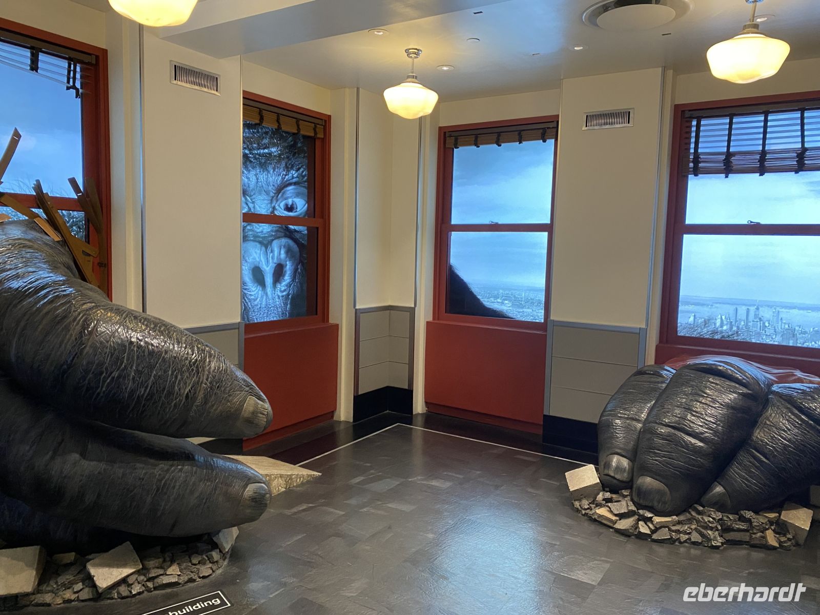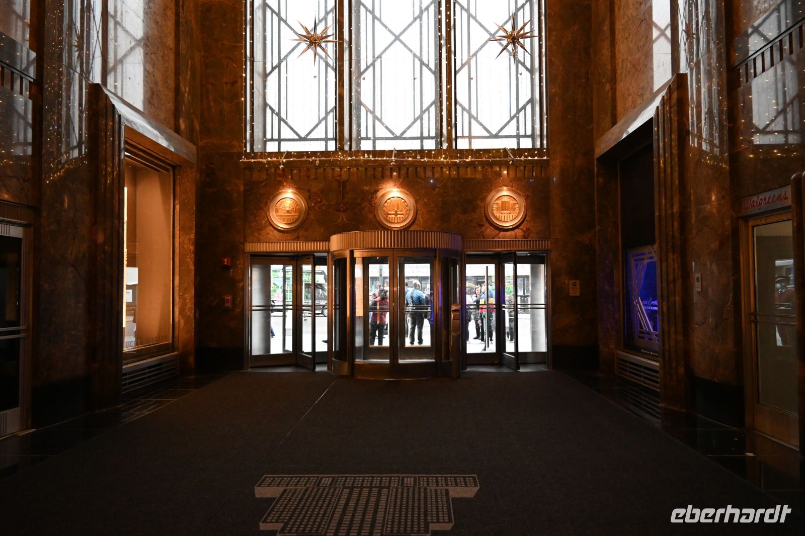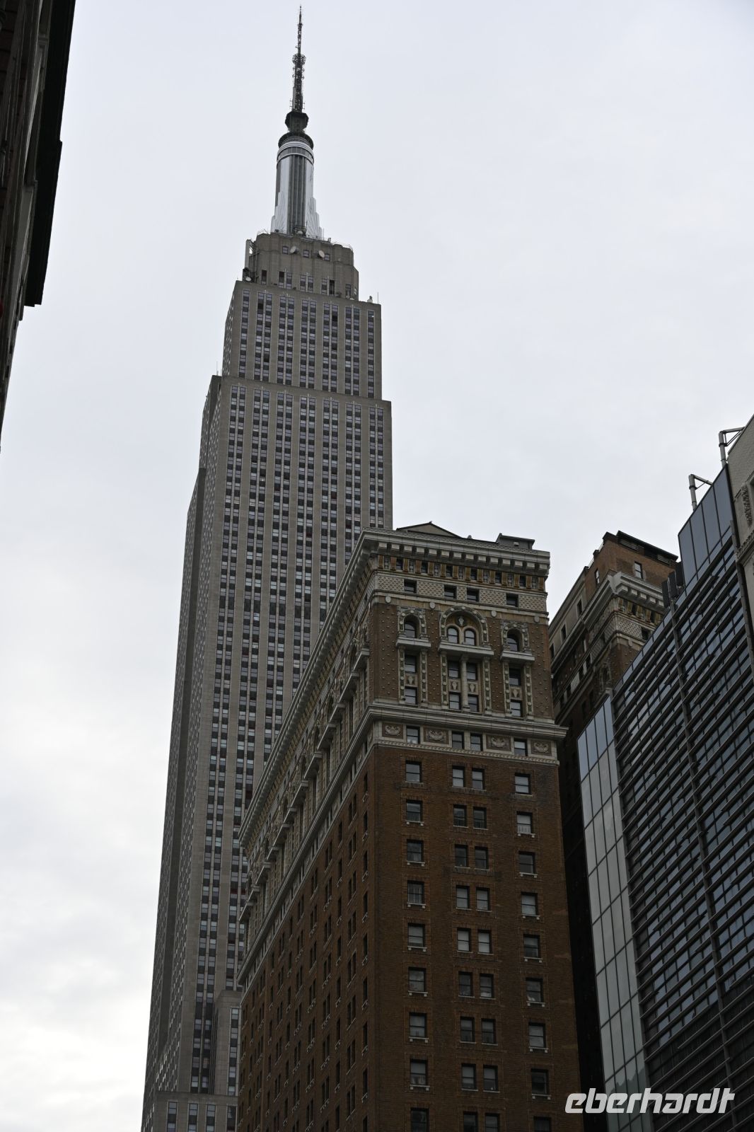 Unsere heutige Sehenswürdigkeit ist nur drei Straßen entfernt und unter guten Bedingungen für viele auch vom Zimmer aus zu sehen. Doch auch das Empire State Building ist heute hinter den Wolken nicht mal zu erahnen. Doch mehrfaches Nachfragen beim Ticketservice nützt nix unsere Tickets werden nicht auf einen anderen Tag umgebucht, wahrscheinlich sind diese für die nächsten Tage schon ausgebucht. Wir fahren also nach oben. Es gibt auch ein kleines Museum, das die Entstehung 443 Meter hohen Gebäudes zeigt. So erfahren wir, dass es nach 18 Monaten Bauzeit am 01. Mai 1931 eröffnet wurde. Als erstes fahren wir in die 80. Etage und dort denkt man in den Fenstern wurde Milchglas angebracht, aber wir befinden uns mitten in den Wolken. Es geht noch weitere sechs Etagen mit dem Fahrstuhl nach oben, der Blick hier, leider auch nicht besser. Im Unterschied zu den anderen beiden Aussichtsplattformen steht man hier aber an der frischen Luft und der Ausblick ist lediglich von einem Gitter begrenzt, nicht von Glas. Wenn man Glück hat, steht man genau im richtigen Moment an der Stelle, wo der Wind die Wolke wegschiebt und man hat etwas Blick auf die Häuser in der näheren Umgebung.