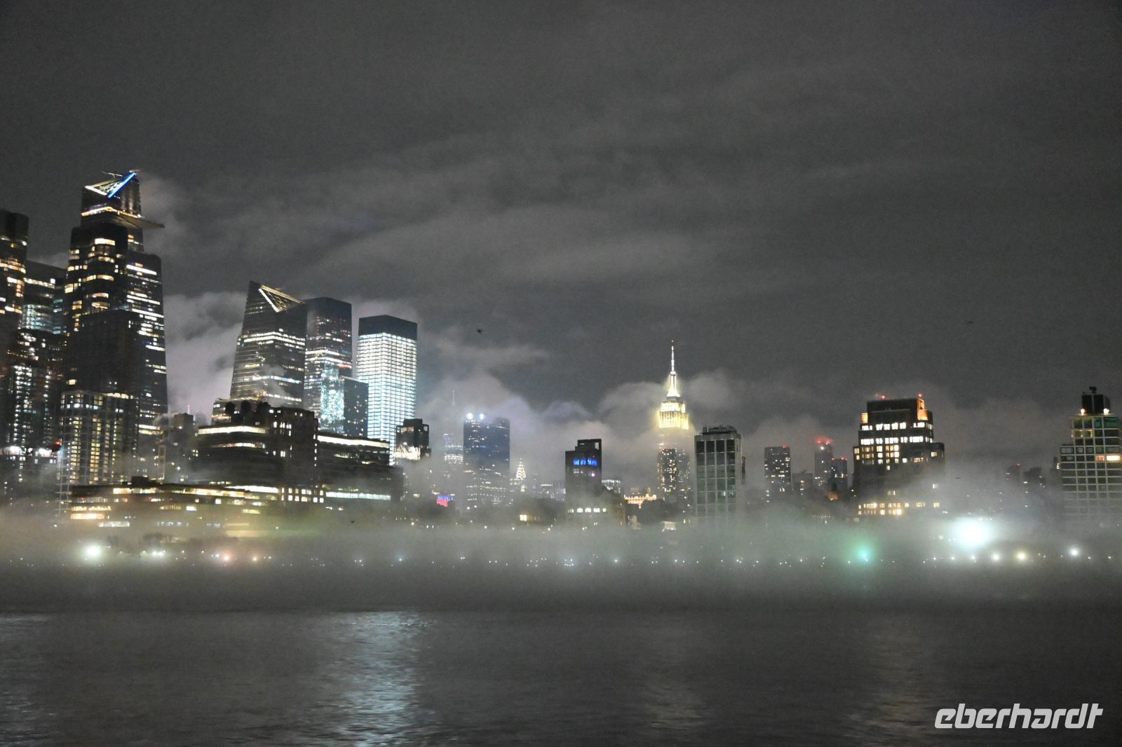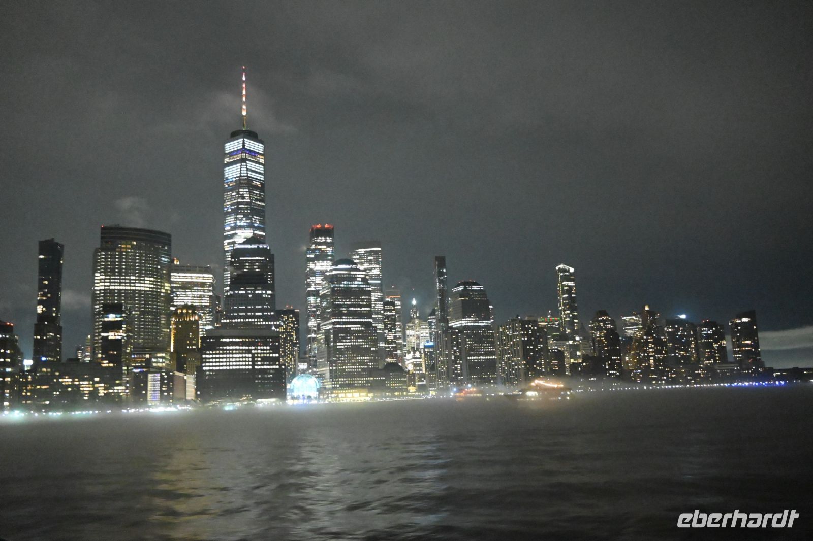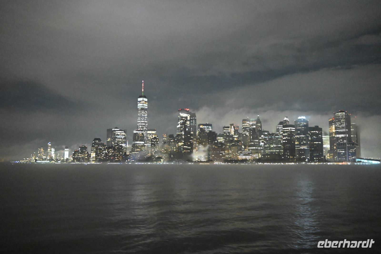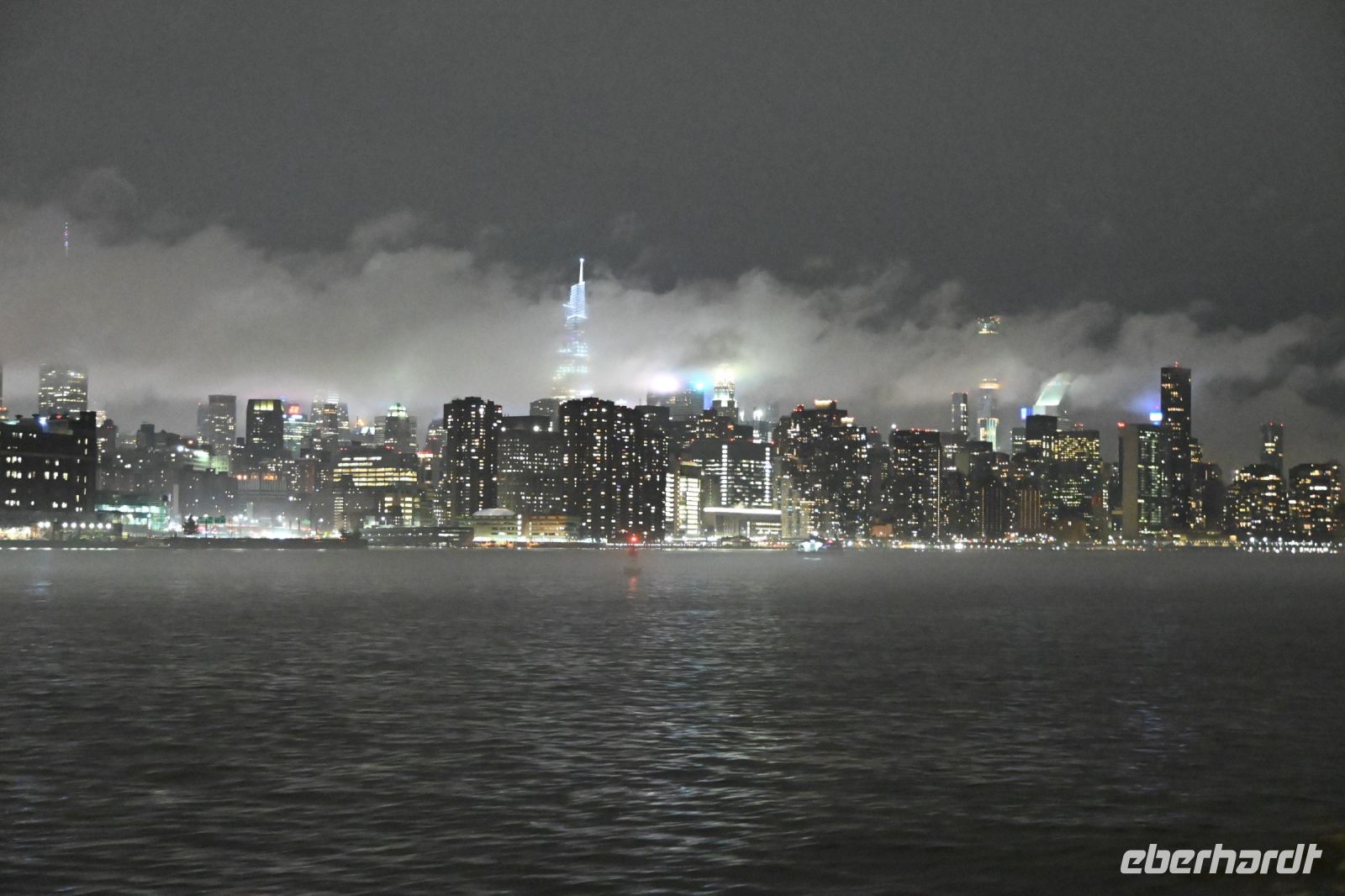 Um 17.30 Uhr laufen wir vom Hotel zum Abendessen. Heute wurde für uns bei einem Italiener reserviert und wir bekommen ein 3-Gänge-Menü. Da es auch nicht mehr weit zum Schiffsanleger ist, wollen wir auch dorthin laufen. Leider regnet es etwas stärker, aber davon lassen wir uns auch nicht die Stimmung vermiesen. Kurz im Supermarkt angehalten und noch einen Schirm besorgt, weiter geht's. Nach etwas Anstehen kommen wir auf das Schiff. Im Informationsabend vor der Reise wurde uns schon mitgeteilt, dass die Feier sehr einfach gestaltet wird. Die Musik ist sehr laut aufgedreht und man sitzt lediglich auf Klappstühlen. Da es draußen immer noch regnet, kann man auch nicht dorthin "fliehen". Zum späteren Abend wird es besser und den Countdown können wir auf dem Dach genießen. Die Skyline ist immer noch bedeckt, mit den Lichtern sieht dies jedoch etwas mystisch aus und das Feuerwerk vor der Freiheitsstatue ist auch zu erkennen.