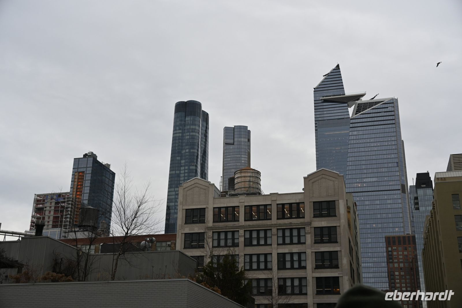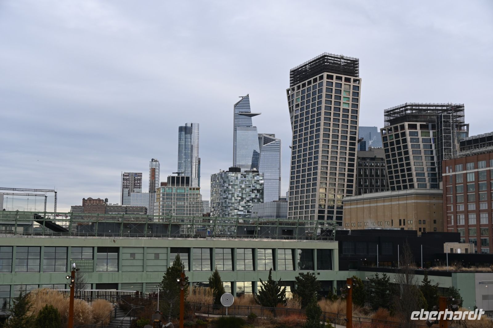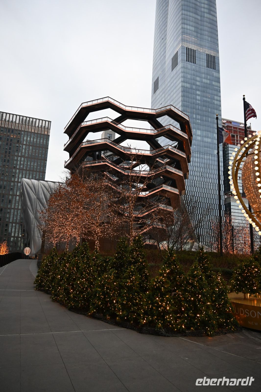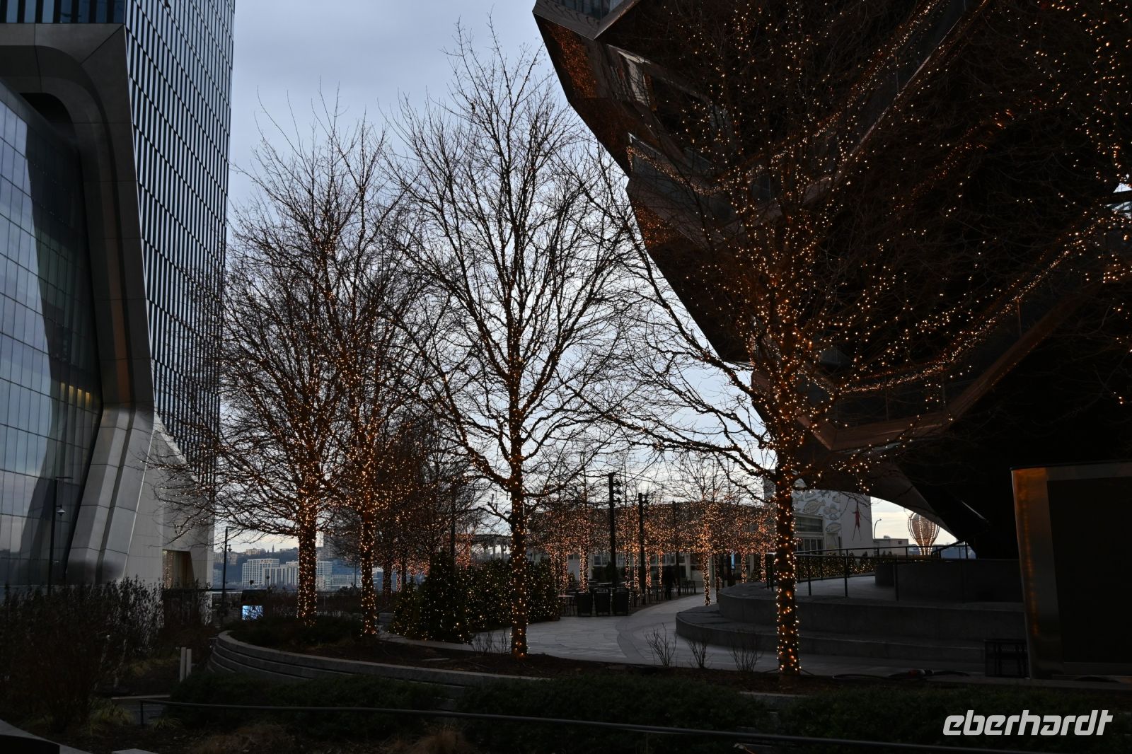 Am letzten Tag macht uns das Wetter wieder schwer uns auf den Abschied vorzubereiten. Da wir bereits 11.30 Uhr vom Flughafentransfer abgeholt werden, müssen wir unseren letzten Ausflug um 8 Uhr starten. Daher haben wir aber wieder fast leere U-Bahnen und auch vor Ort ist nicht viel los. Wir fahren bis in den Stadtteil Hudson Yards und steigen direkt an der Aussichtsplattform "Vessel" aus. Hier ist alles noch schön mit Lichterketten geschmückt. Hier gibt es direkt einen Aufstieg zur High Line. Die stillgelegte Bahntrasse wurde als Fußgängerweg ausgebaut und man kann auf dem 2,5 Kilometer langen Weg spazieren gehen. Wir bewegen uns einige Meter über der Straße und bekommen einen neuen Blick auf die Stadt. Leider ist hier nun auch Winter und wir können uns nur vorstellen, wie schön die Büsche und Blumen im Frühjahr hier aussehen werden.