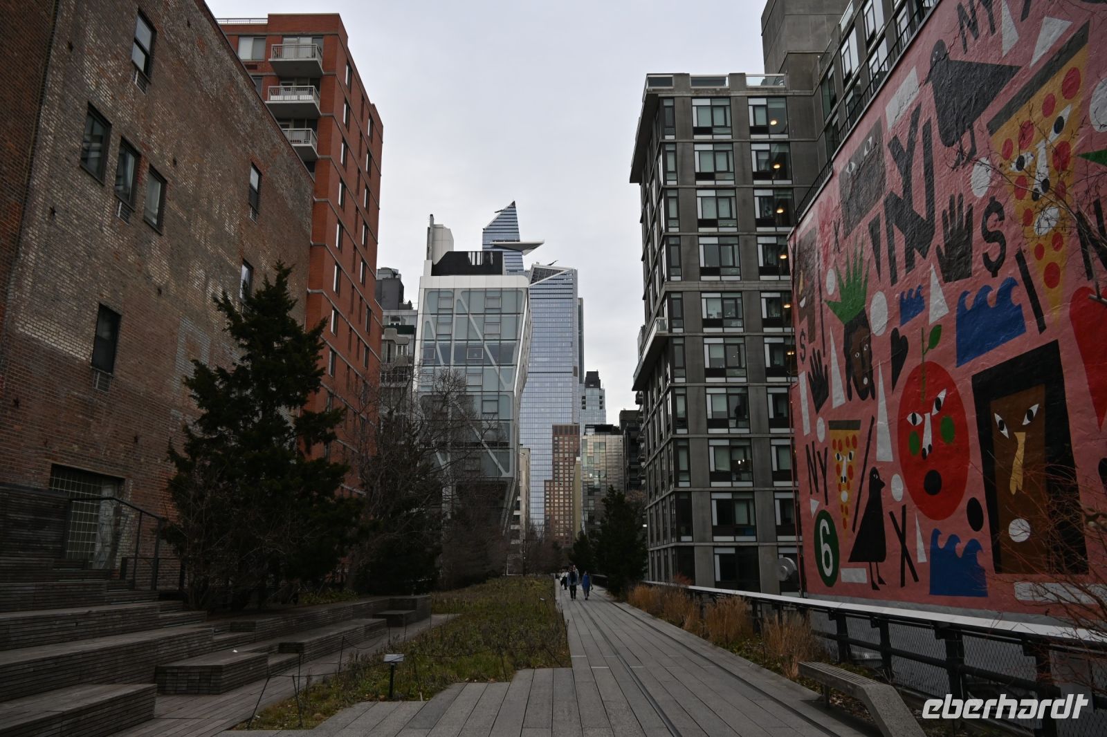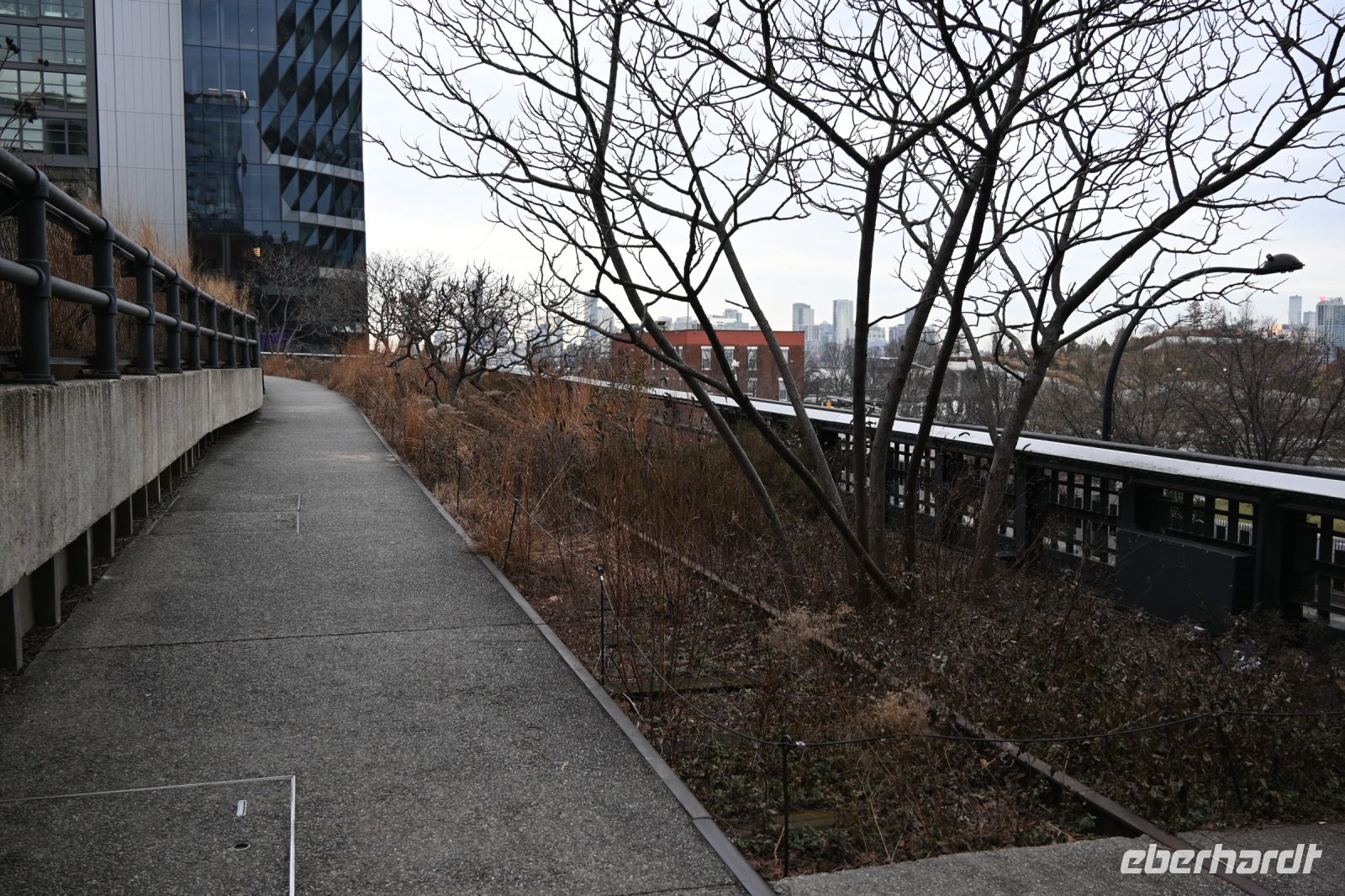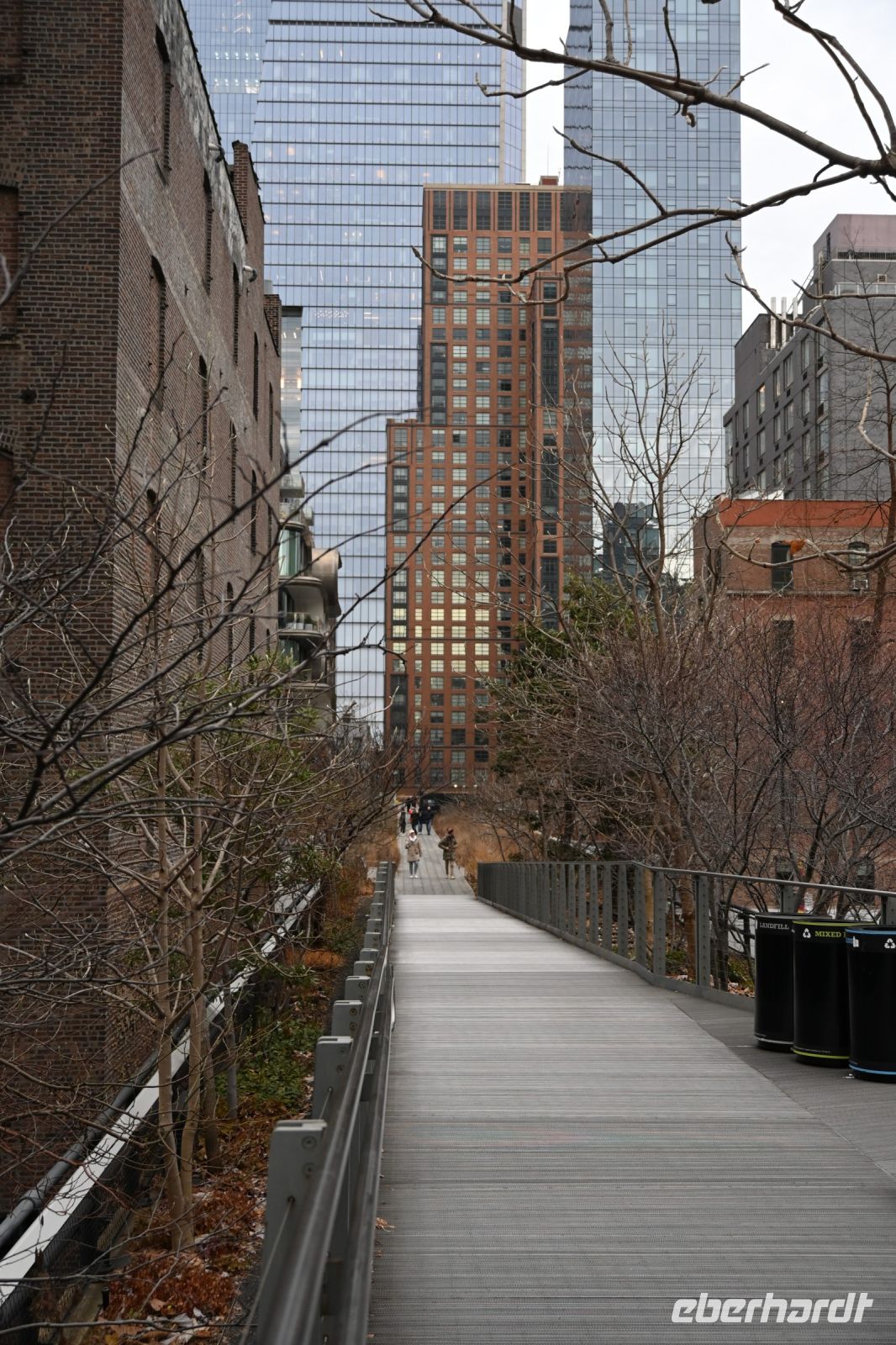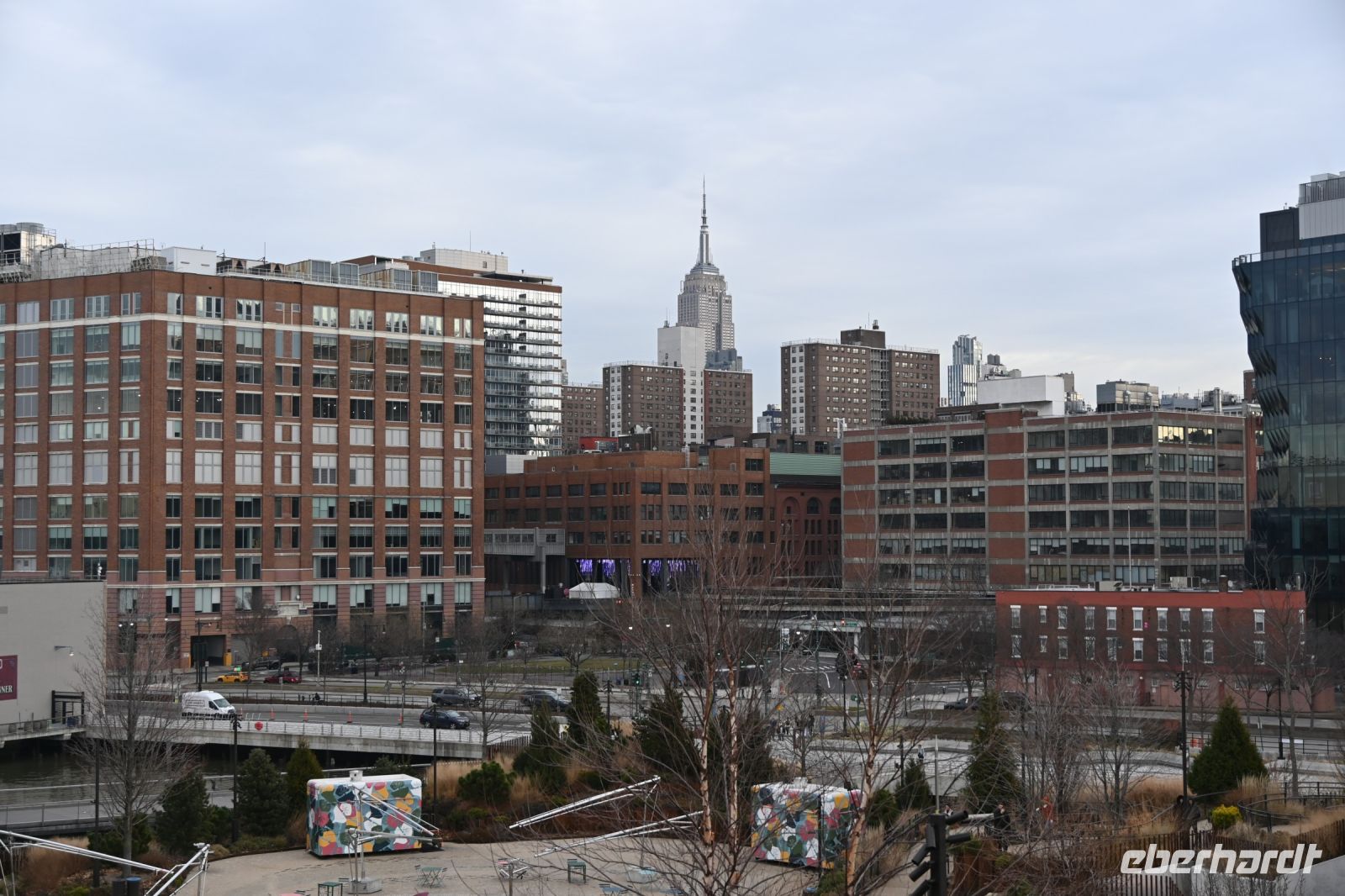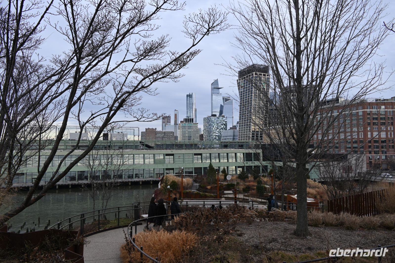Am letzten Tag macht uns das Wetter wieder schwer uns auf den Abschied vorzubereiten. Da wir bereits 11.30 Uhr vom Flughafentransfer abgeholt werden, müssen wir unseren letzten Ausflug um 8 Uhr starten. Daher haben wir aber wieder fast leere U-Bahnen und auch vor Ort ist nicht viel los. Wir fahren bis in den Stadtteil Hudson Yards und steigen direkt an der Aussichtsplattform "Vessel" aus. Hier ist alles noch schön mit Lichterketten geschmückt. Hier gibt es direkt einen Aufstieg zur High Line. Die stillgelegte Bahntrasse wurde als Fußgängerweg ausgebaut und man kann auf dem 2,5 Kilometer langen Weg spazieren gehen. Wir bewegen uns einige Meter über der Straße und bekommen einen neuen Blick auf die Stadt. Leider ist hier nun auch Winter und wir können uns nur vorstellen, wie schön die Büsche und Blumen im Frühjahr hier aussehen werden.