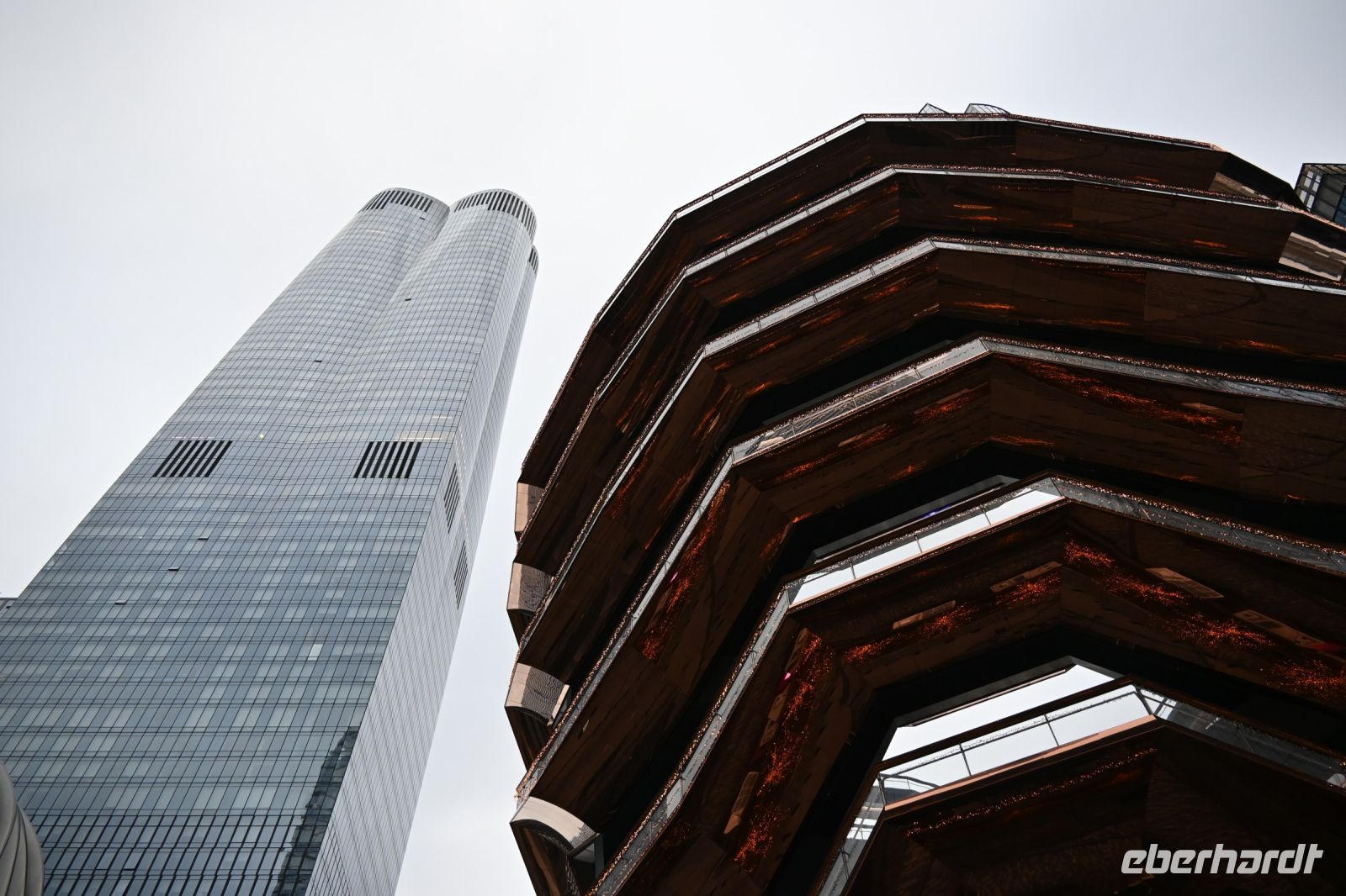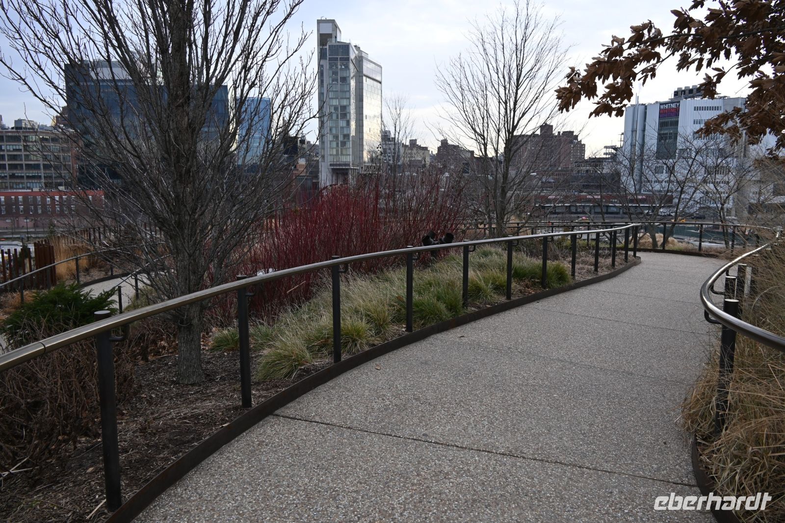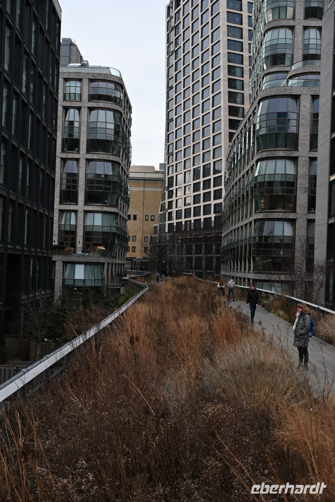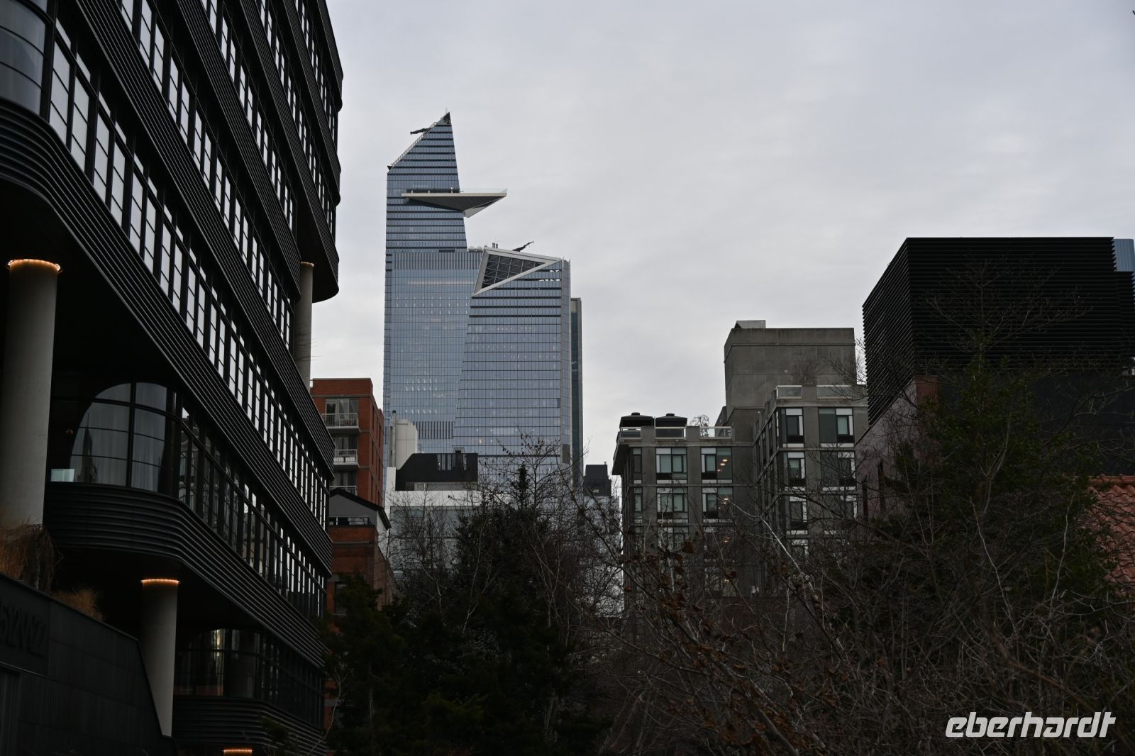 Am letzten Tag macht uns das Wetter wieder schwer uns auf den Abschied vorzubereiten. Da wir bereits 11.30 Uhr vom Flughafentransfer abgeholt werden, müssen wir unseren letzten Ausflug um 8 Uhr starten. Daher haben wir aber wieder fast leere U-Bahnen und auch vor Ort ist nicht viel los. Wir fahren bis in den Stadtteil Hudson Yards und steigen direkt an der Aussichtsplattform "Vessel" aus. Hier ist alles noch schön mit Lichterketten geschmückt. Hier gibt es direkt einen Aufstieg zur High Line. Die stillgelegte Bahntrasse wurde als Fußgängerweg ausgebaut und man kann auf dem 2,5 Kilometer langen Weg spazieren gehen. Wir bewegen uns einige Meter über der Straße und bekommen einen neuen Blick auf die Stadt. Leider ist hier nun auch Winter und wir können uns nur vorstellen, wie schön die Büsche und Blumen im Frühjahr hier aussehen werden.