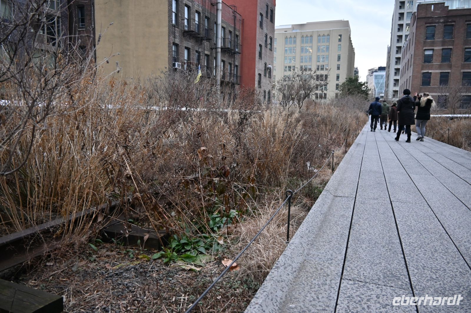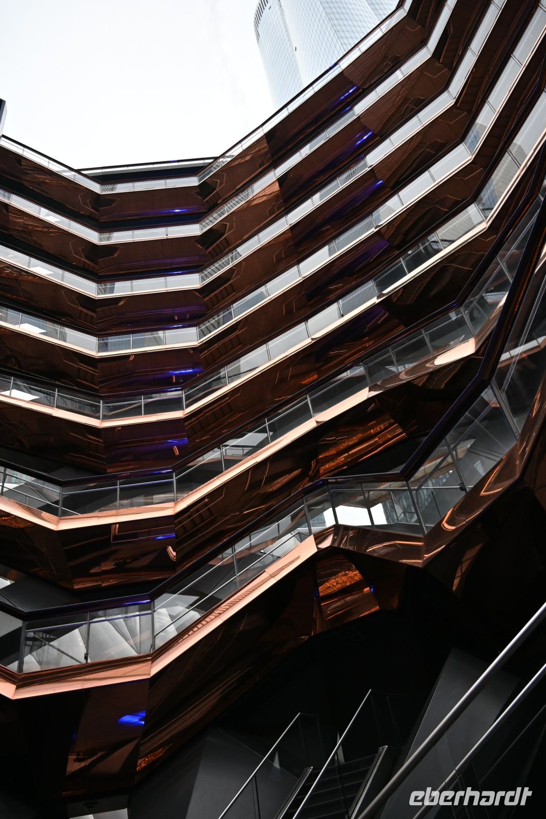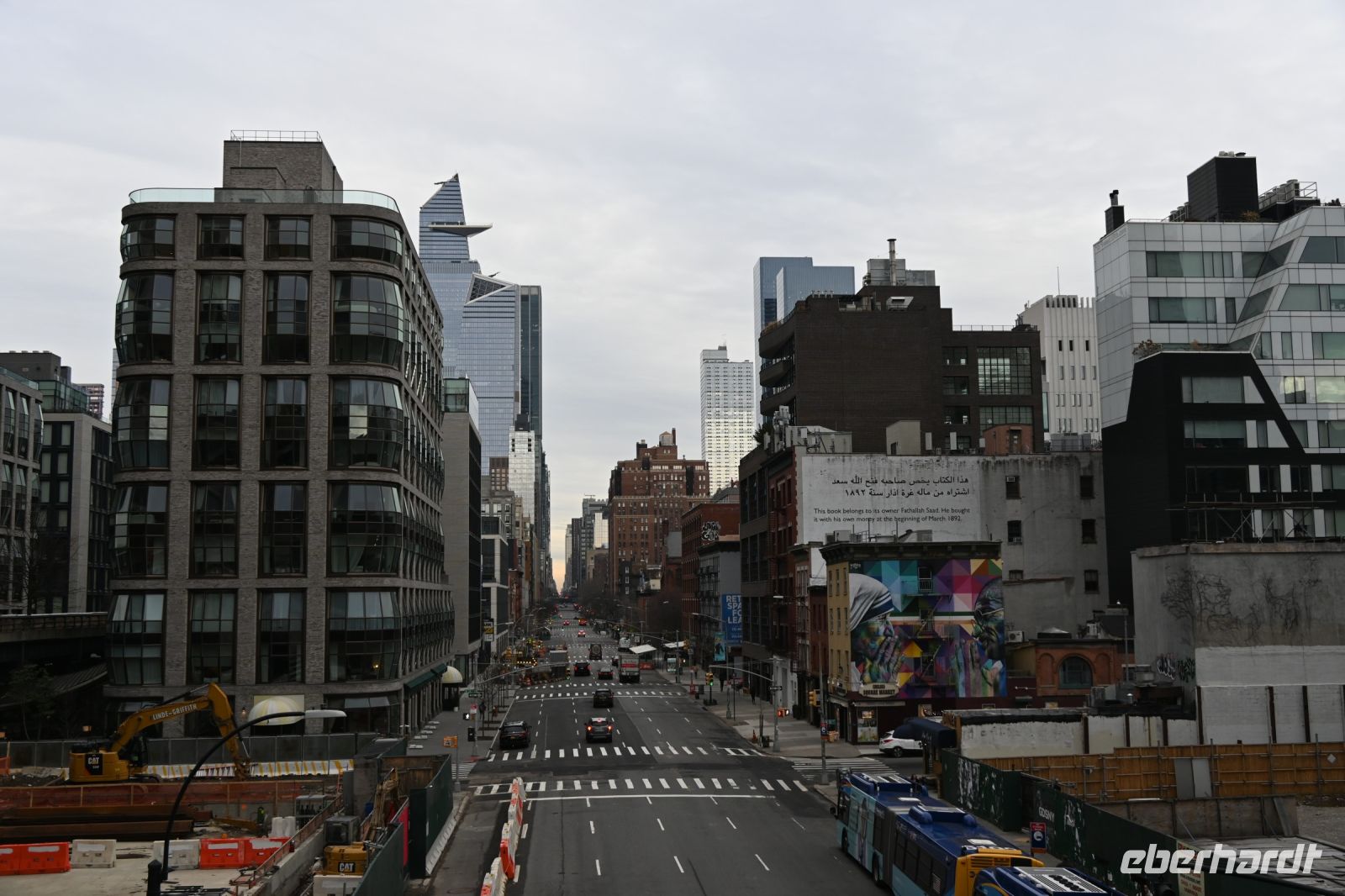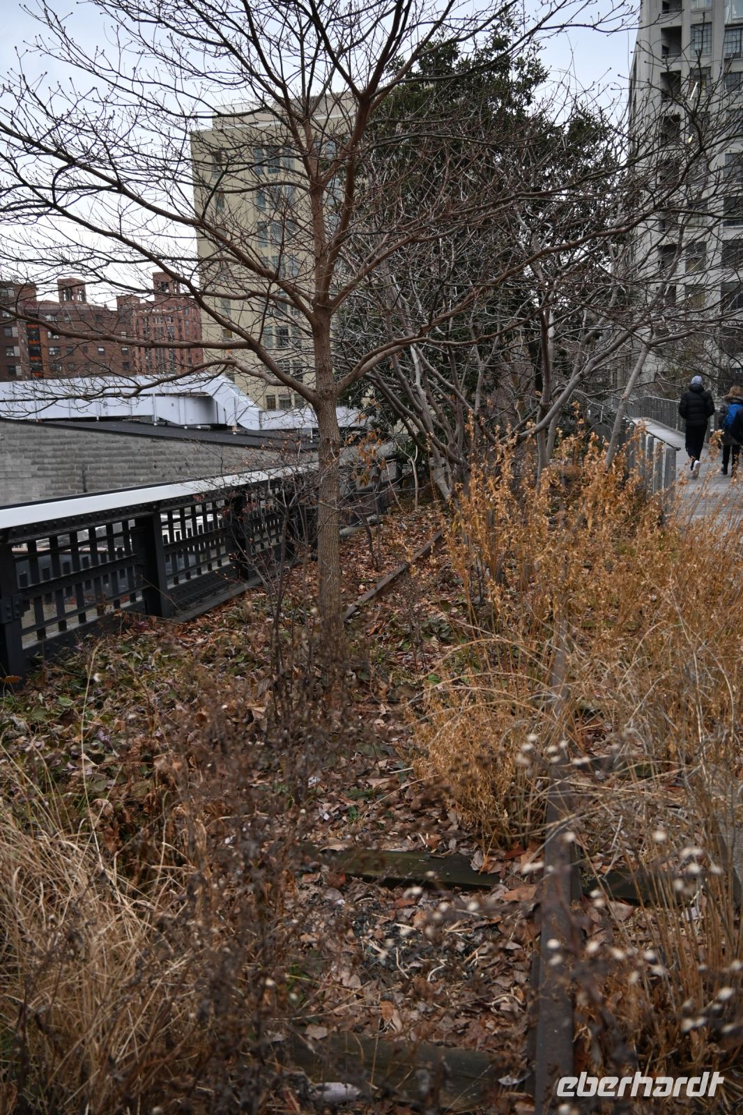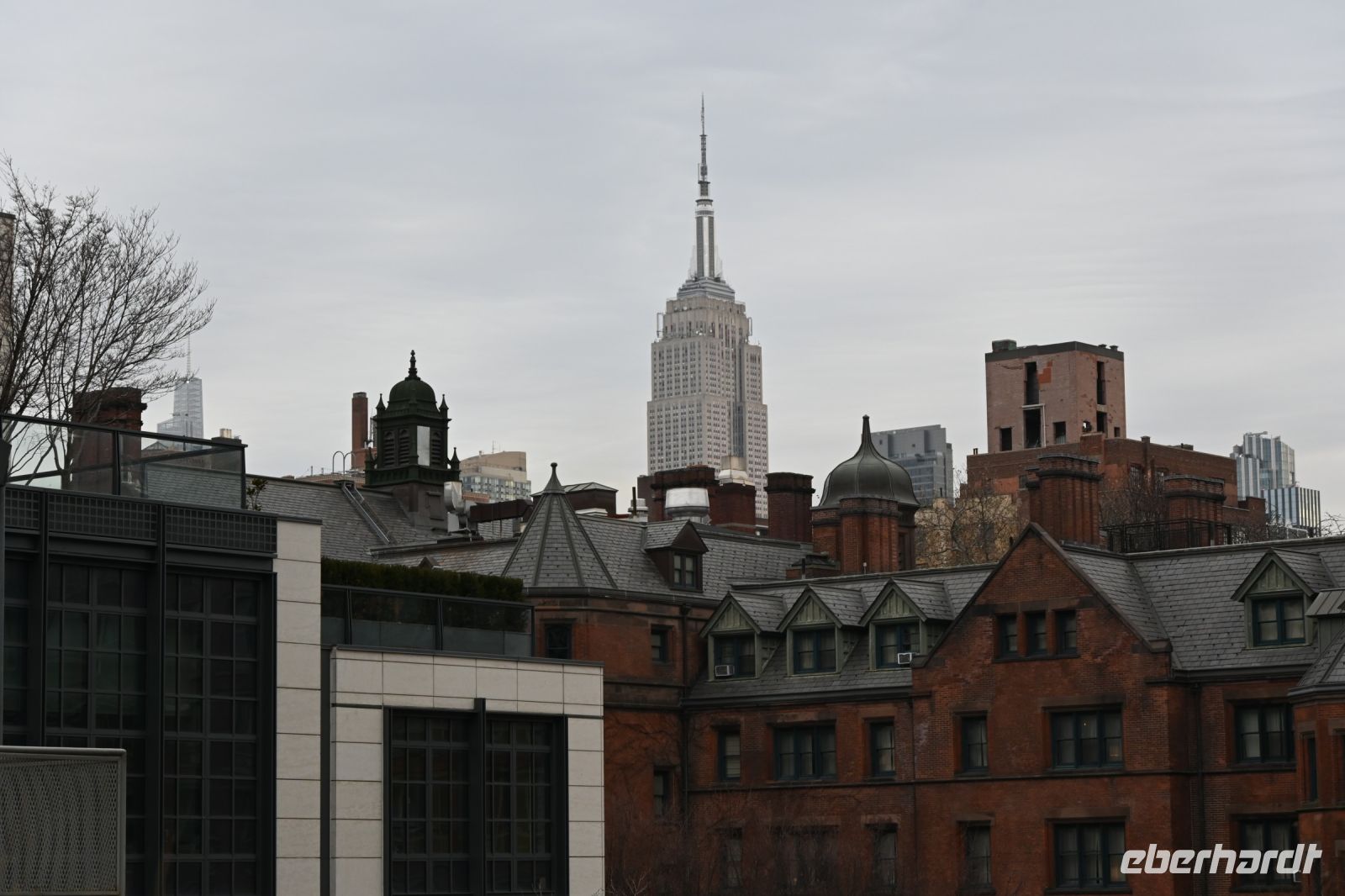 Am letzten Tag macht uns das Wetter wieder schwer uns auf den Abschied vorzubereiten. Da wir bereits 11.30 Uhr vom Flughafentransfer abgeholt werden, müssen wir unseren letzten Ausflug um 8 Uhr starten. Daher haben wir aber wieder fast leere U-Bahnen und auch vor Ort ist nicht viel los. Wir fahren bis in den Stadtteil Hudson Yards und steigen direkt an der Aussichtsplattform "Vessel" aus. Hier ist alles noch schön mit Lichterketten geschmückt. Hier gibt es direkt einen Aufstieg zur High Line. Die stillgelegte Bahntrasse wurde als Fußgängerweg ausgebaut und man kann auf dem 2,5 Kilometer langen Weg spazieren gehen. Wir bewegen uns einige Meter über der Straße und bekommen einen neuen Blick auf die Stadt. Leider ist hier nun auch Winter und wir können uns nur vorstellen, wie schön die Büsche und Blumen im Frühjahr hier aussehen werden.