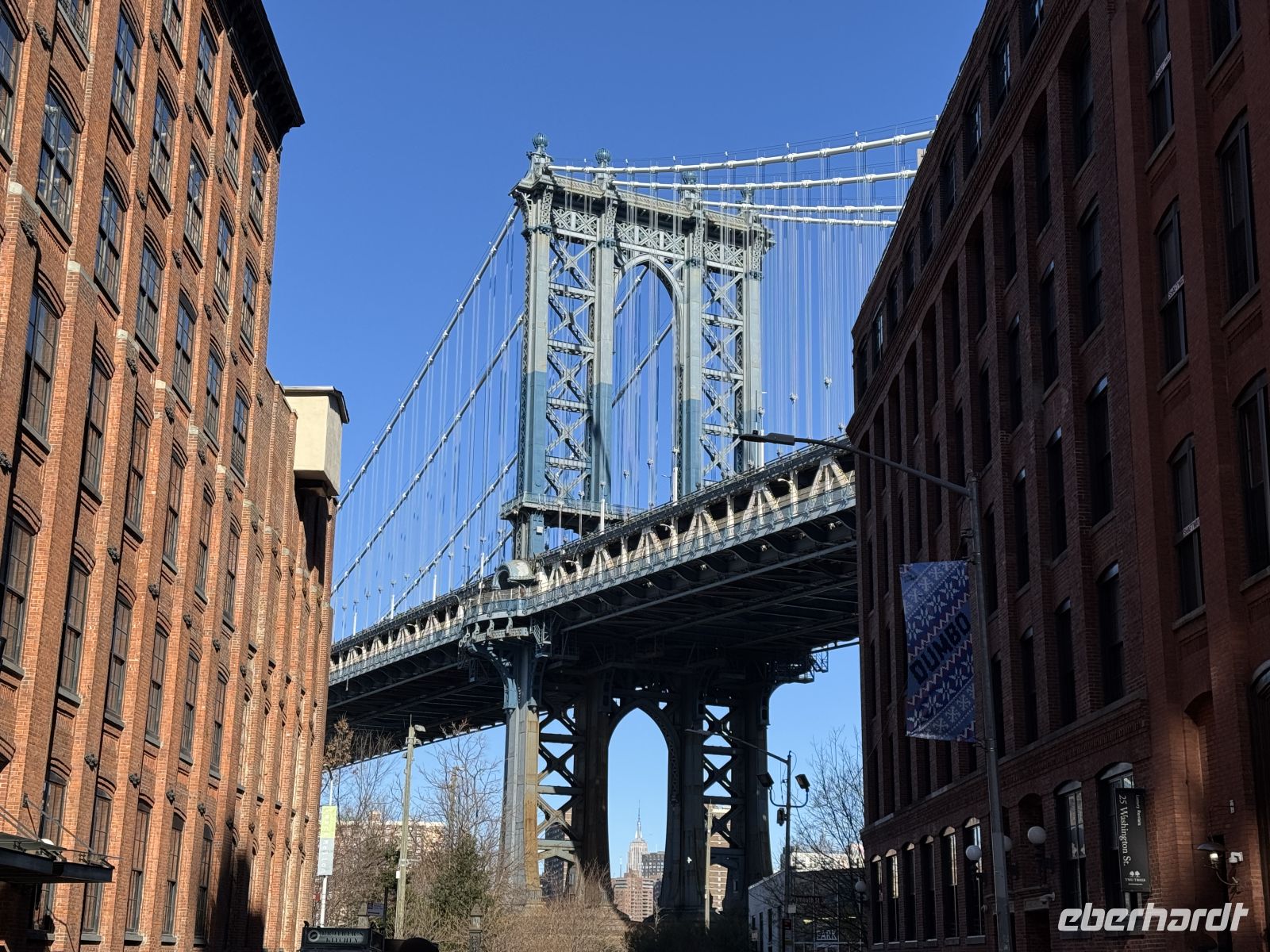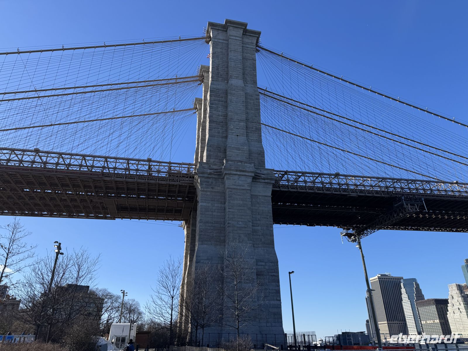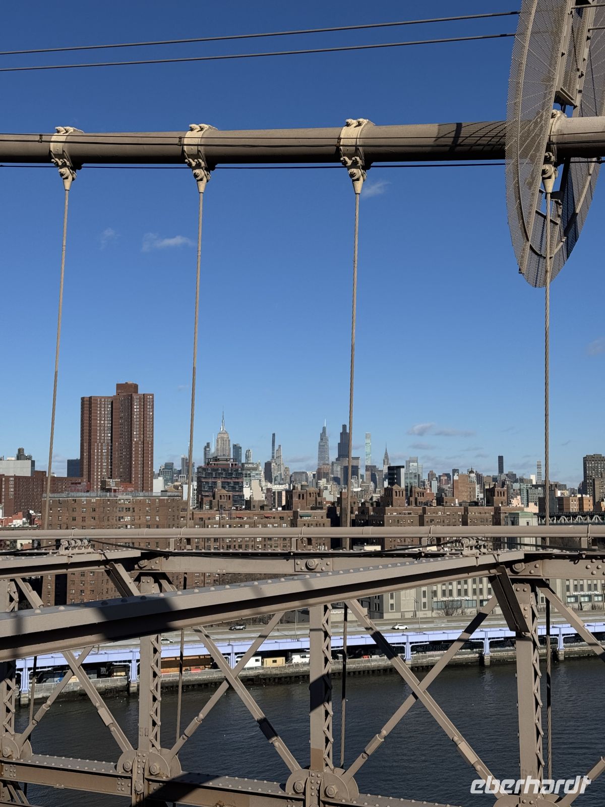 Am Fluss entlang genießen wir einen fantastischen Blick auf die Skyline, die sich bei jedem Schritt ein Stück anders präsentiert. Wir Setzen unseren Weg fort und verlassen Brooklyn über die Brooklyn Bridge. Für Fußgänger wurde ein spezieller Weg geschaffen, der über den Straßen verläuft und uns einen einzigartigen Blick auf die Brücke und die Skyline von Manhattan bietet.