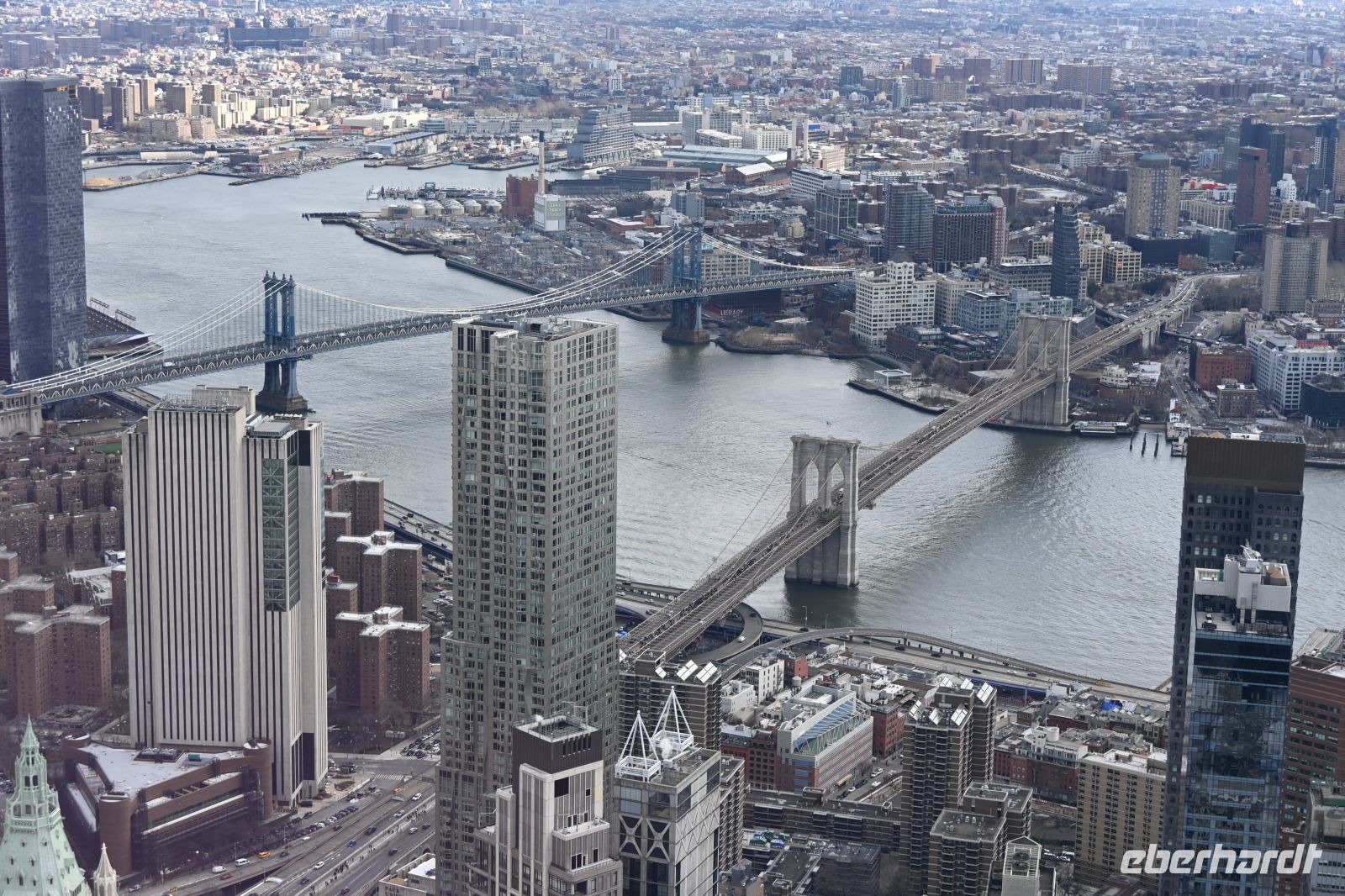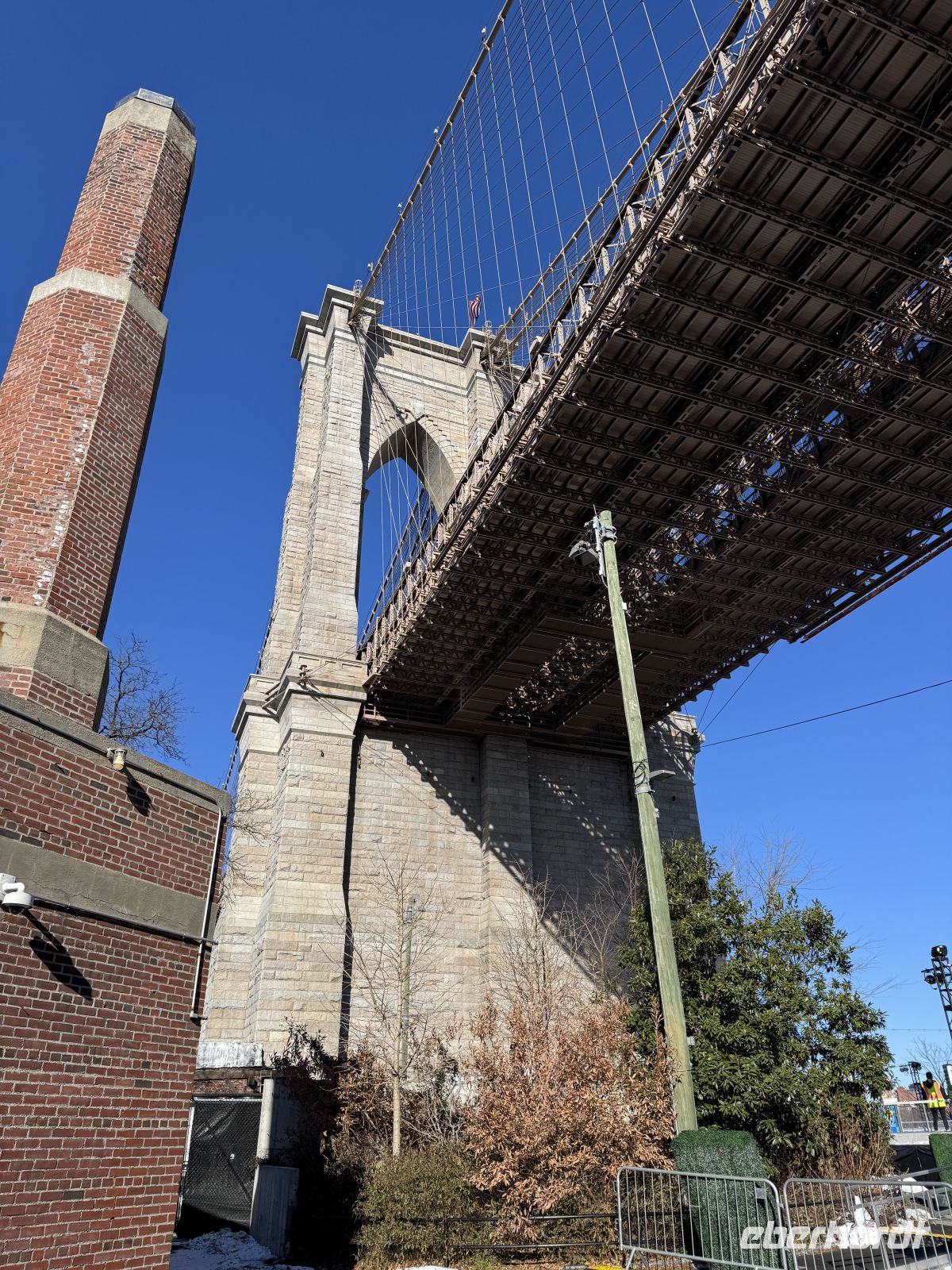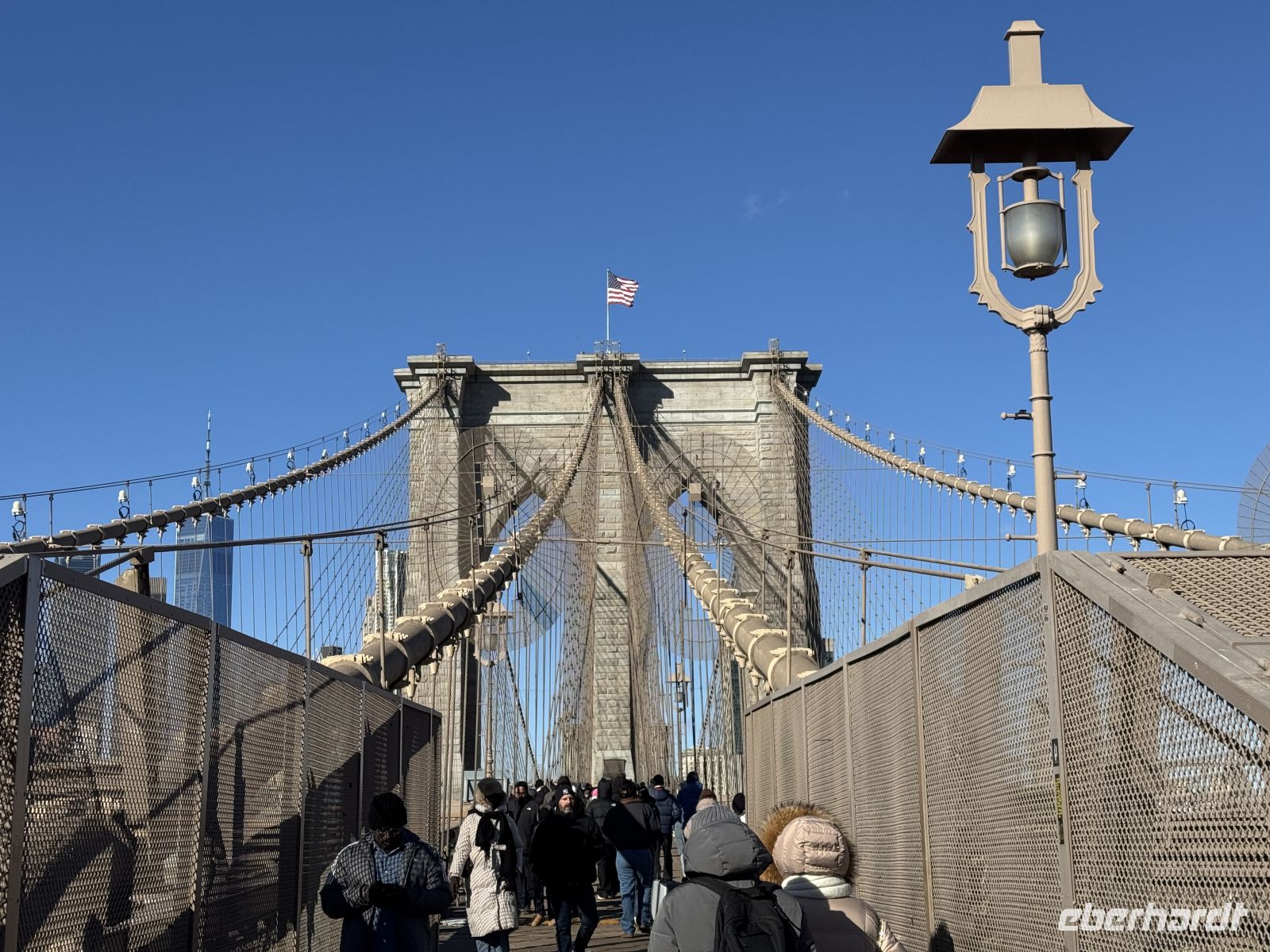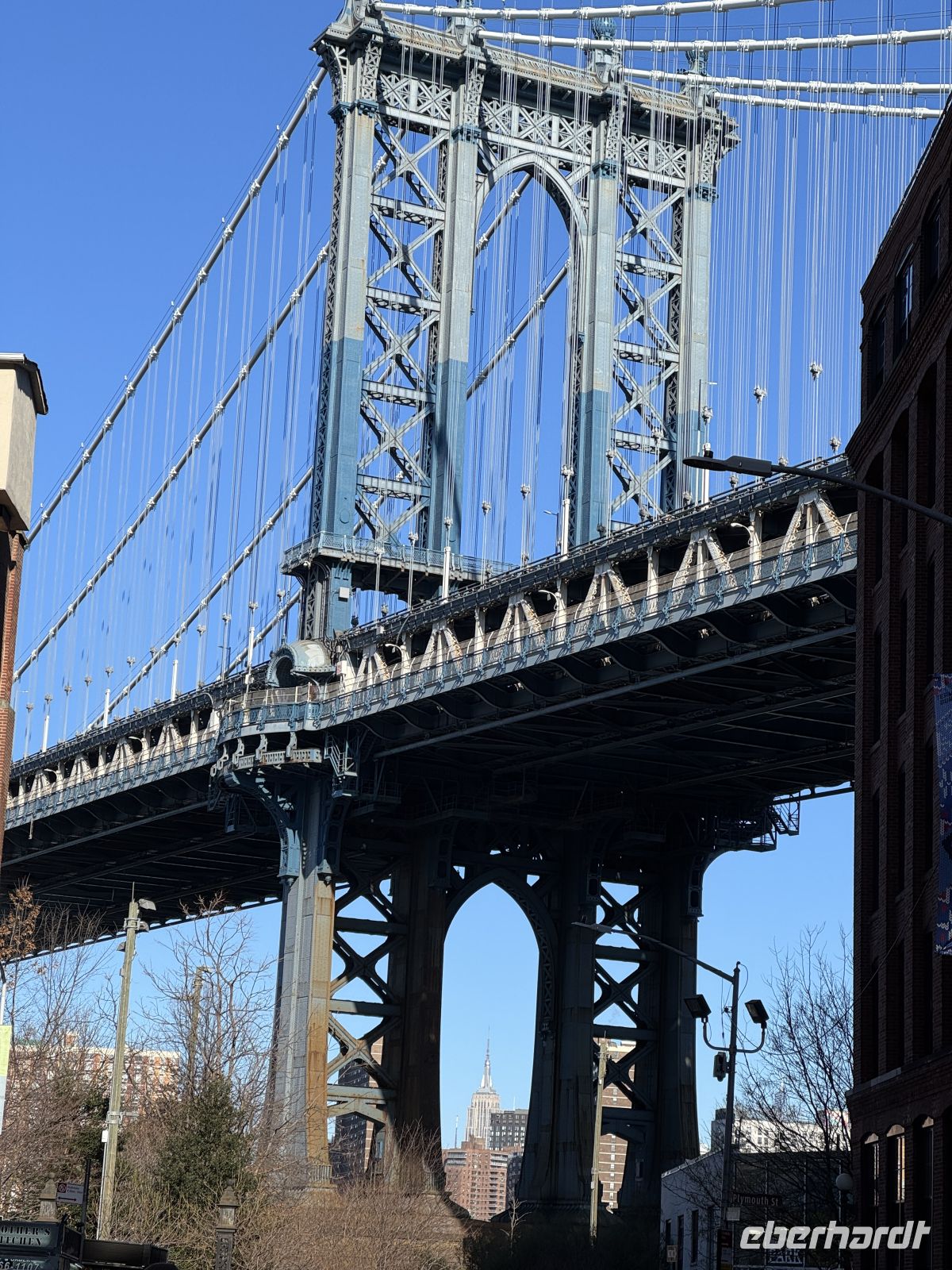 Am Fluss entlang genießen wir einen fantastischen Blick auf die Skyline, die sich bei jedem Schritt ein Stück anders präsentiert. Wir Setzen unseren Weg fort und verlassen Brooklyn über die Brooklyn Bridge. Für Fußgänger wurde ein spezieller Weg geschaffen, der über den Straßen verläuft und uns einen einzigartigen Blick auf die Brücke und die Skyline von Manhattan bietet.