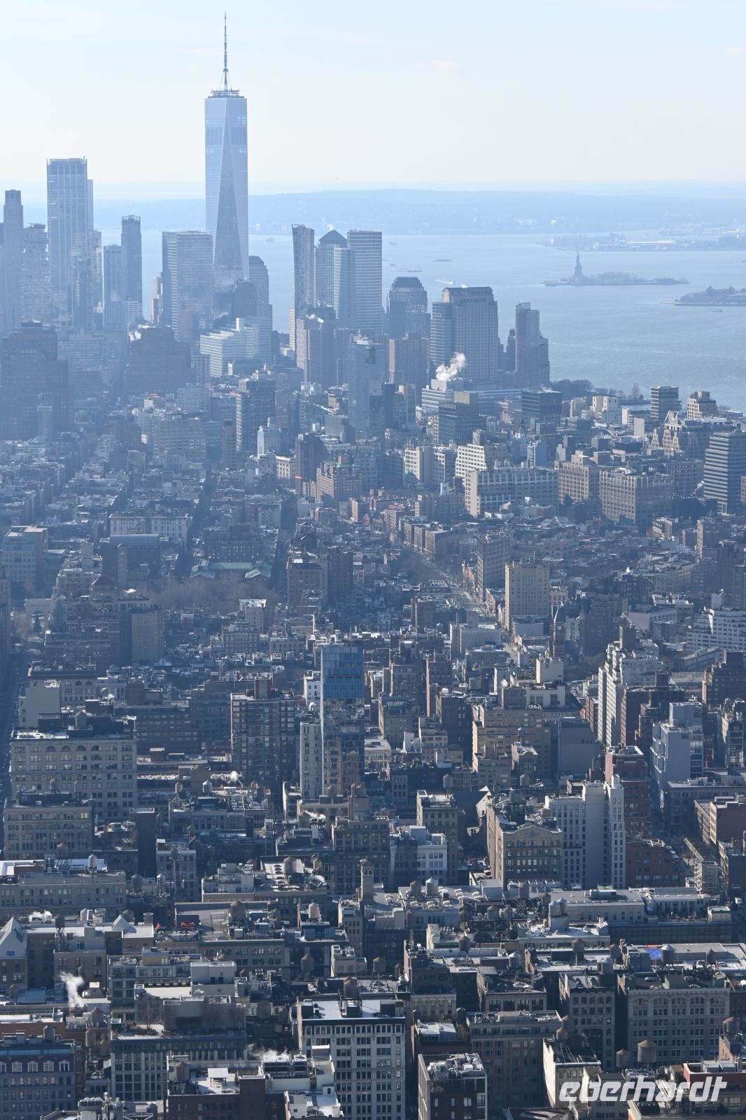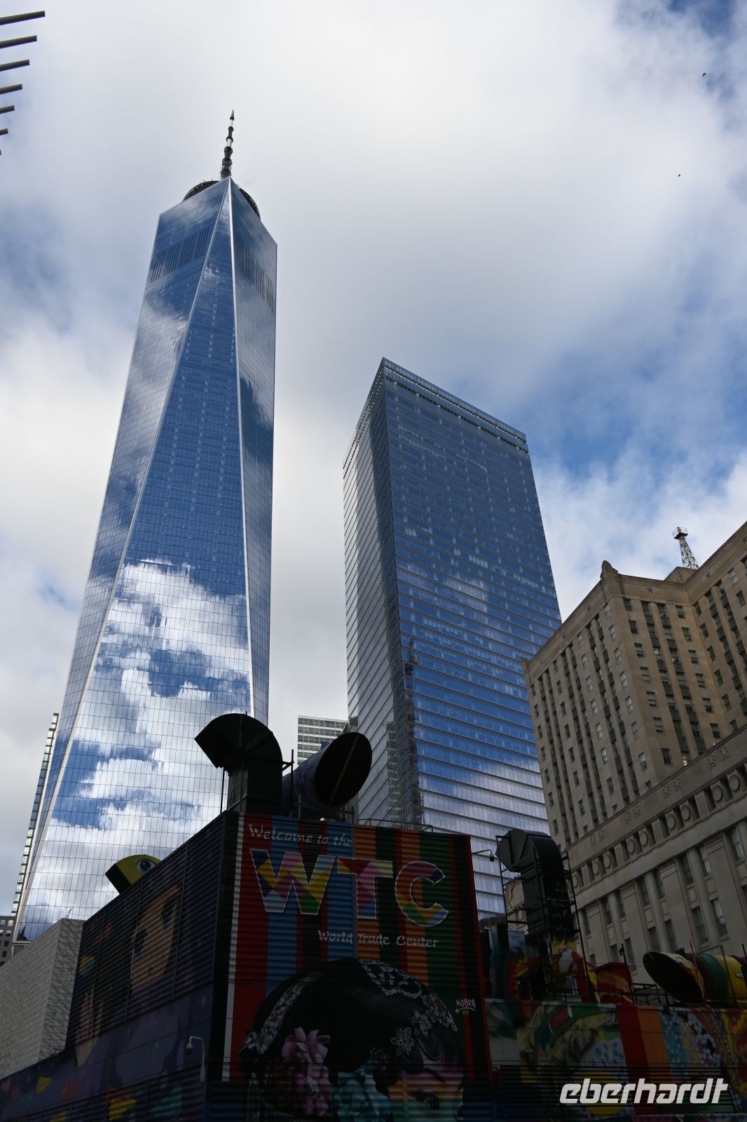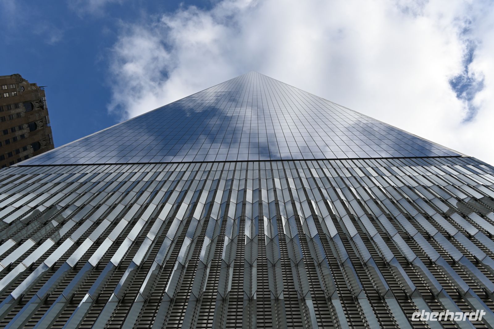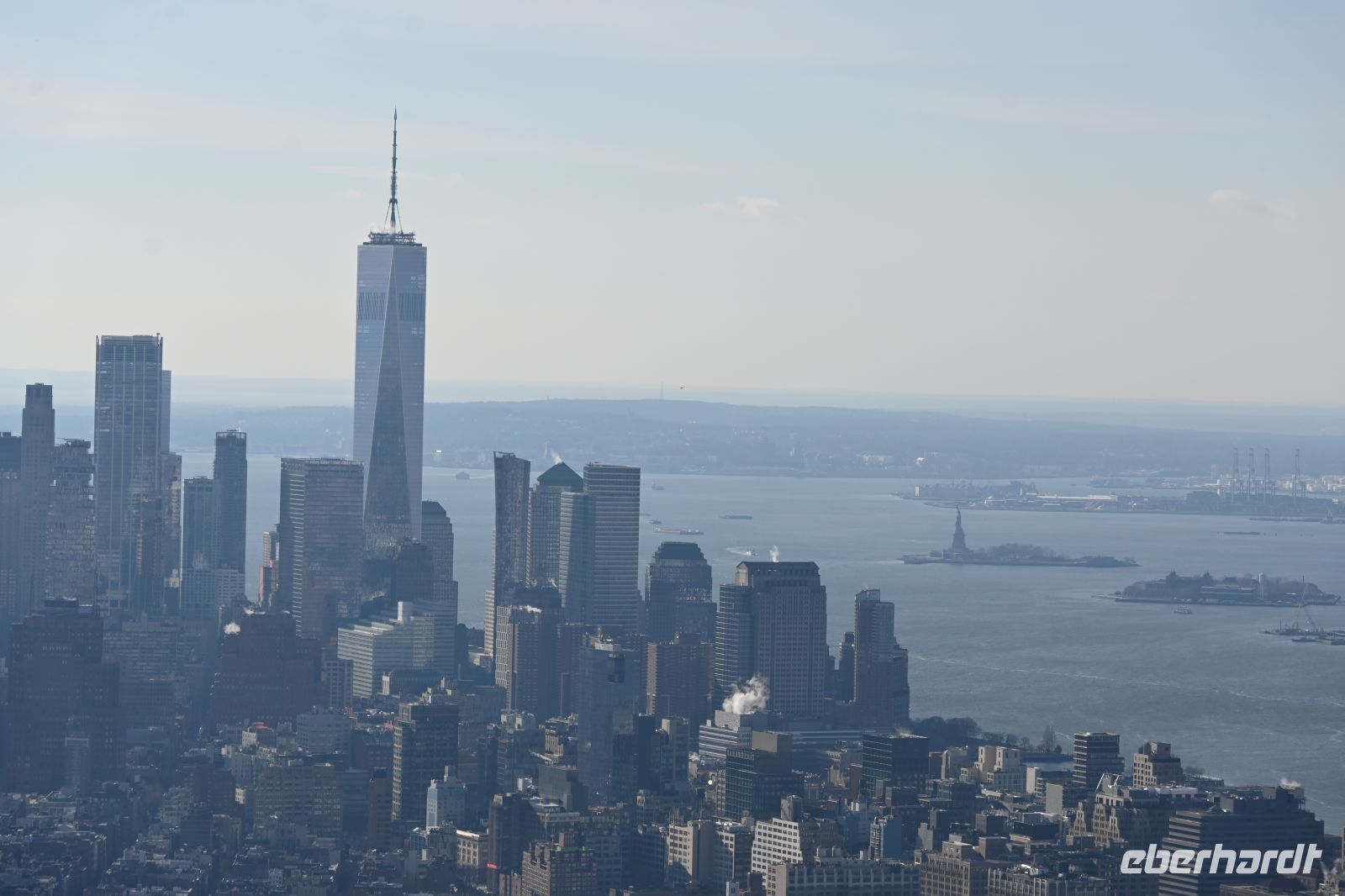 Heute wollen wir auf das höchste Gebäude der Stadt, dem One World Trade Center. Von hier haben wir freie Sicht auf die ganze Stadt und auch rüber nach New Jersey. Bei solch guten Bedingungen kann man bis zu 65 Kilometer weit sehen. Nach den Ereignissen des 11. Septembers 2001 wurde der Bau des Wolkenkratzers 2006 begonnen und 2014 abgeschlossen.