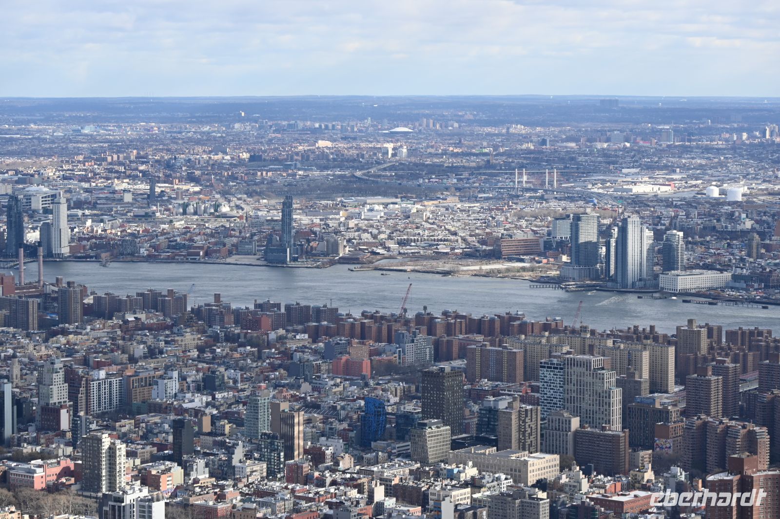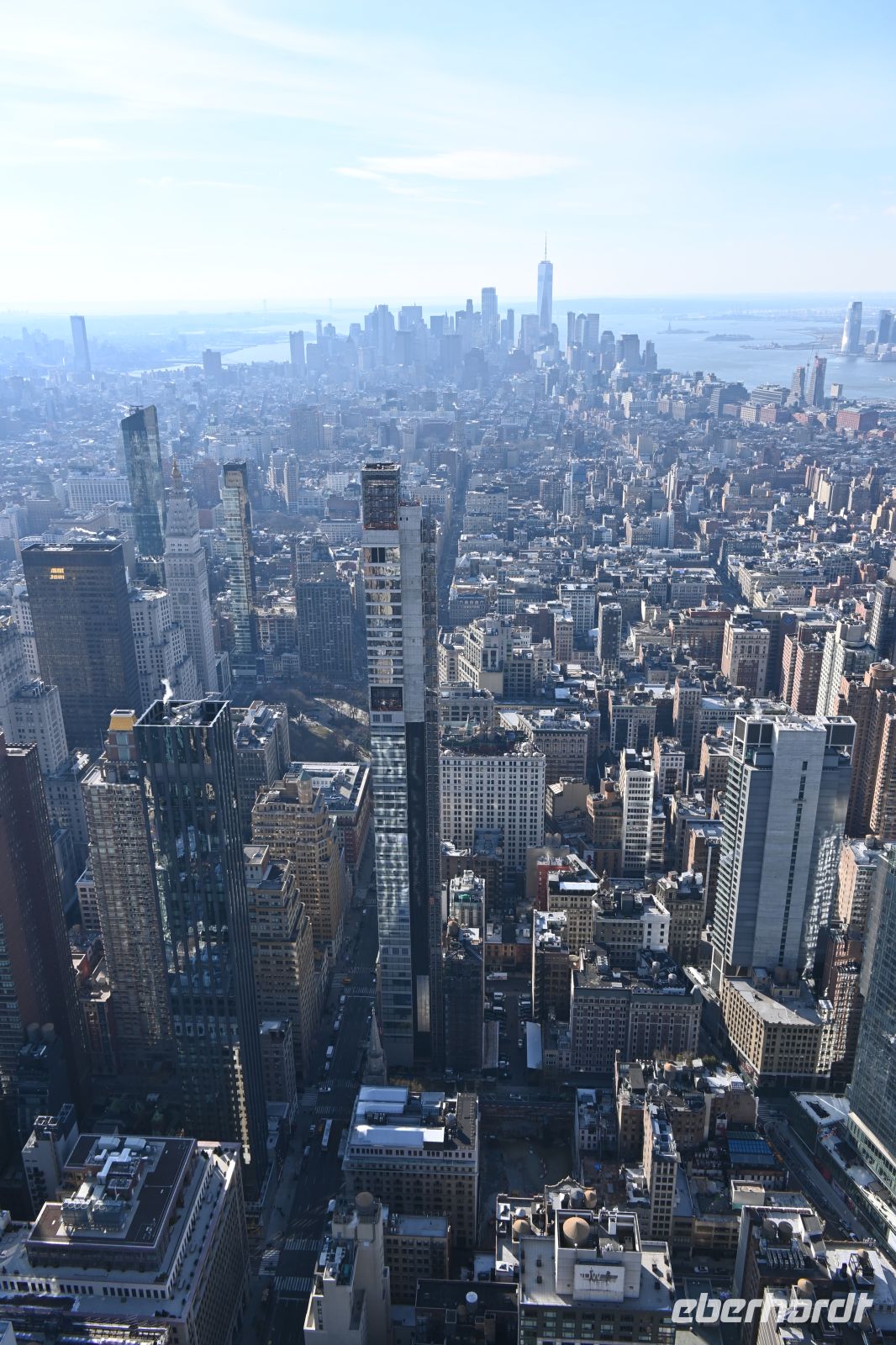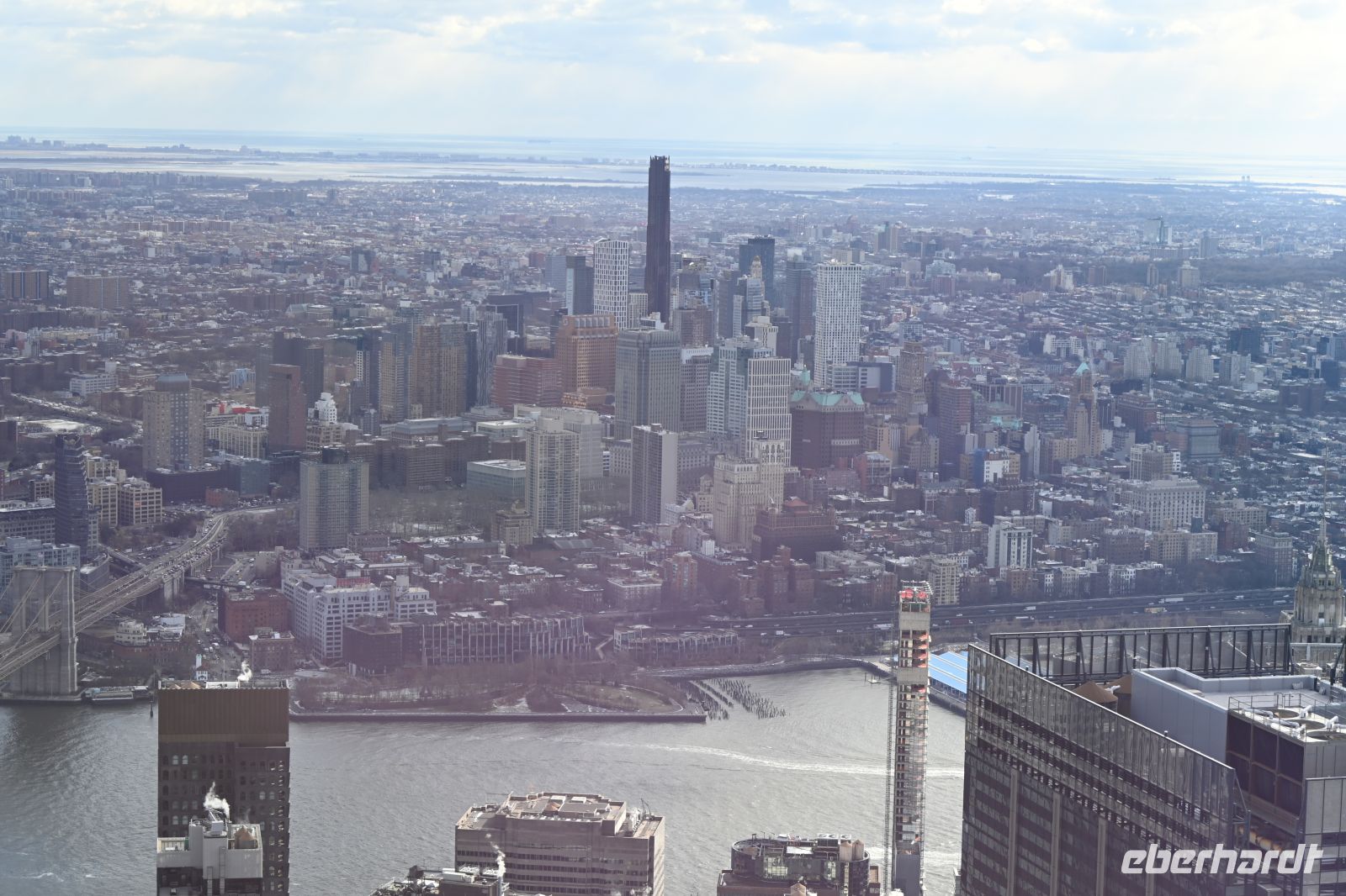 Heute wollen wir auf das höchste Gebäude der Stadt, dem One World Trade Center. Von hier haben wir freie Sicht auf die ganze Stadt und auch rüber nach New Jersey. Bei solch guten Bedingungen kann man bis zu 65 Kilometer weit sehen. Nach den Ereignissen des 11. Septembers 2001 wurde der Bau des Wolkenkratzers 2006 begonnen und 2014 abgeschlossen.