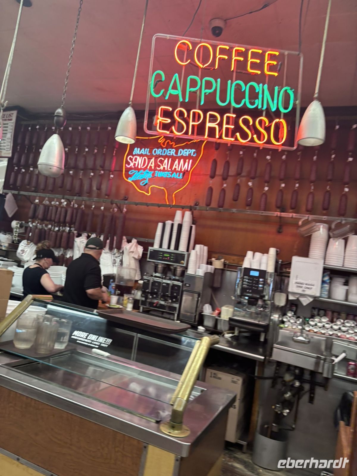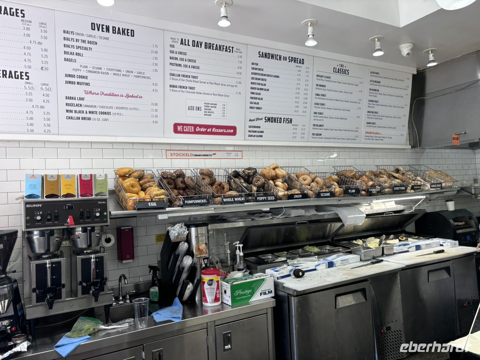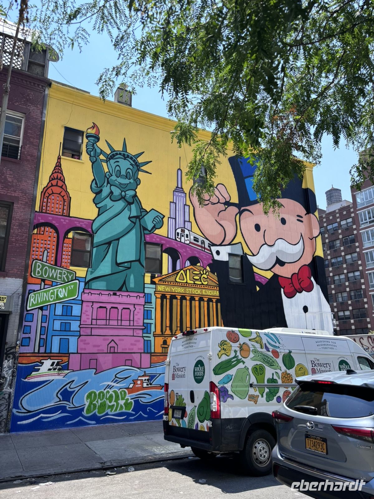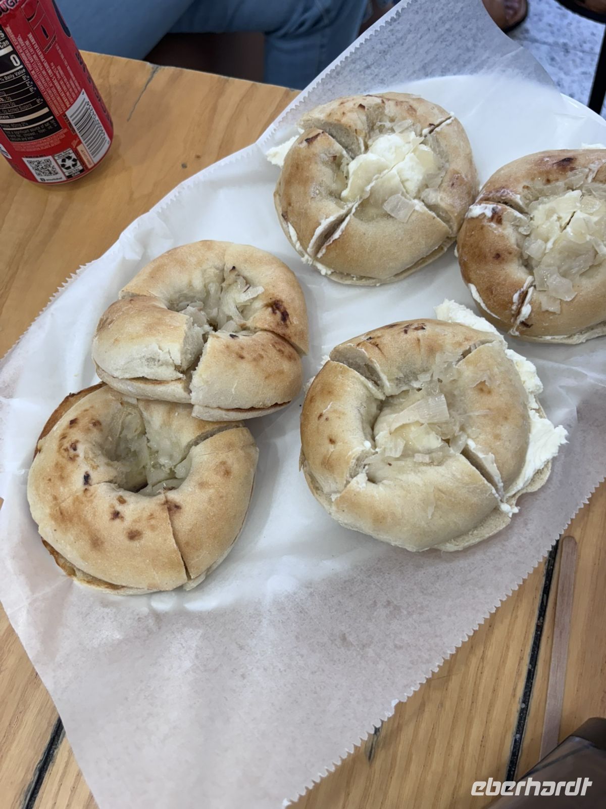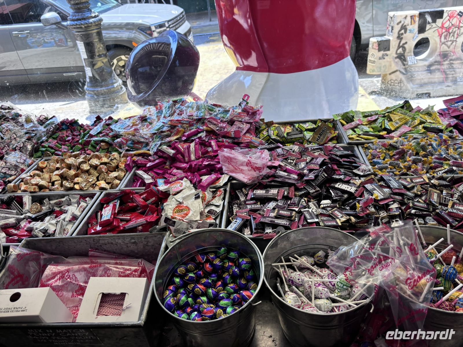 Die Lower Eastside hat auf Grund der vielen Kulturen, die sich hier vereinen, einiges an Kulinarik zu bieten. Weiter ging es zu „Kossar’s“ die Bagels und Bialys mit den verschiedensten Aufstrichen anboten. Wie verkosteten einen Bialy mit Frischkäse und Butter, ein jüdisches Gepäck, was Form und Aussehen eines Bagels hat, sich aber in der Zubereitung zum Bagel unterscheidet. Gleich daneben befand sich „The Pickle Guys“. Früher, als es noch keine Kühlmöglichkeiten gab, war Einlegen und Einwecken eine gute Variante, Lebensmittel haltbar zu machen. Seit 2002 setzt der Laden die Tradition der jüdischen Einwanderer fort und bietet eine beeindruckende Auswahl an eingelegtem Gemüse, von klassischen Dillgurken bis hin zu exotischeren Optionen wie eingelegtem Knoblauch und Mangos. Danach folgten süße Verkostungen wie Halva, eine traditionelle Süßigkeit, die hauptsächlich aus Sesampaste, Zucker und Nüssen besteht.