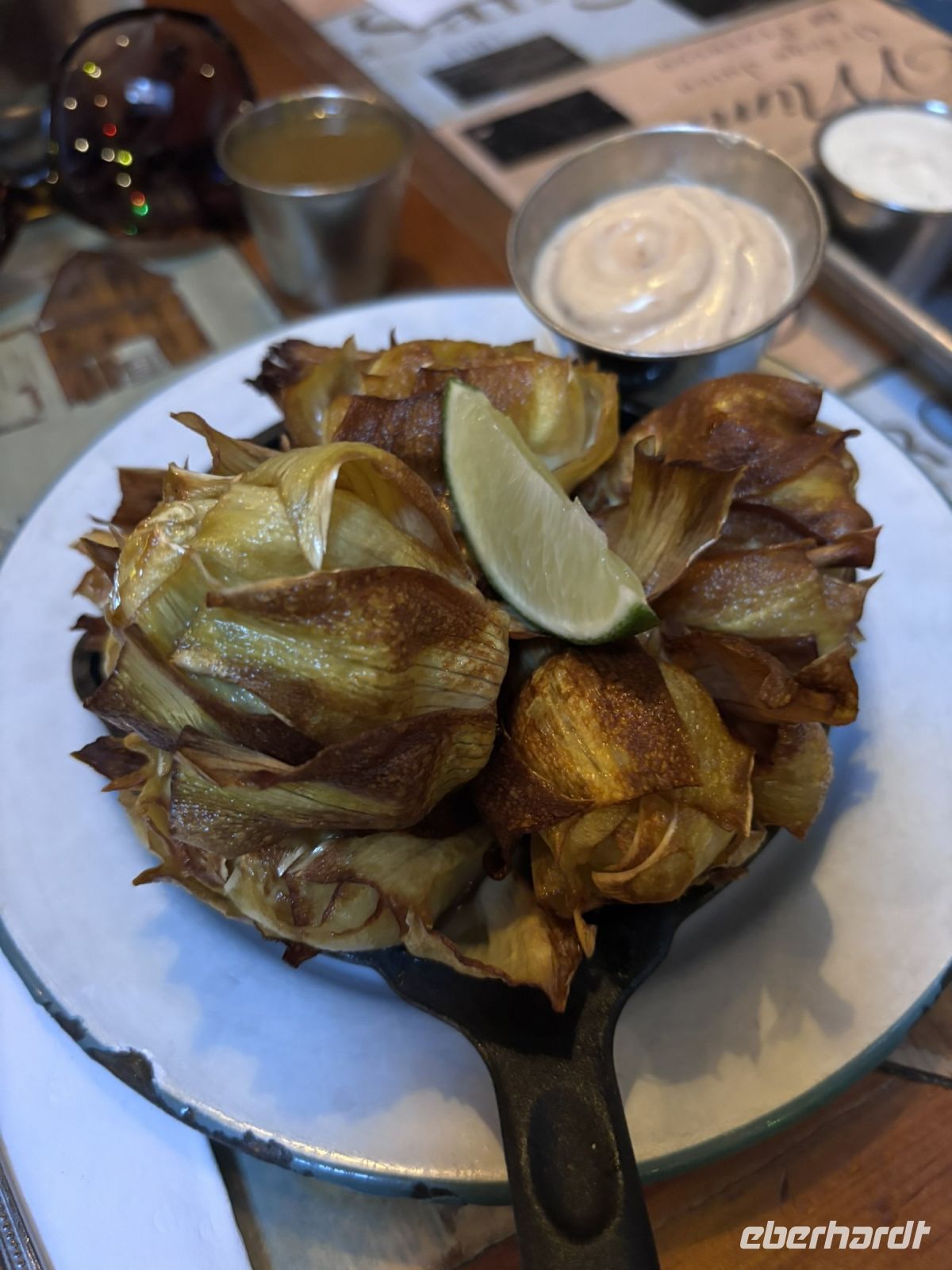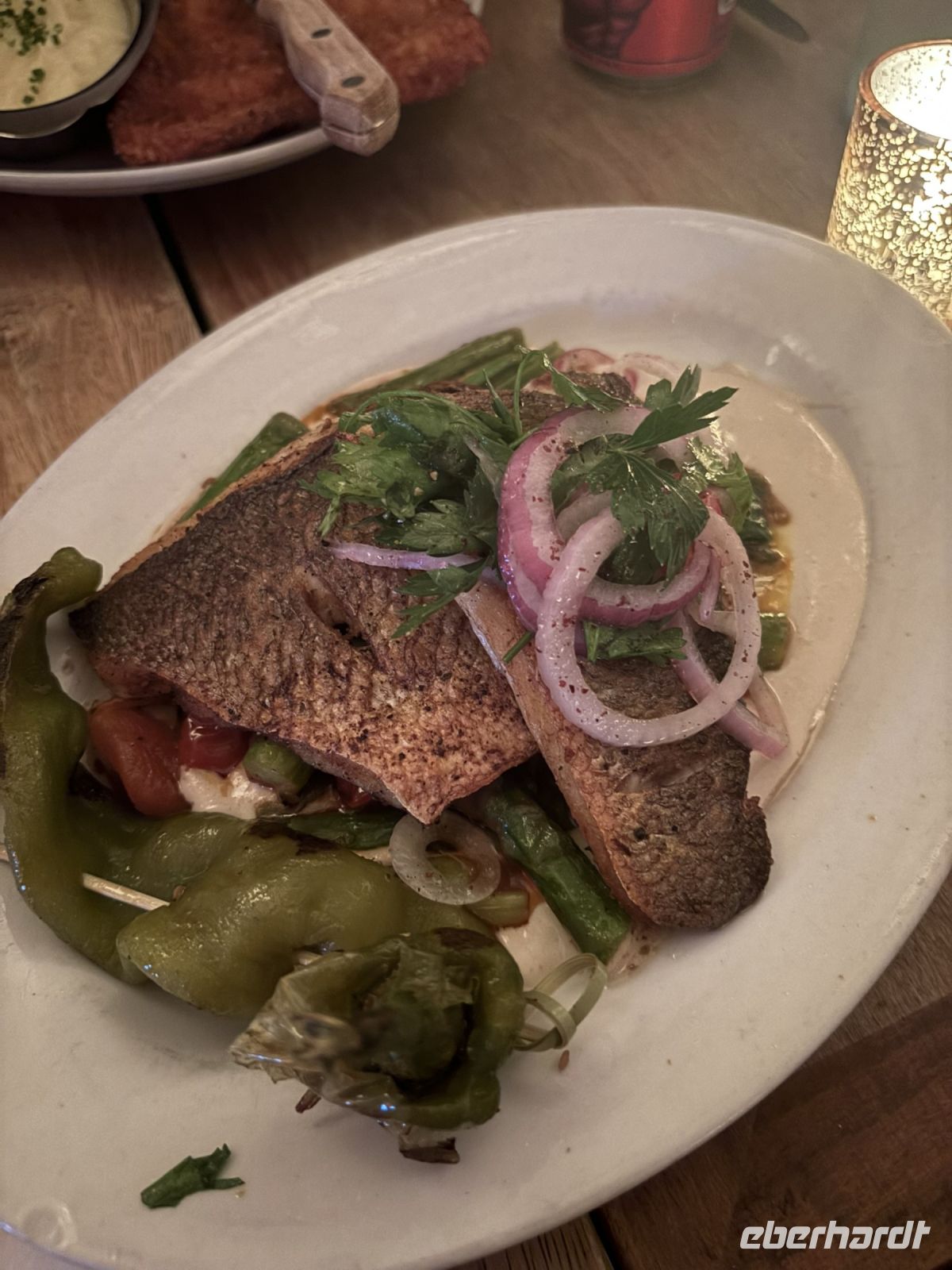 Zurück im Hotel konnten wir noch ein wenig entspannen und runterkühlen, bis es dann zum Abendessen in SoHo ging. Das jüdische Restaurant „Cleveland 19“ servierte uns verschiedene Speisen wie Humus, Ceviche, gebratene Auberginen, Salat und Schnitzel. So konnte sich jeder nehmen, worauf er Appetit hatte.
