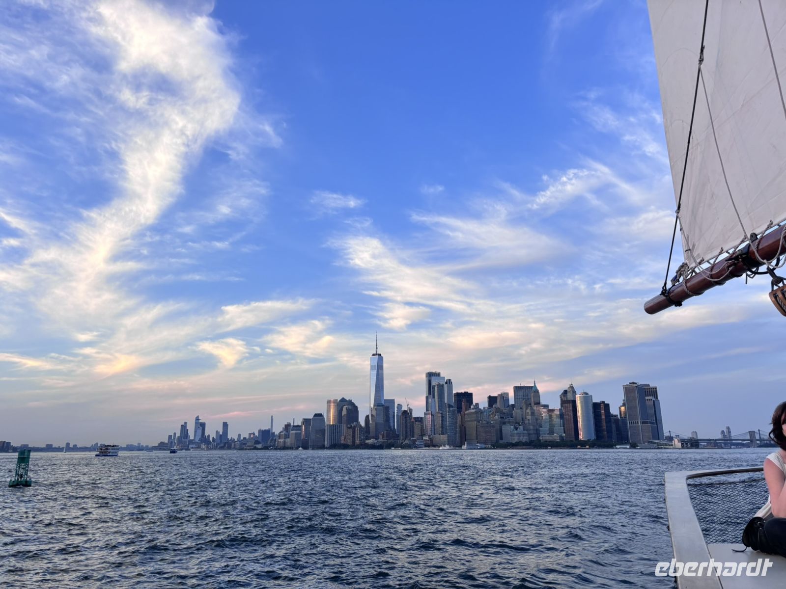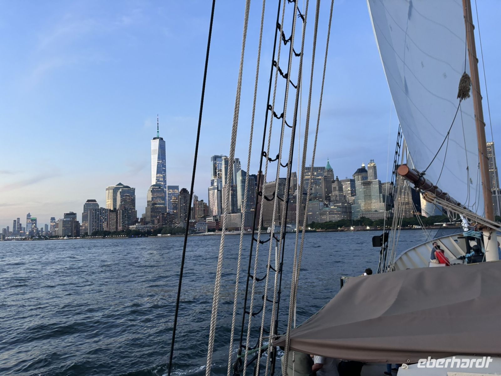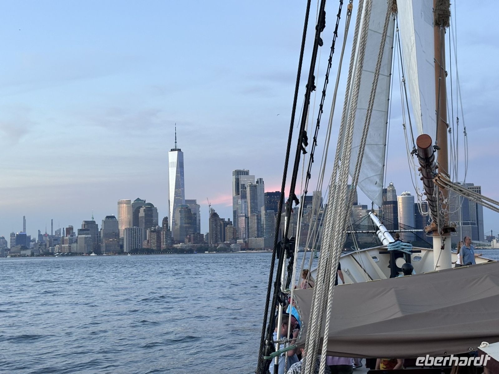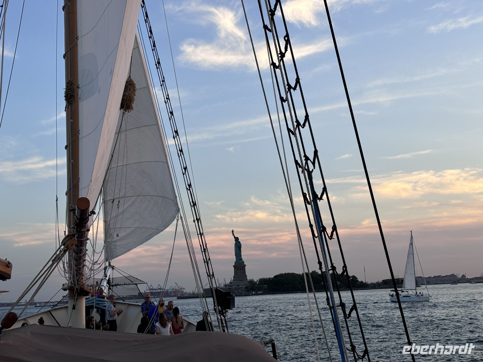 Am Abend erlebten wir das nächste Highlight unserer Reise. Vom Pier 17 startete unser Segeltörn auf der Clipper City, begleitet von Wein und Live-Jazzmusik. Zwei Stunden lang schipperten wir entspannt auf dem Hudson River um Manhattan. Bei Sonnenuntergang genossen wir die großartigen Ausblicke auf die Freiheitsstatue und die Skyline Manhattans.