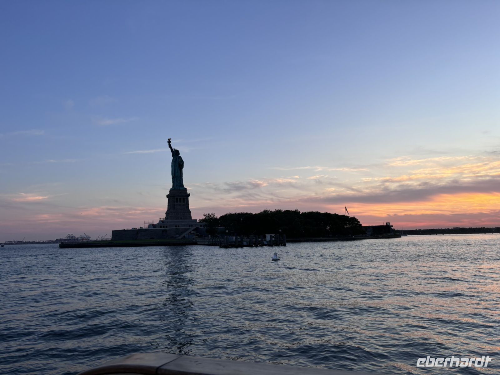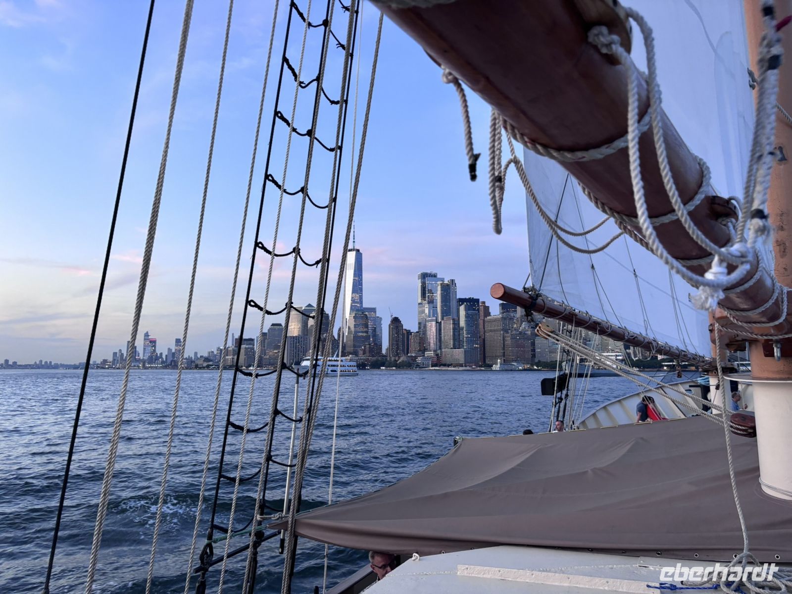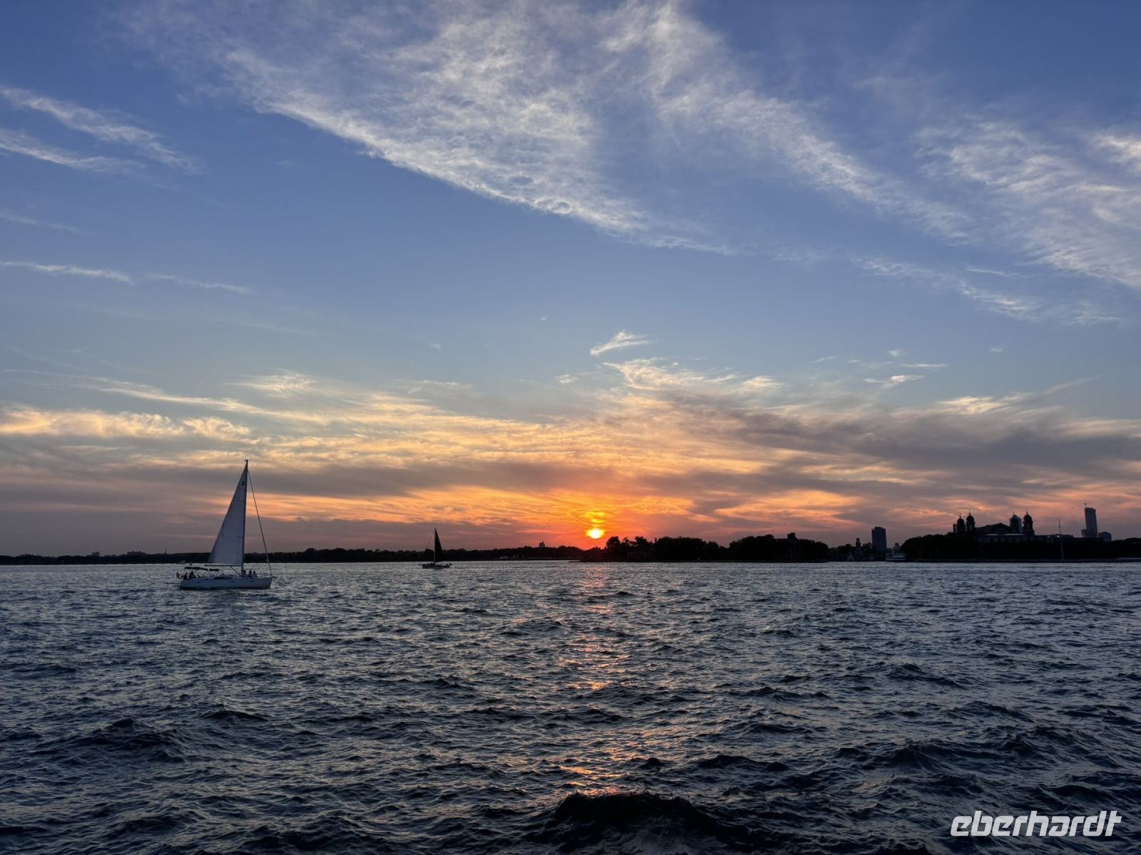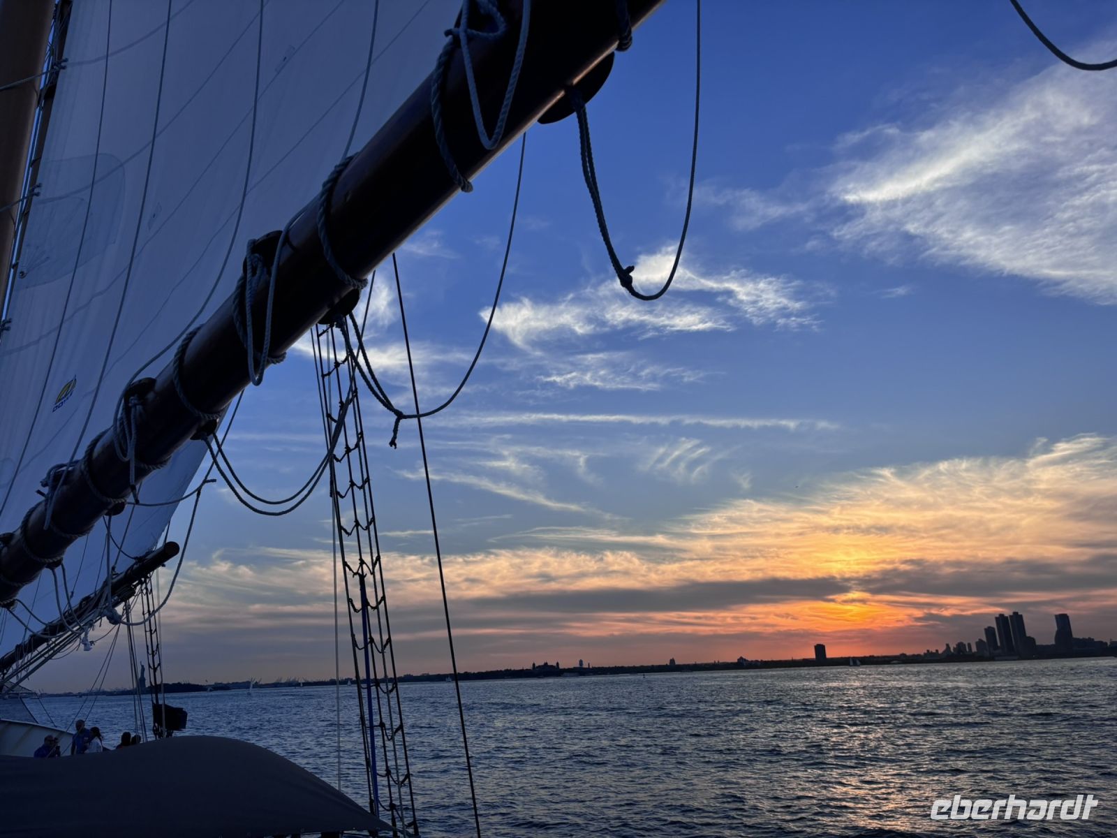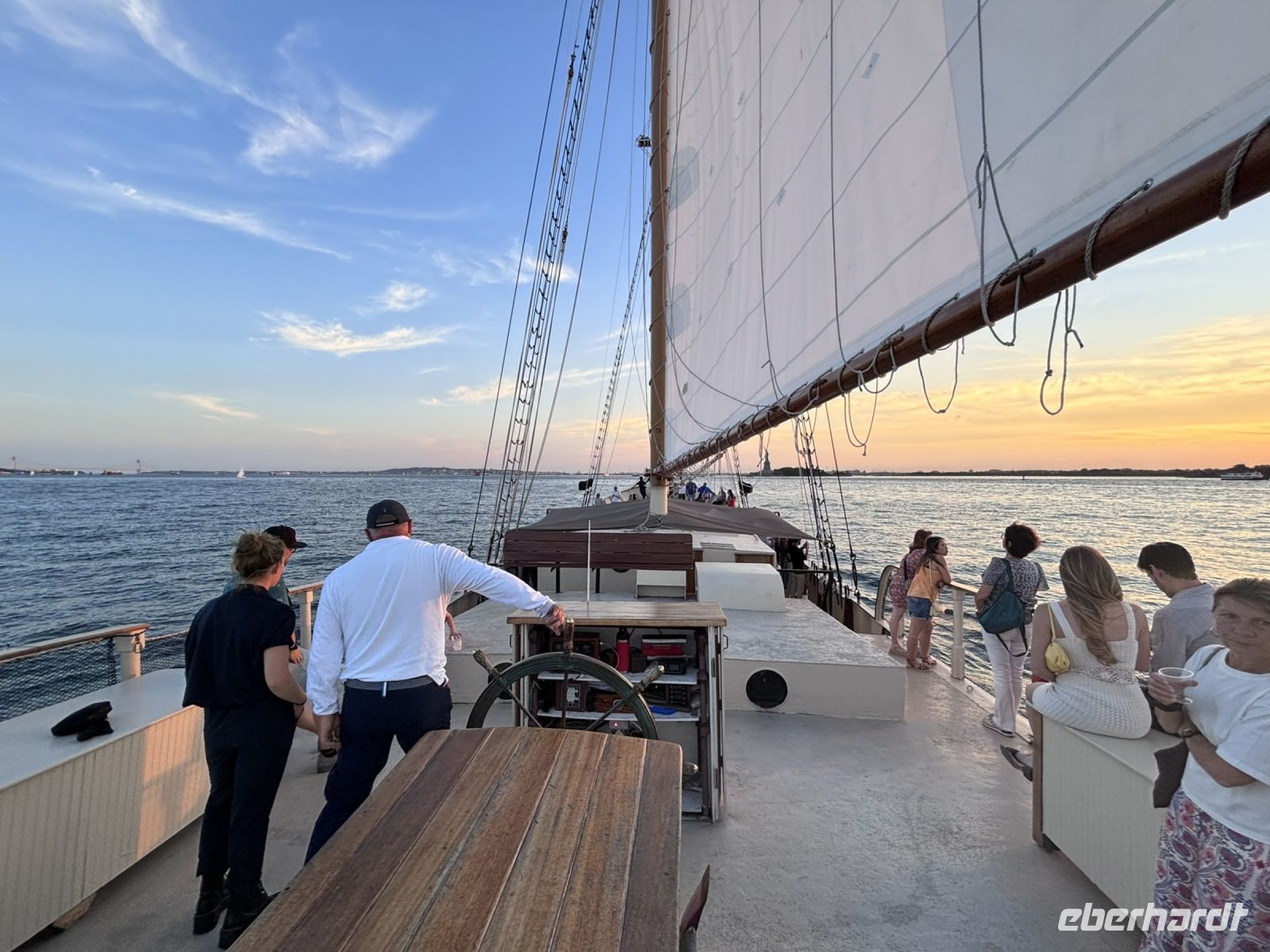 Am Abend erlebten wir das nächste Highlight unserer Reise. Vom Pier 17 startete unser Segeltörn auf der Clipper City, begleitet von Wein und Live-Jazzmusik. Zwei Stunden lang schipperten wir entspannt auf dem Hudson River um Manhattan. Bei Sonnenuntergang genossen wir die großartigen Ausblicke auf die Freiheitsstatue und die Skyline Manhattans.