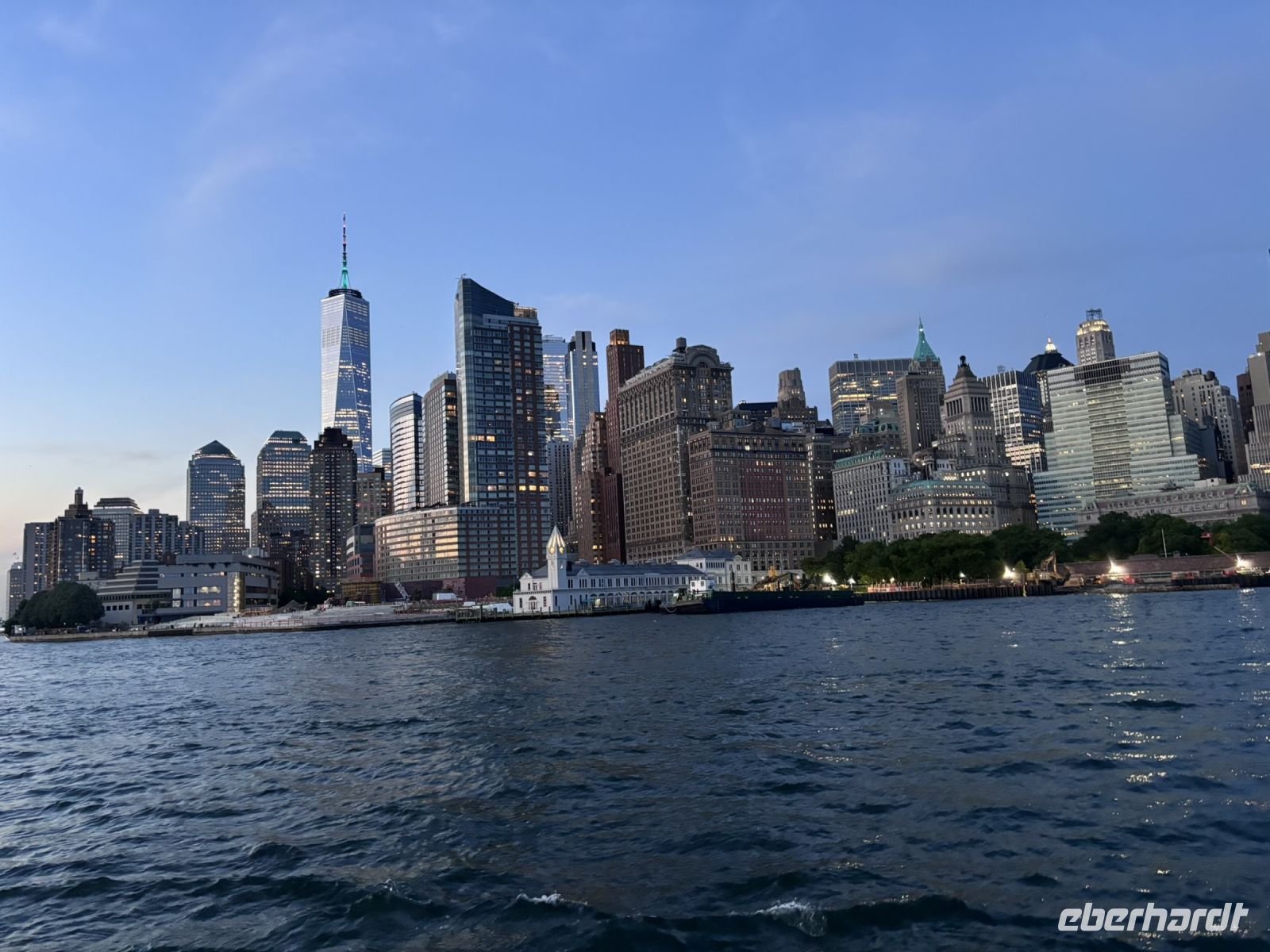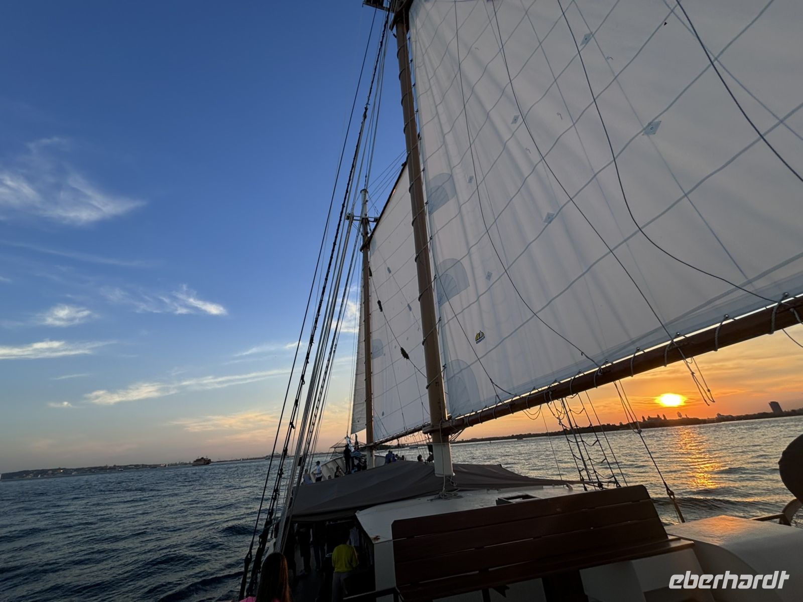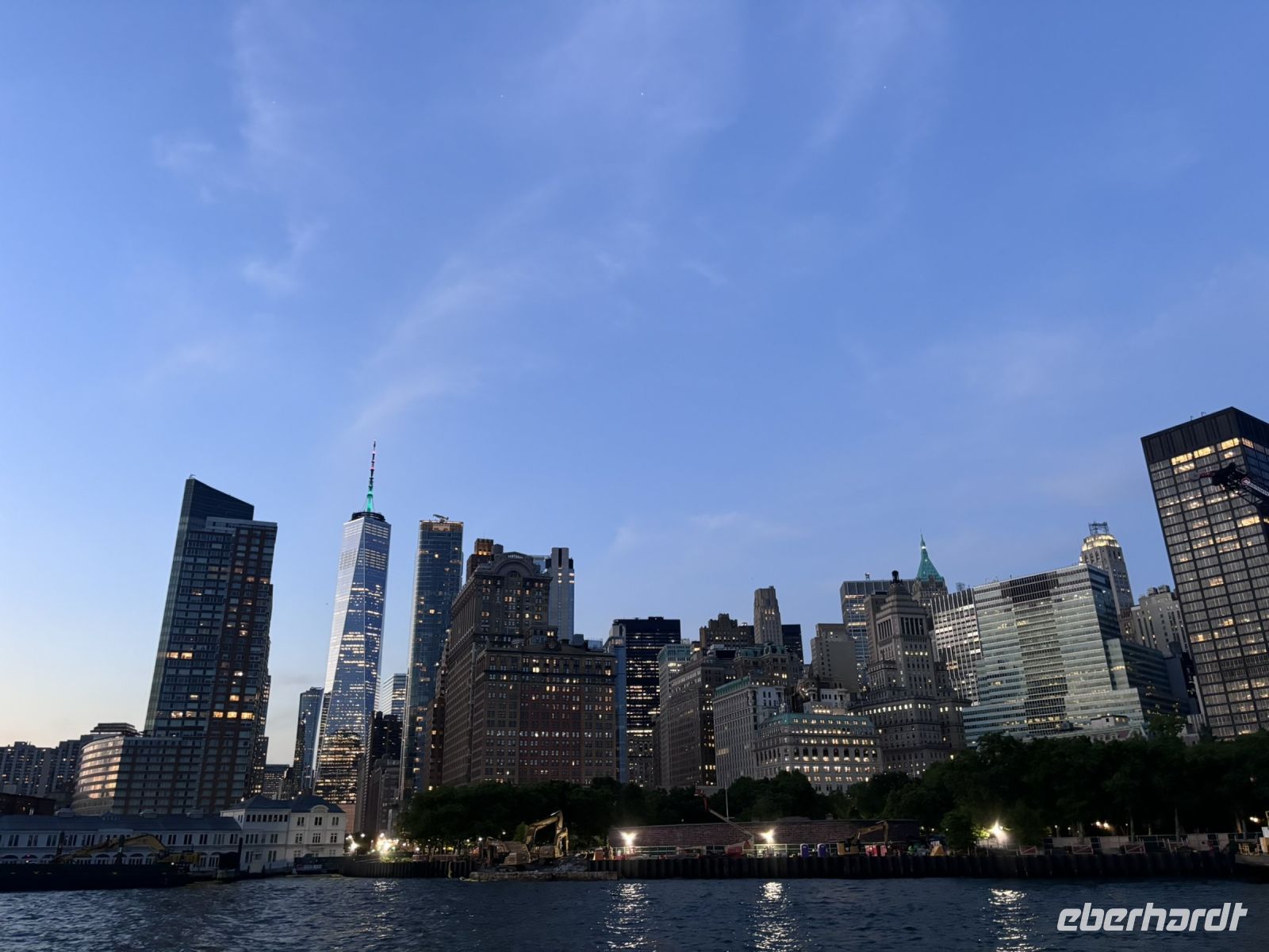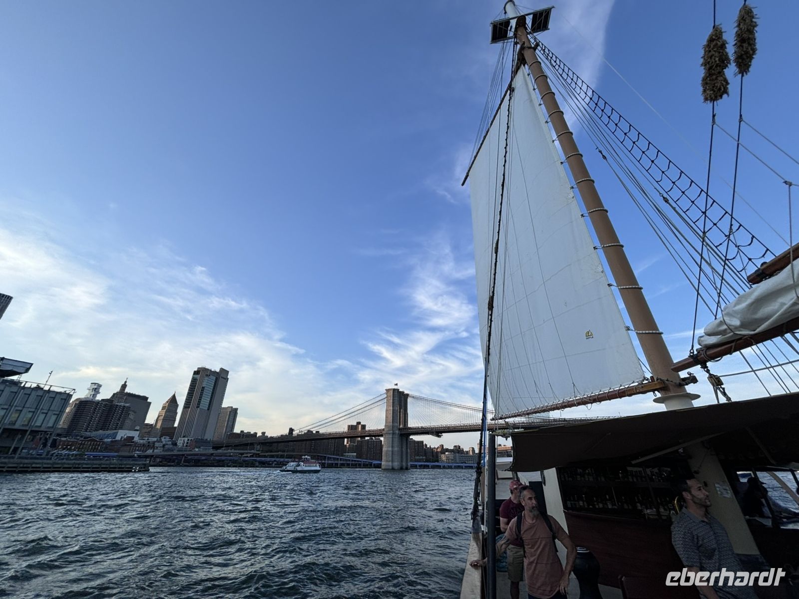 Am Abend erlebten wir das nächste Highlight unserer Reise. Vom Pier 17 startete unser Segeltörn auf der Clipper City, begleitet von Wein und Live-Jazzmusik. Zwei Stunden lang schipperten wir entspannt auf dem Hudson River um Manhattan. Bei Sonnenuntergang genossen wir die großartigen Ausblicke auf die Freiheitsstatue und die Skyline Manhattans.