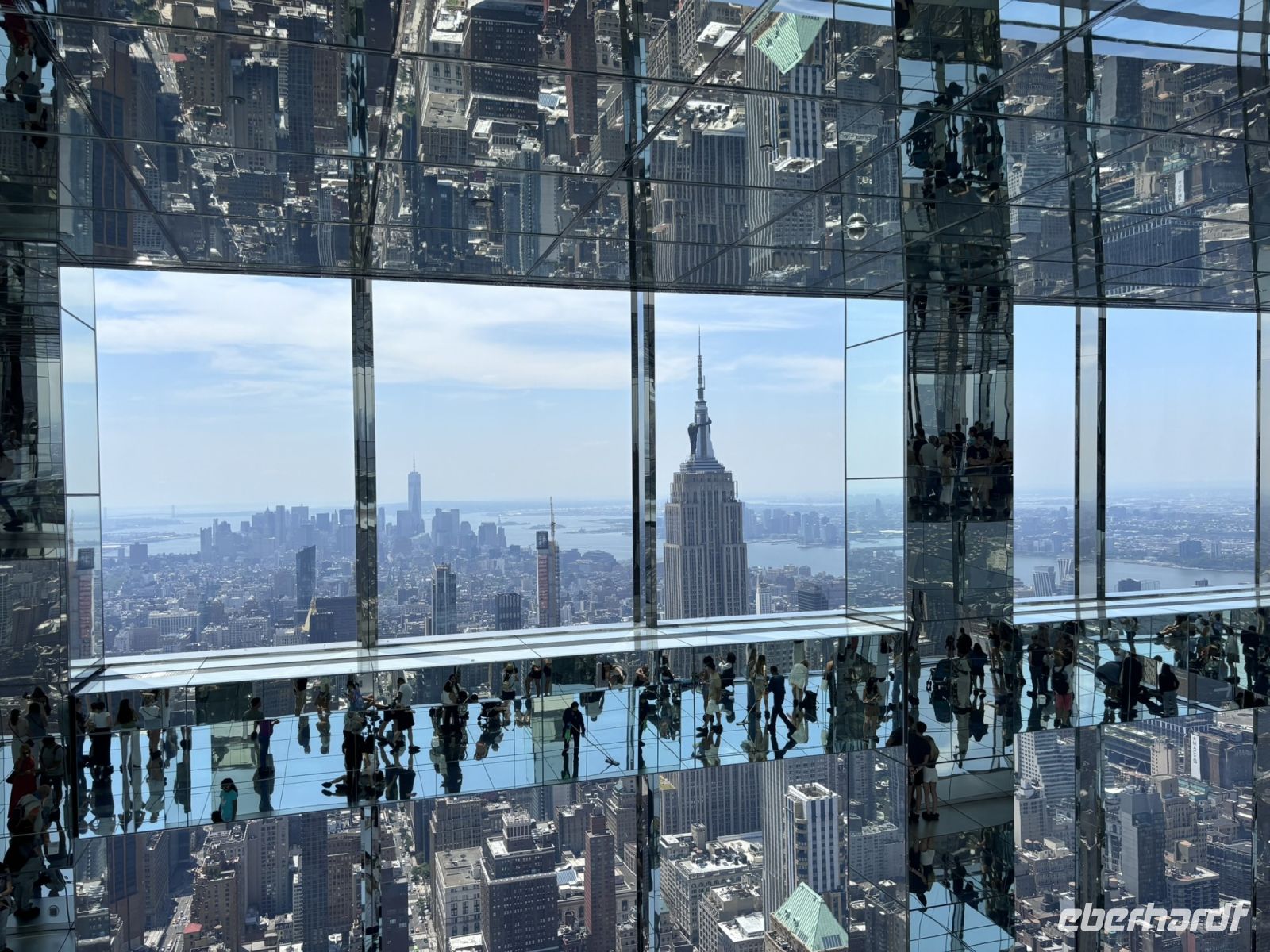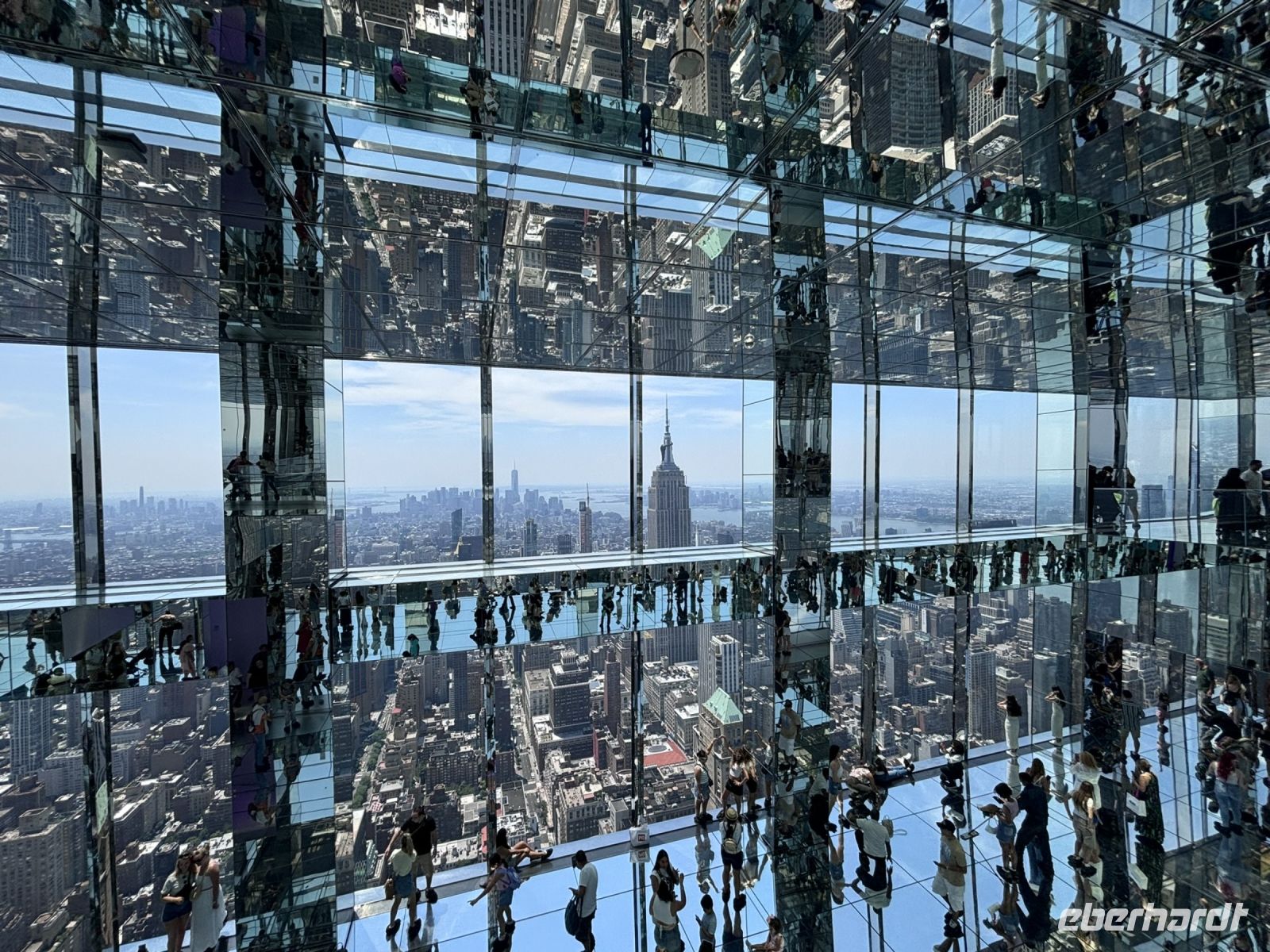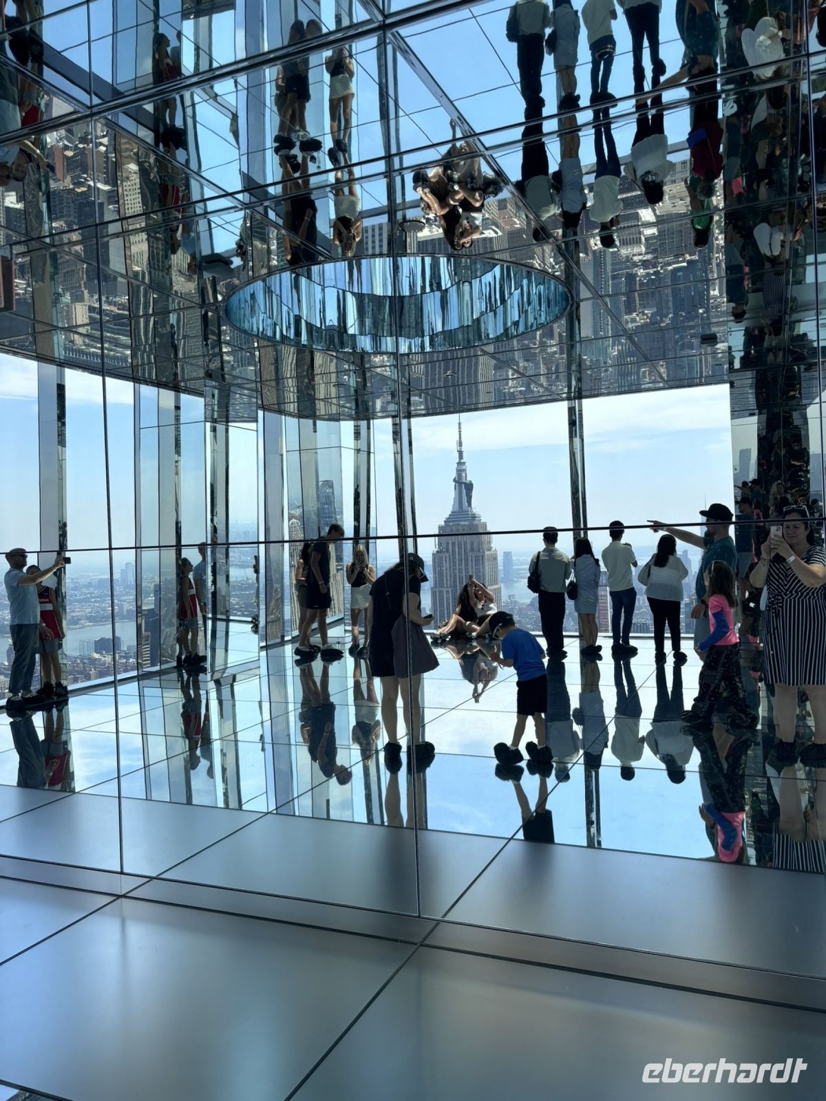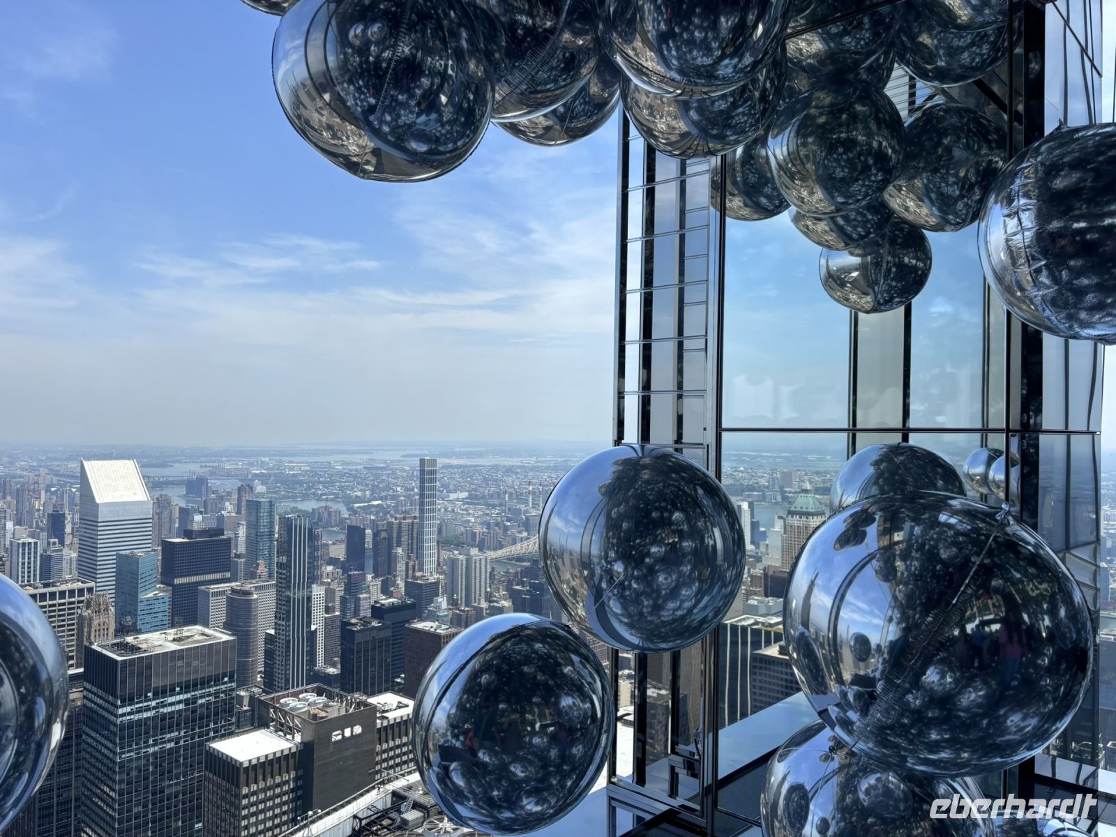 Weiter ging es zur Aussichtsplattform "SUMMIT One Vanderbilt". 2021 wurde diese neue Plattform eröffnet und befindet sich in 335 m Höhe. Das beeindruckende an „The Summit“ sind die verschiedenen Räume mit Spiegeln oder silbernen Luftballons, was das Fotografieren noch spannender macht und natürlich der Wahnsinnsausblick, den man dank der bodentiefen Fenster noch besser genießen kann. Auf der Terrace gibt es auch eine Bar. Mit einem kühlen Getränk in der Hand ist der Ausblick noch besser.