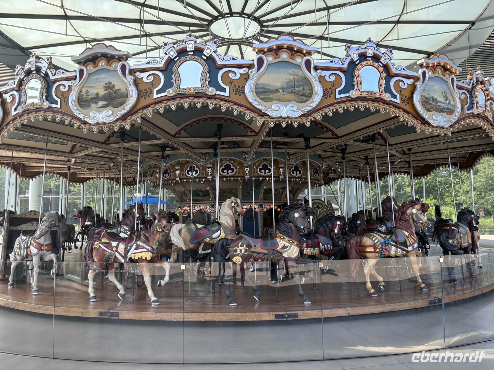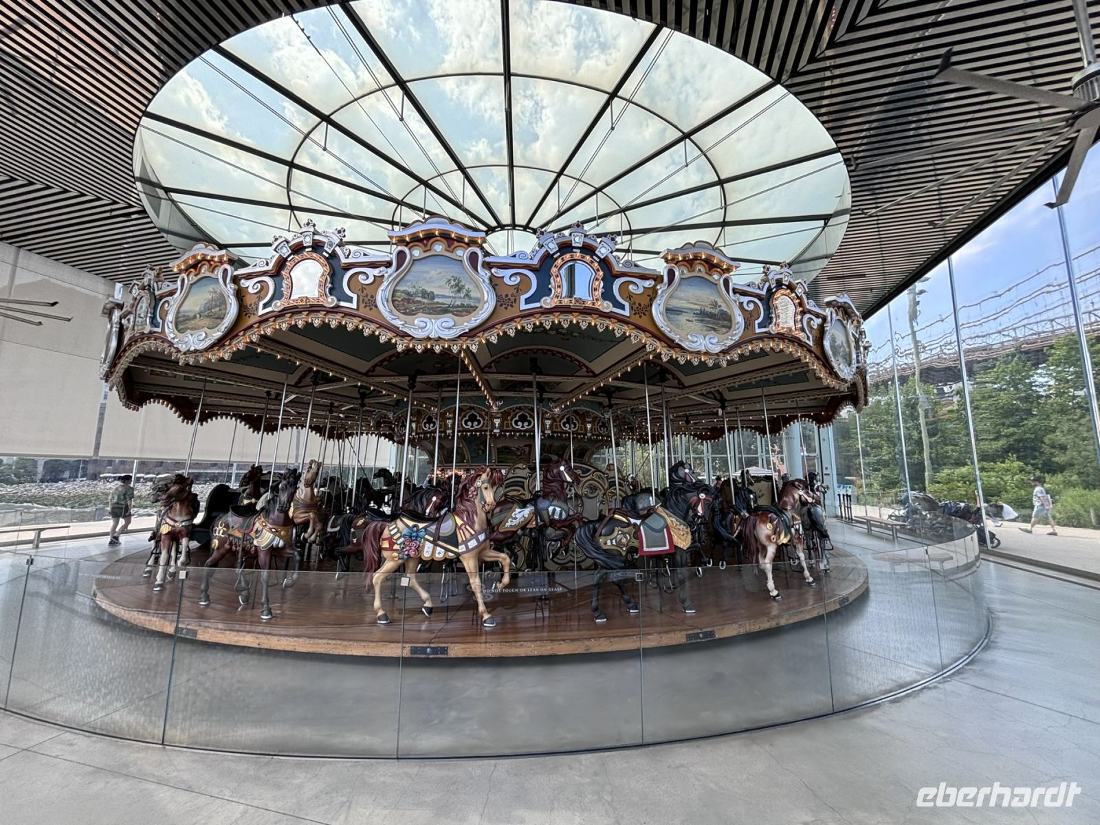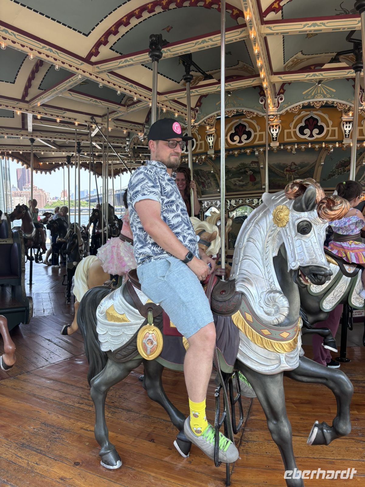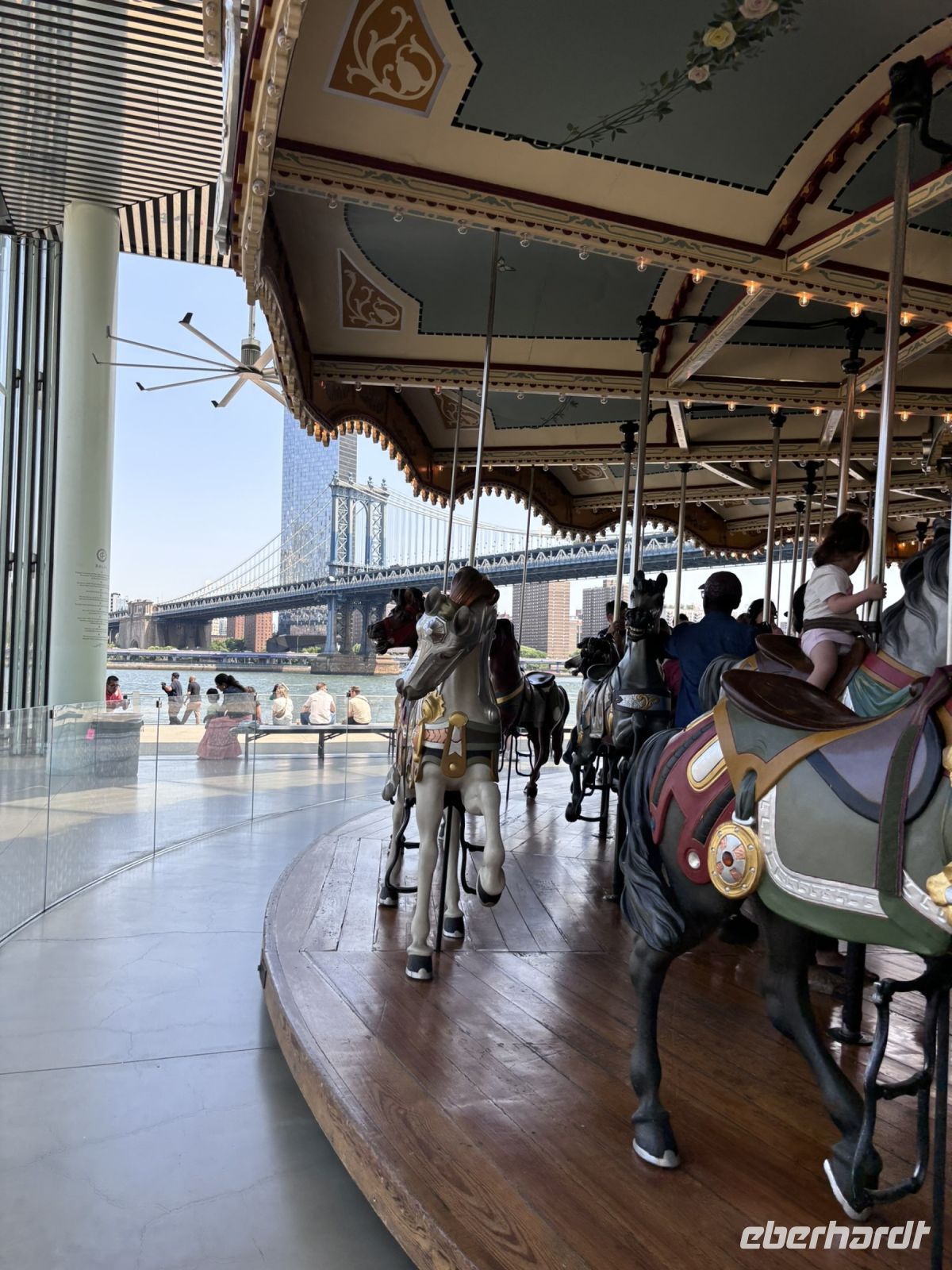 Mit dem Bus fuhren wir in die Brooklyn Heights, einem historischen Stadtteil mit seinen Brownstone-Häusern, die man aus zahlreichen Filmen kennt. Auch hier finden sich viele kleine Restaurants, Cafés und Boutiquen und ein bisschen weniger Trubel als in Manhattan. Die Promenade der Brooklyn Heights bietet einen Wahnsinnsausblick auf die Skyline von Manhattan. Mit dieser tollen Aussicht spazierten wir zum Brooklyn Bridge Park, wo einige der Gäste noch mal Kind sein durften. In einem gläsernen Pavillon mit Blick auf die Brookyln Bridge und der Skyline von Manhattan befindet sich Jane‘s Carousel aus dem Jahr 1920. Hier dürfen nicht nur Kinder mitfahren, sondern auch Erwachsene, was viele aus der Gruppe auch taten.