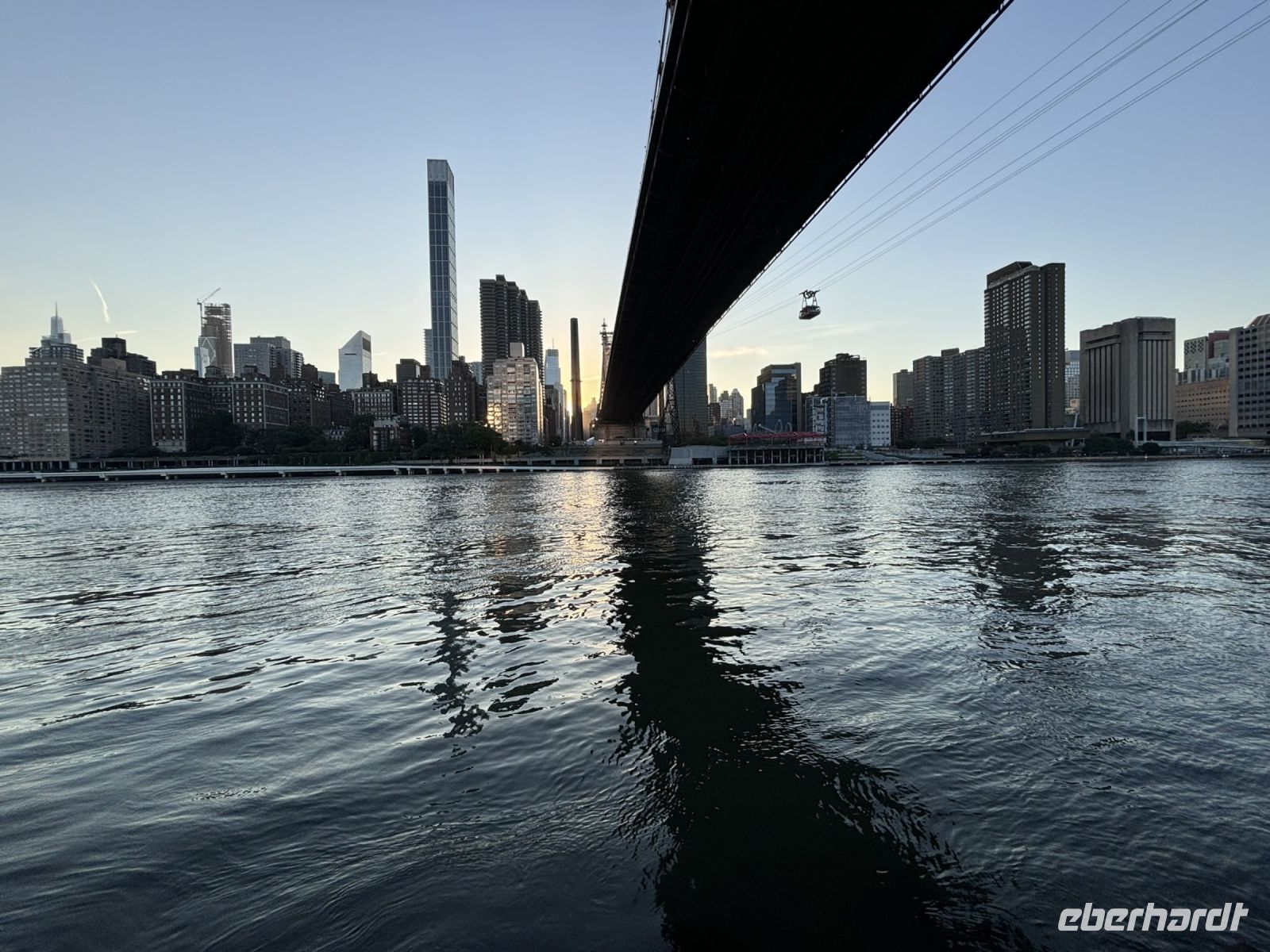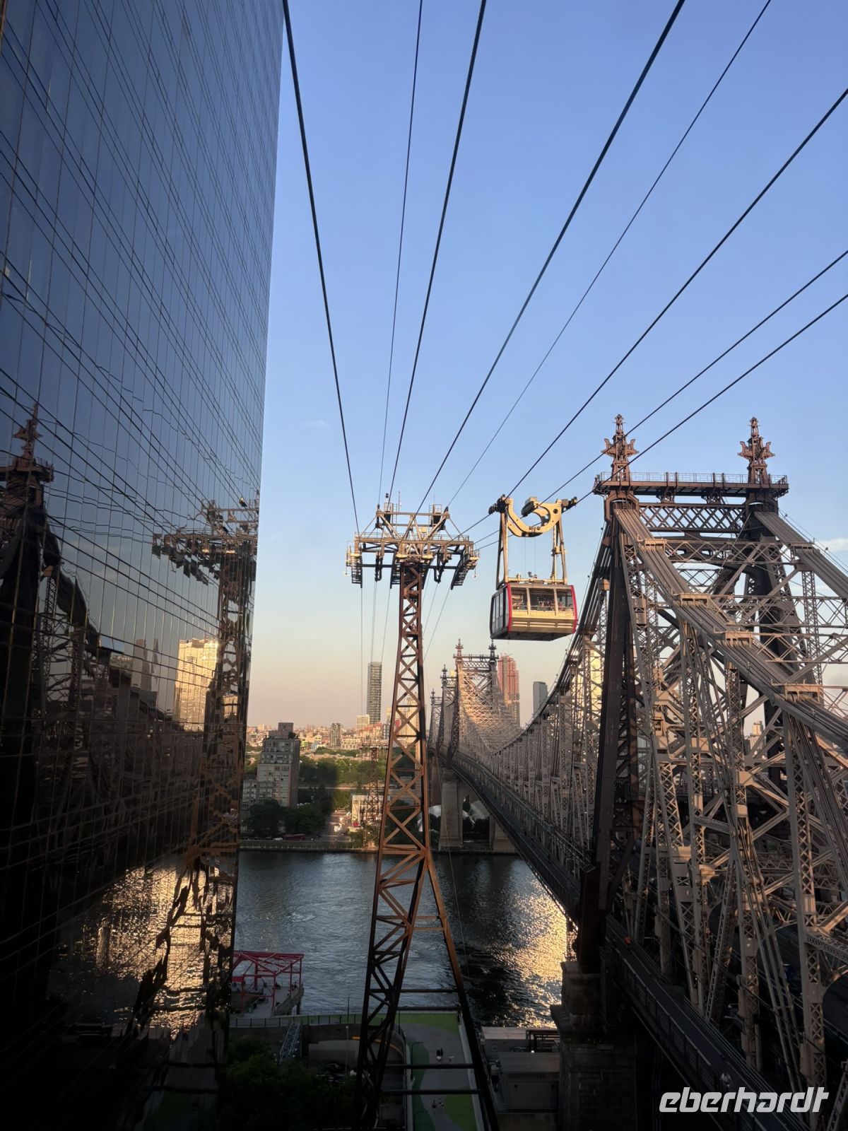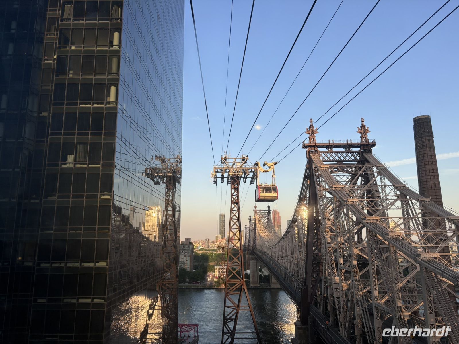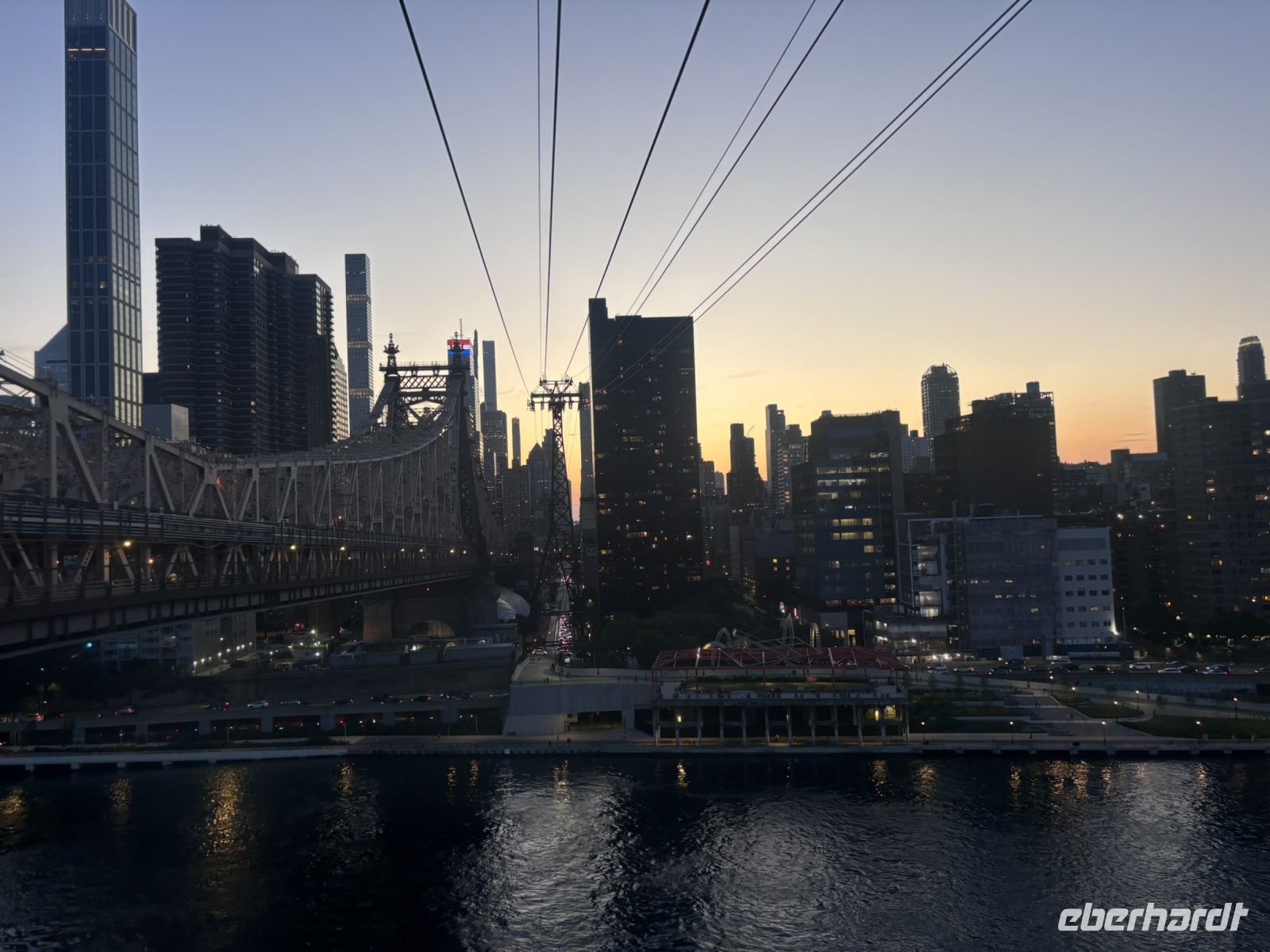Weiter ging es dann zur Roosevelt Island Tramway. Diese Seilbahn verbindet Manhattan mit Roosevelt Island. Roosevelt Island ist eine schmale Insel im East River zwischen Manhattan und Queens. Sie bietet ruhige Wohngebiete, Parks, einige Sehenswürdigkeiten und einen Blick auf die Skyline von Manhattan. Die Fahrt mit spektakulärem Blick auf den East River und die Skyline dauert 3 Minuten und ist eine hübsche Alternative zur U-Bahn. Zum Sonnenuntergang spazierten wir über die Promenade und beobachteten, wie die Sonne zwischen den Häuserschluchten unterging. Kurz nach Eintritt der Dämmerung fuhren wir mit der Seilbahn zurück nach Manhattan und hatten schöne Fotomotive von der Skyline und der Queensboro Brücke.