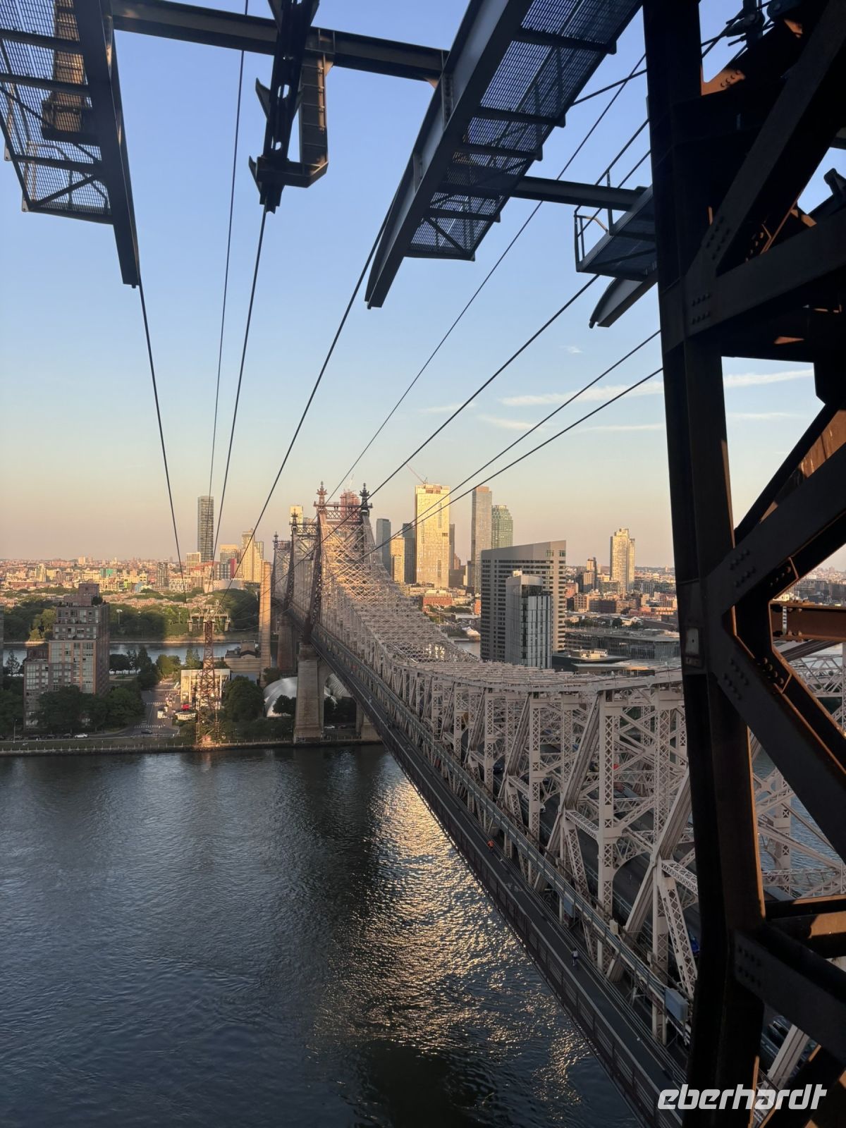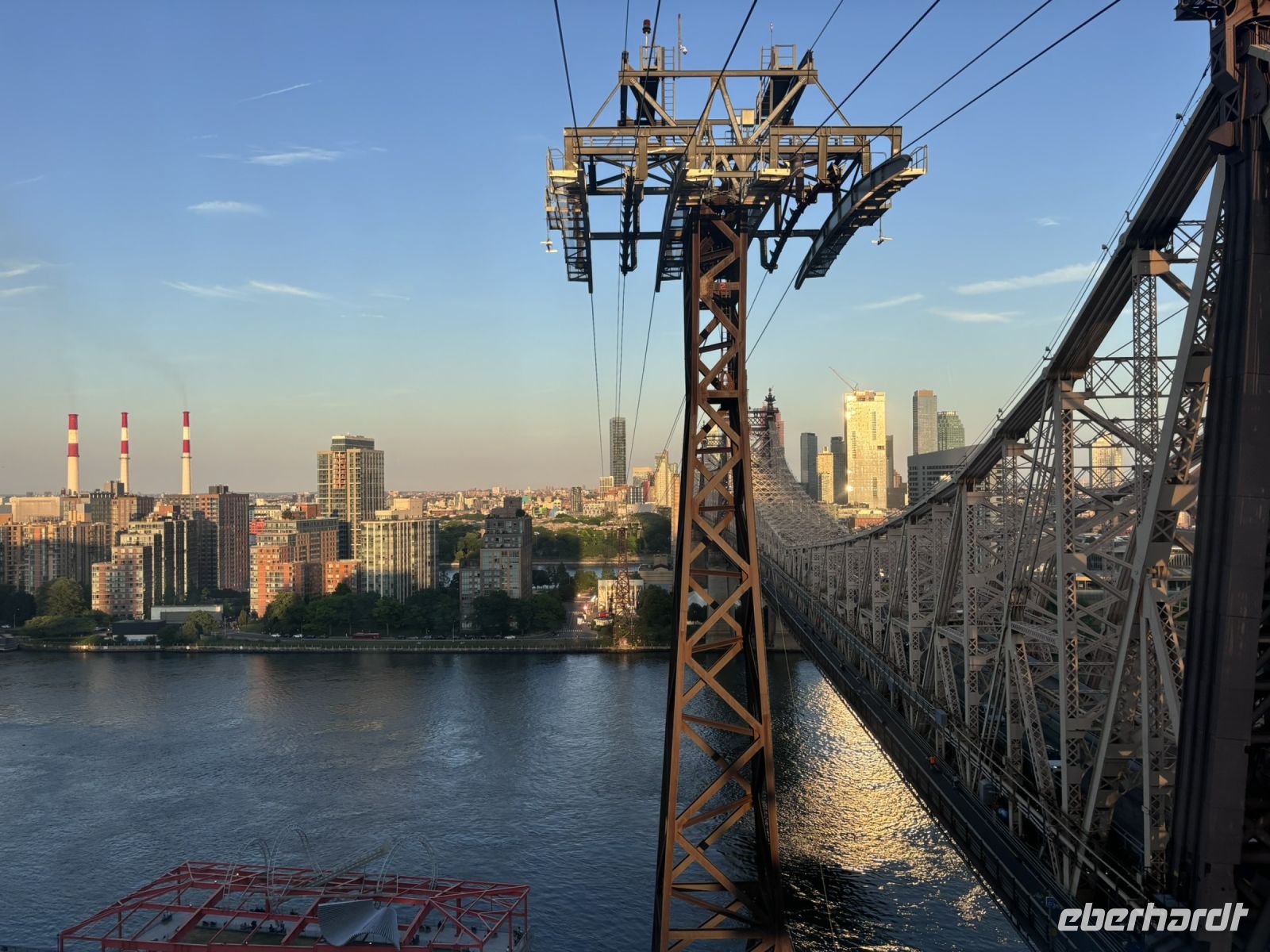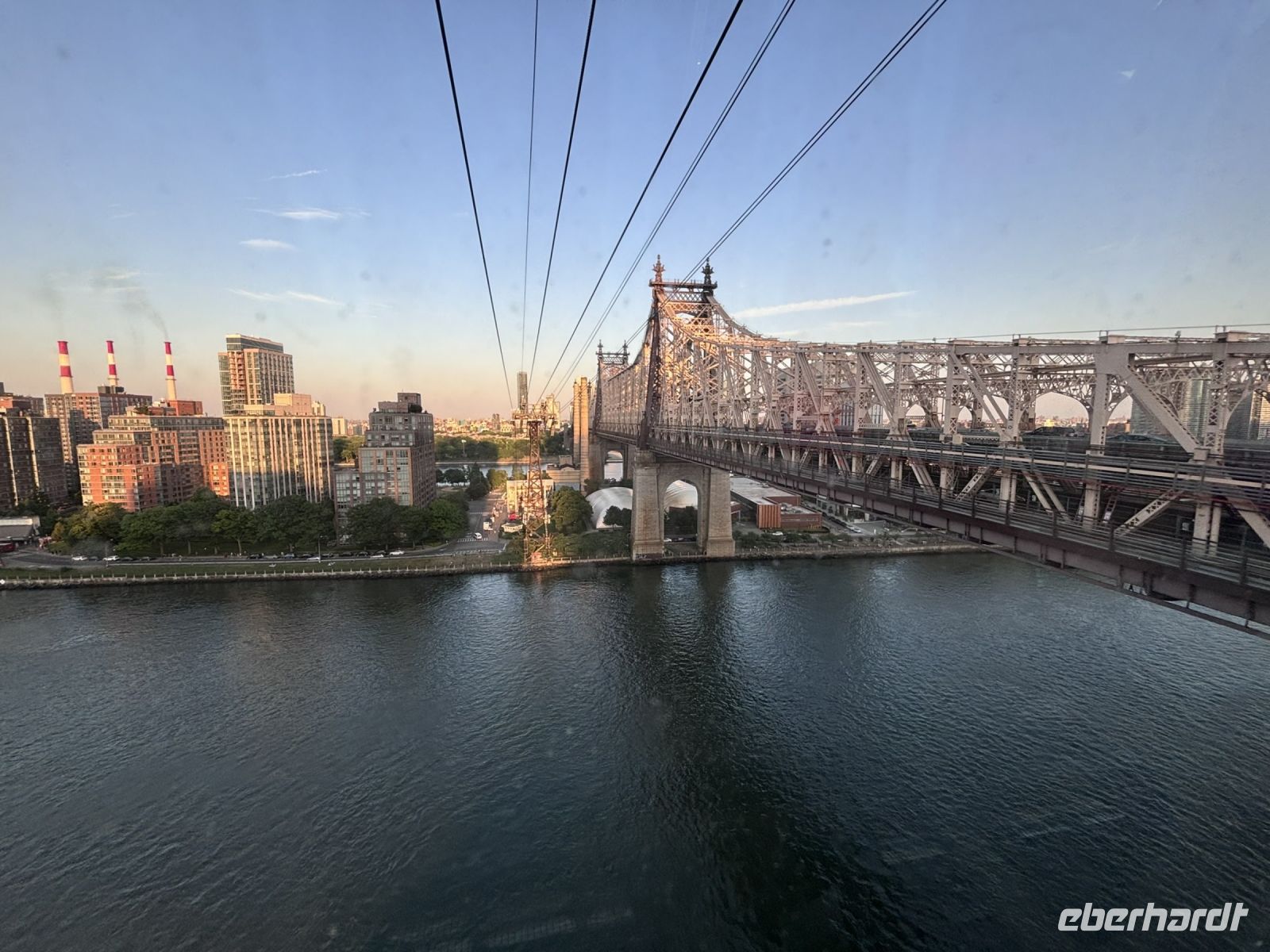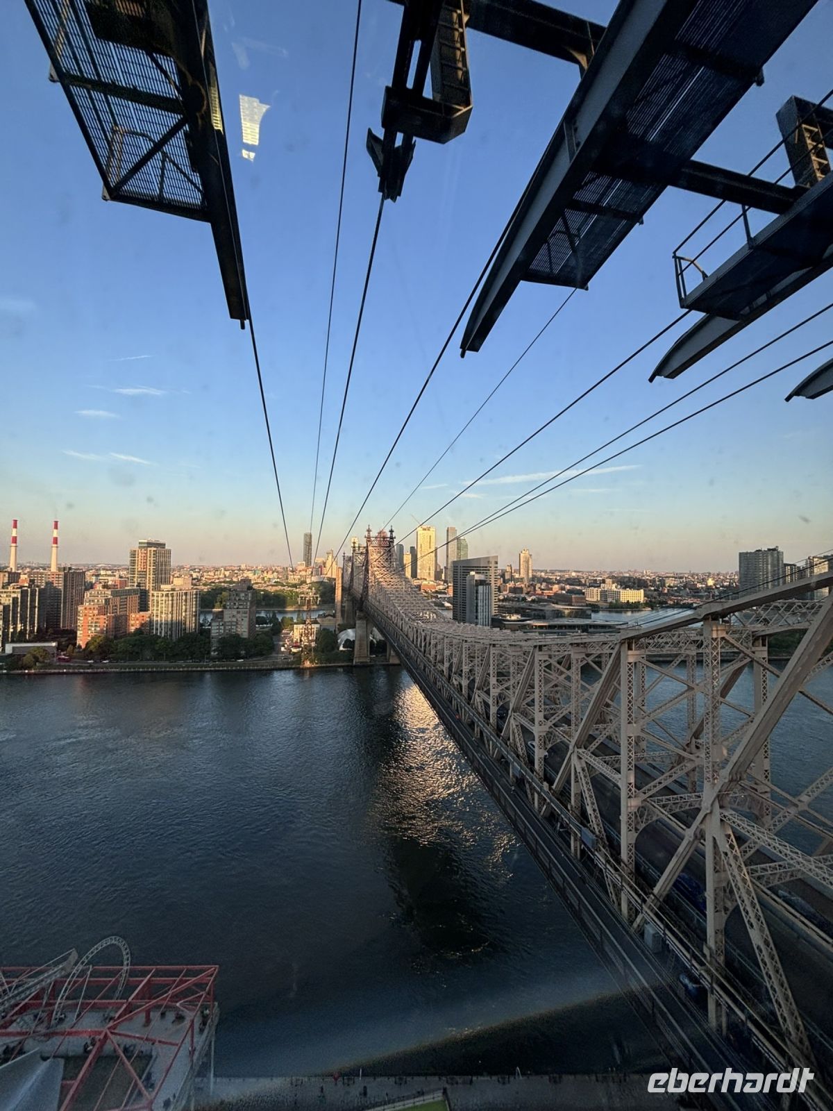 Weiter ging es dann zur Roosevelt Island Tramway. Diese Seilbahn verbindet Manhattan mit Roosevelt Island. Roosevelt Island ist eine schmale Insel im East River zwischen Manhattan und Queens. Sie bietet ruhige Wohngebiete, Parks, einige Sehenswürdigkeiten und einen Blick auf die Skyline von Manhattan. Die Fahrt mit spektakulärem Blick auf den East River und die Skyline dauert 3 Minuten und ist eine hübsche Alternative zur U-Bahn. Zum Sonnenuntergang spazierten wir über die Promenade und beobachteten, wie die Sonne zwischen den Häuserschluchten unterging. Kurz nach Eintritt der Dämmerung fuhren wir mit der Seilbahn zurück nach Manhattan und hatten schöne Fotomotive von der Skyline und der Queensboro Brücke.