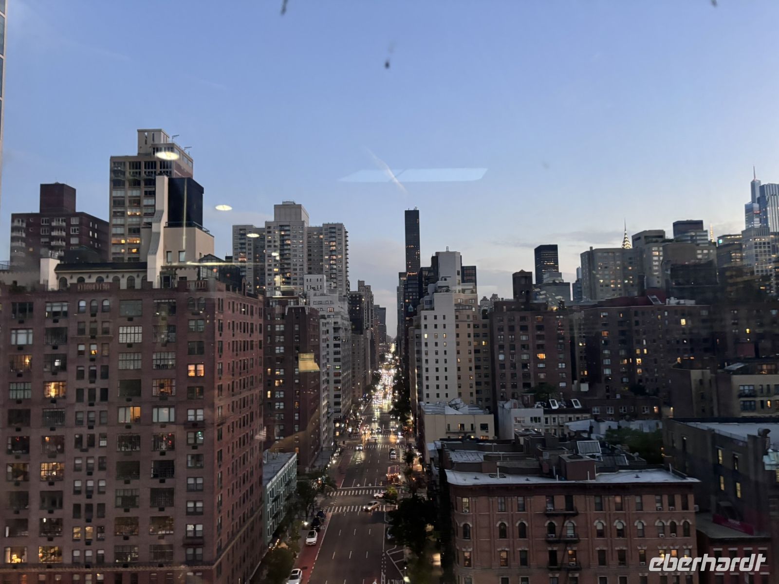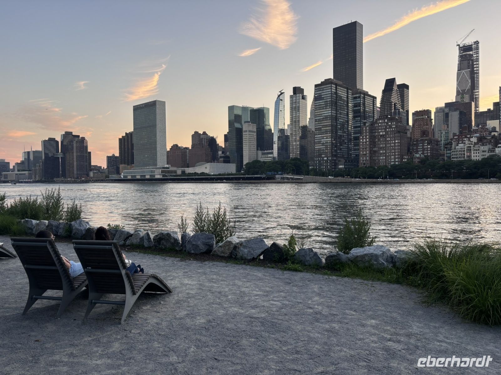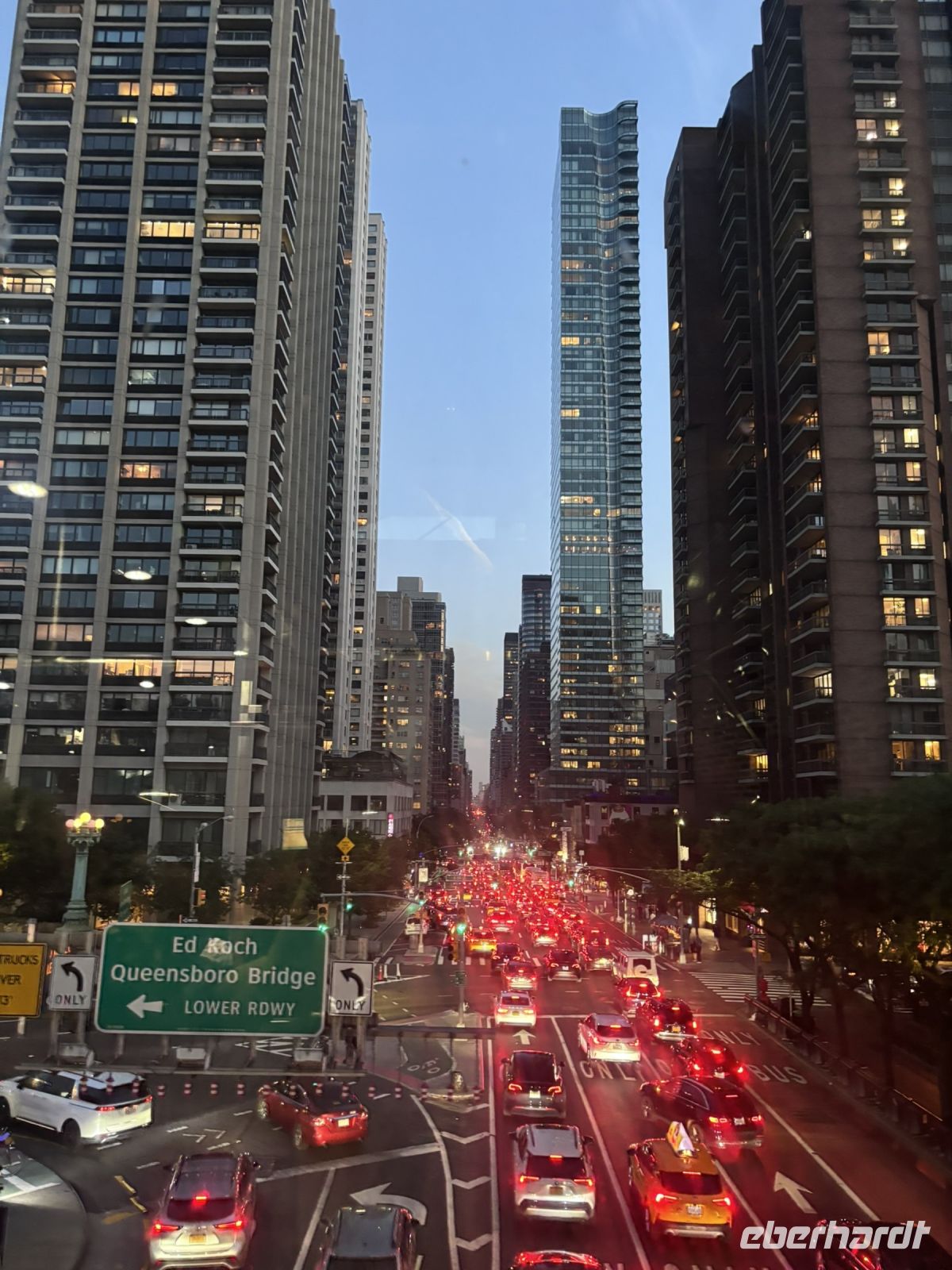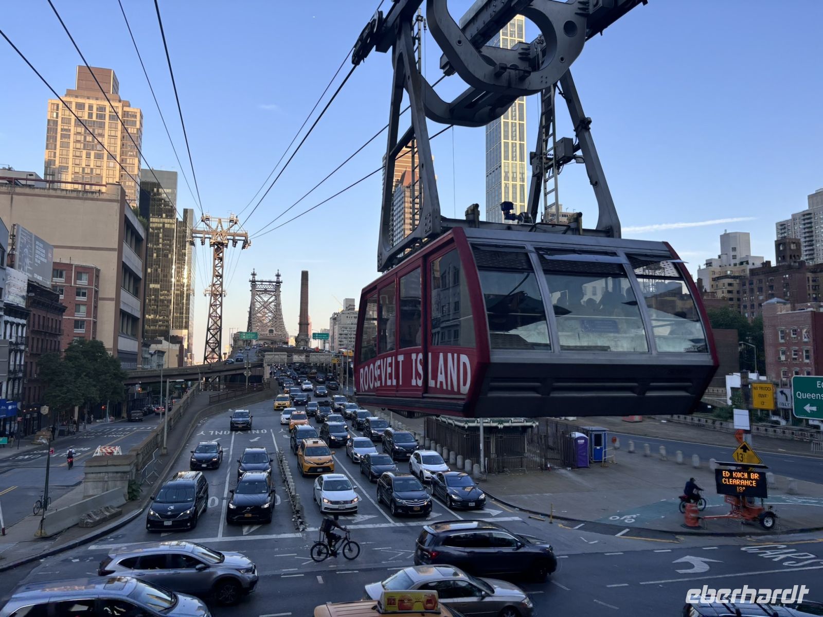 Weiter ging es dann zur Roosevelt Island Tramway. Diese Seilbahn verbindet Manhattan mit Roosevelt Island. Roosevelt Island ist eine schmale Insel im East River zwischen Manhattan und Queens. Sie bietet ruhige Wohngebiete, Parks, einige Sehenswürdigkeiten und einen Blick auf die Skyline von Manhattan. Die Fahrt mit spektakulärem Blick auf den East River und die Skyline dauert 3 Minuten und ist eine hübsche Alternative zur U-Bahn. Zum Sonnenuntergang spazierten wir über die Promenade und beobachteten, wie die Sonne zwischen den Häuserschluchten unterging. Kurz nach Eintritt der Dämmerung fuhren wir mit der Seilbahn zurück nach Manhattan und hatten schöne Fotomotive von der Skyline und der Queensboro Brücke.