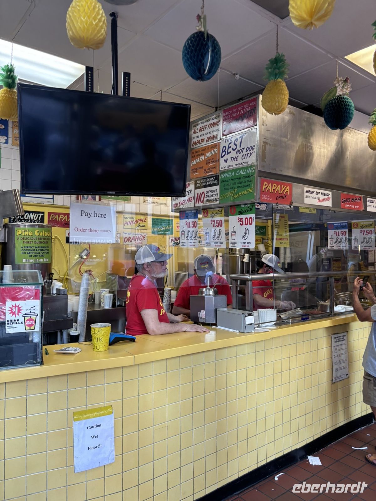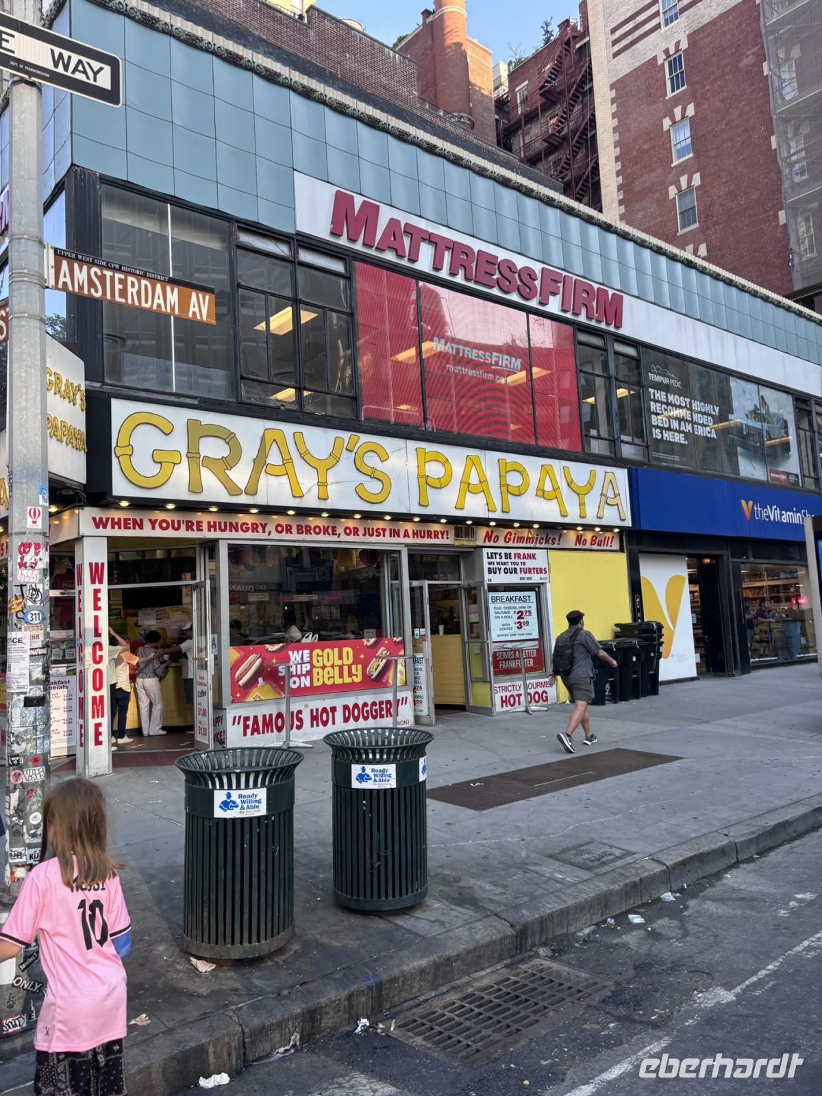 Aber es gibt sie trotzdem noch, die original New Yorker Hot Dogs – und zwar im Gray’s Papaya. Diesen Laden gibt es seit den 1970er Jahren und ist mittlerweile DIE Institution für Hot Dogs in New York. Wir bestellten uns alle Hot Dogs mit unseren Wunschtoppings, wobei einige von uns sogar zwei Stück genossen.
